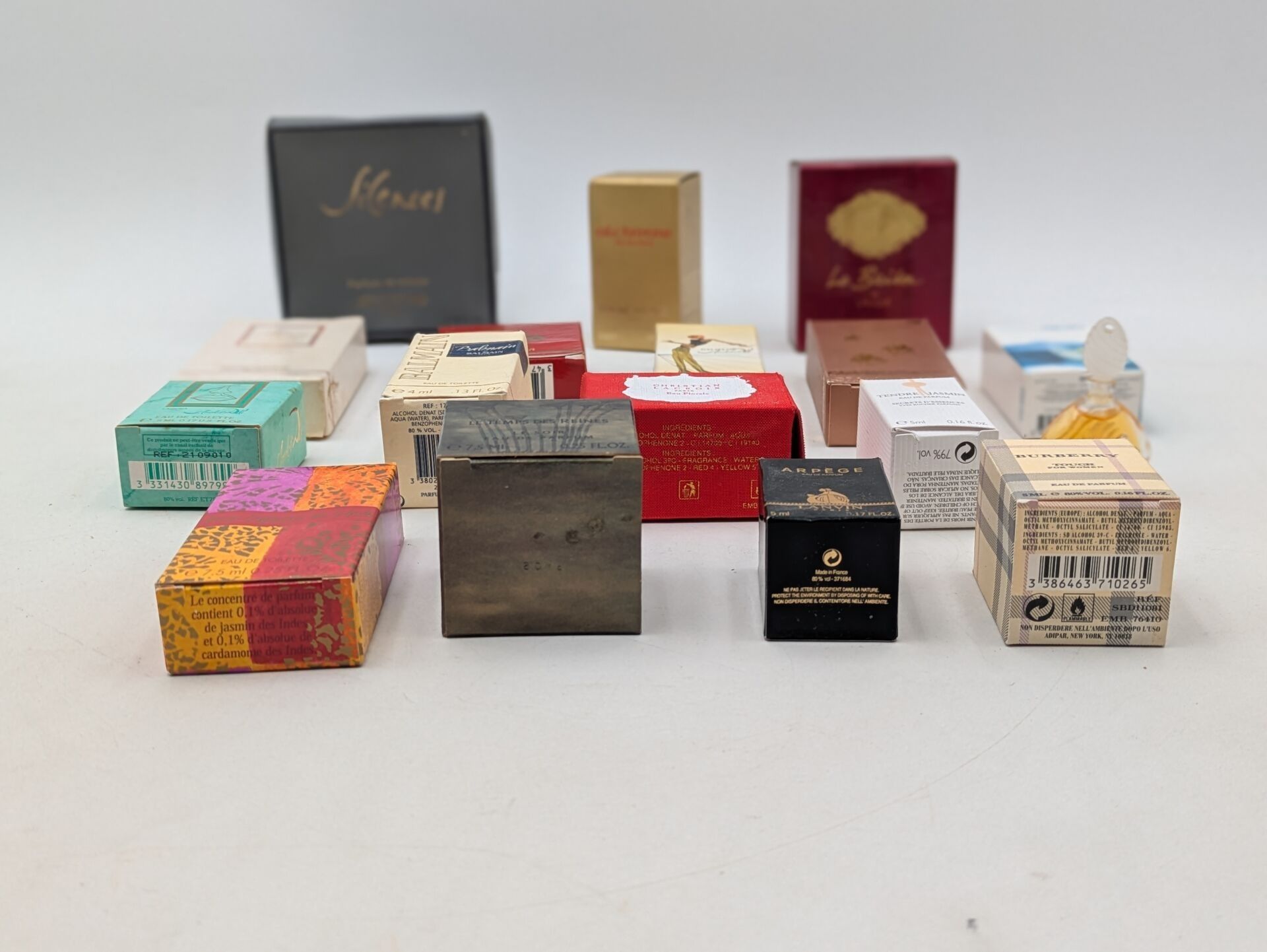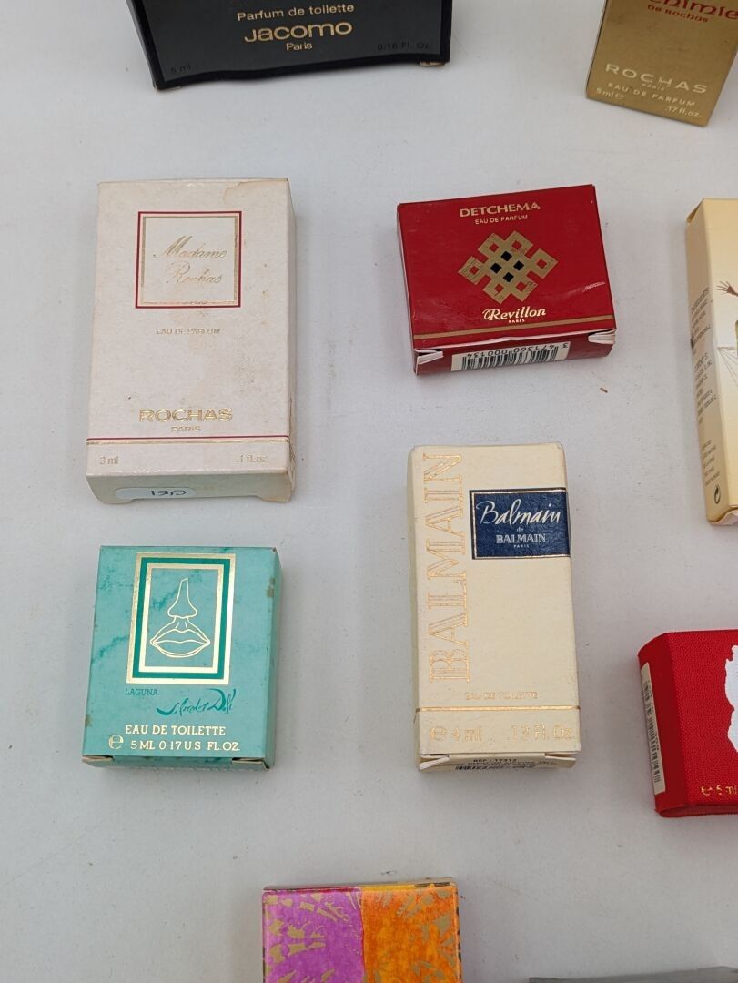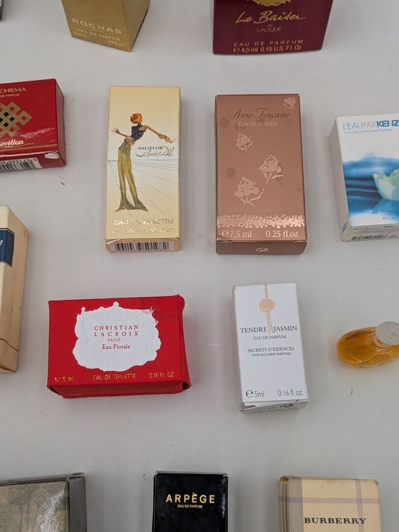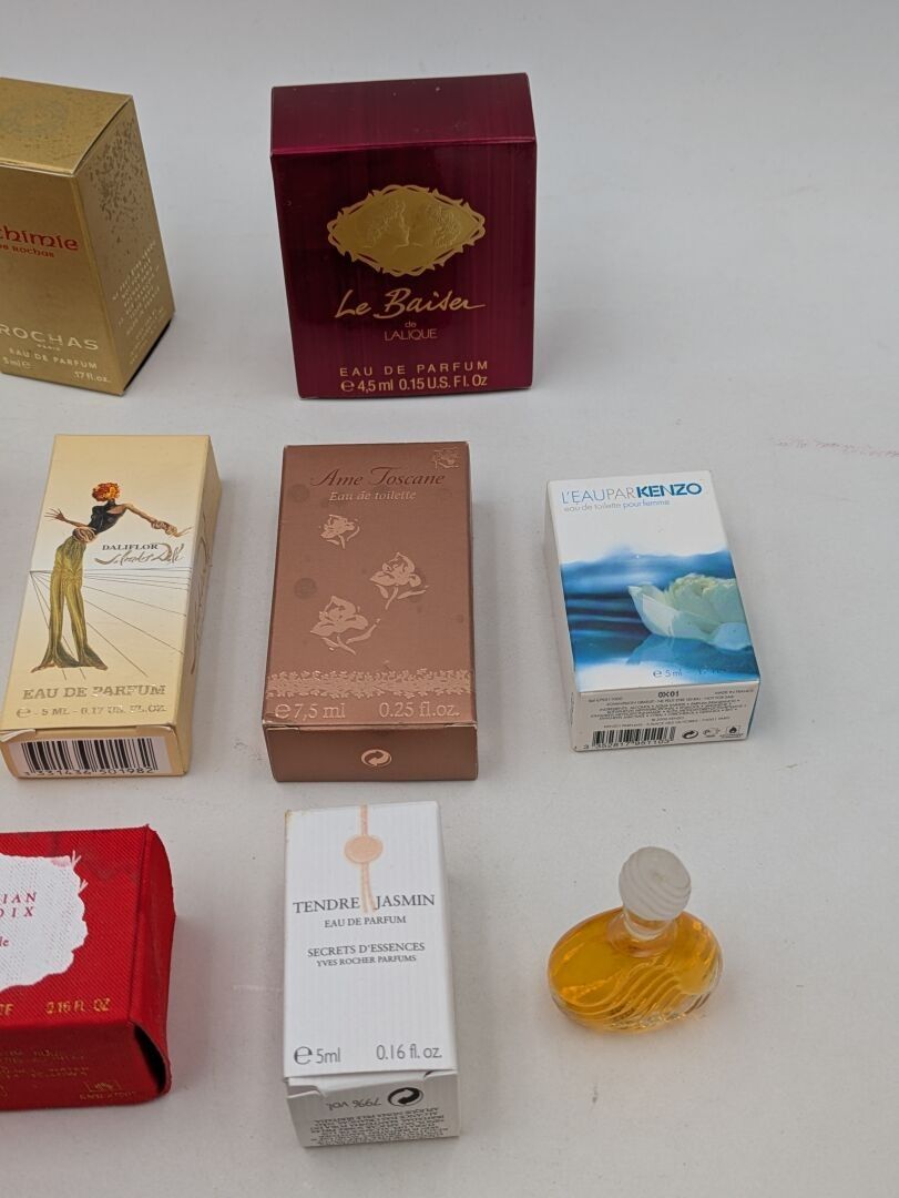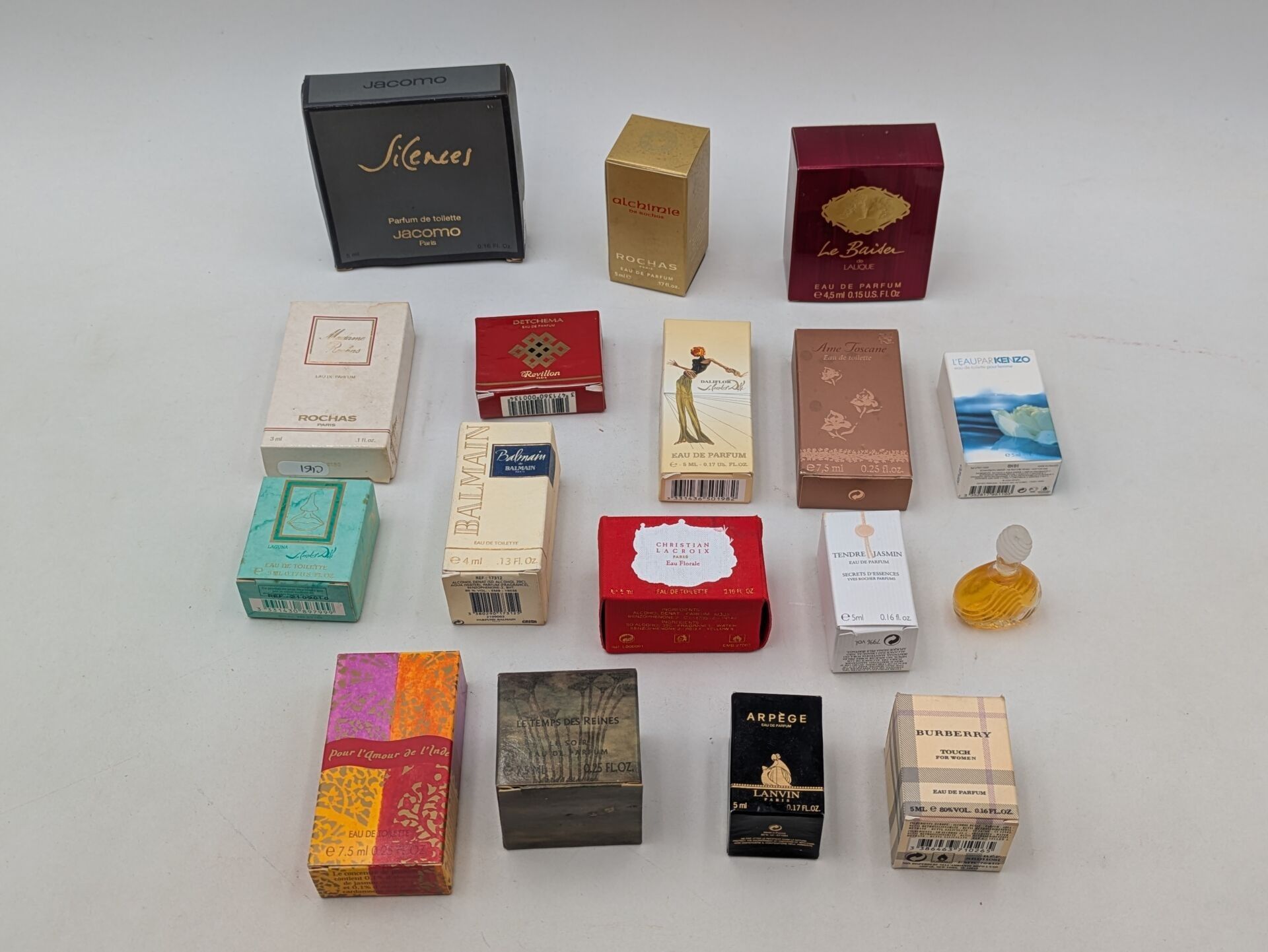 Réunion de parfums miniatures de différentes marques dont : "Le Baiser" de Lalique, "L'eau" de Kenzo, "Eau Florale" de Christian Lacroix, Balmain, et divers.