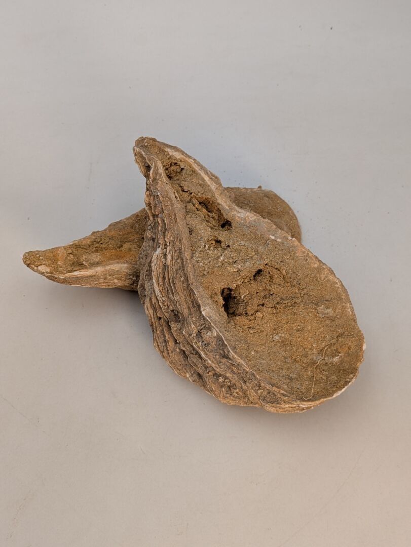 Huitre de mer fossilisée. Dimensions : 8 x 22,5 x 10.5 cm.