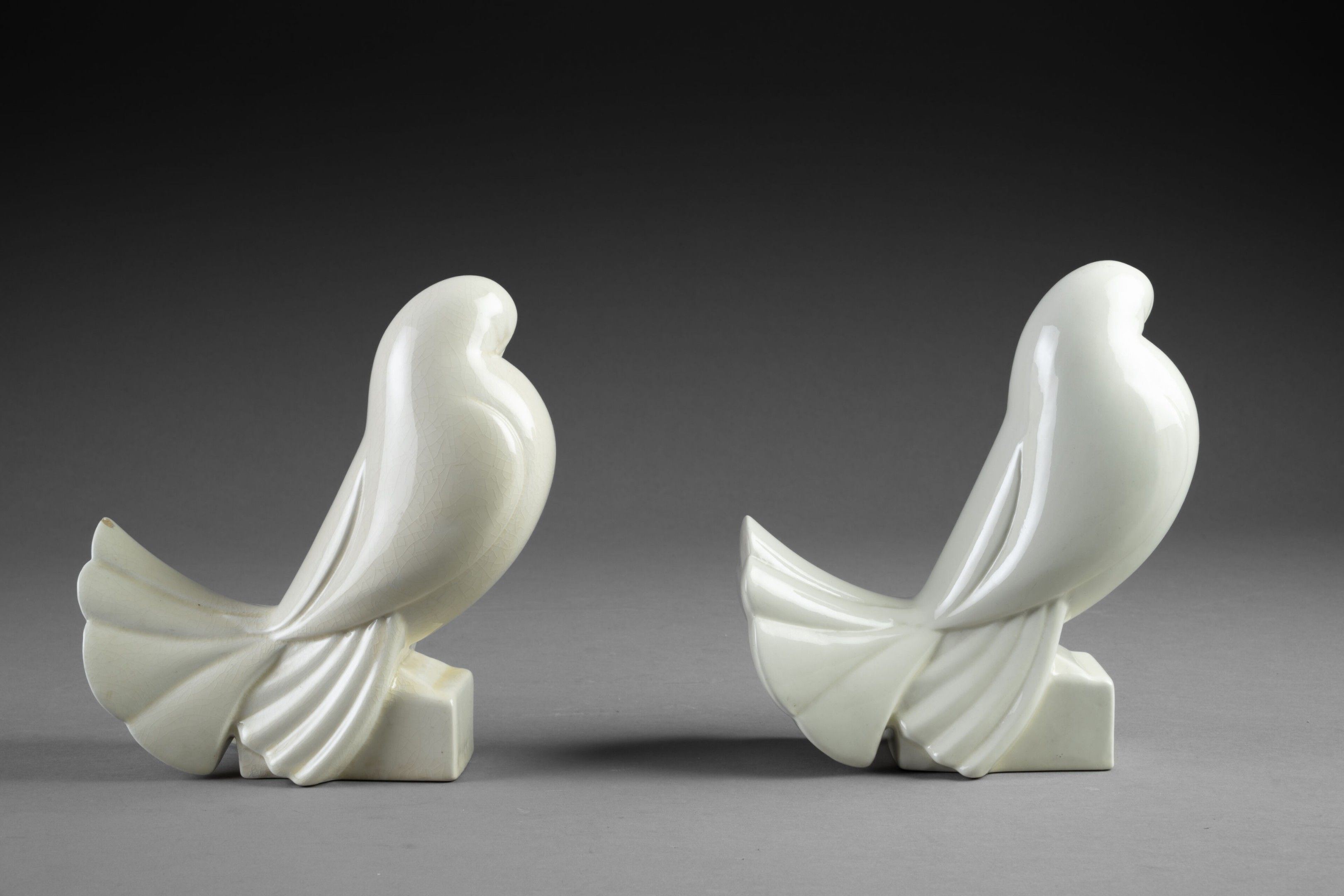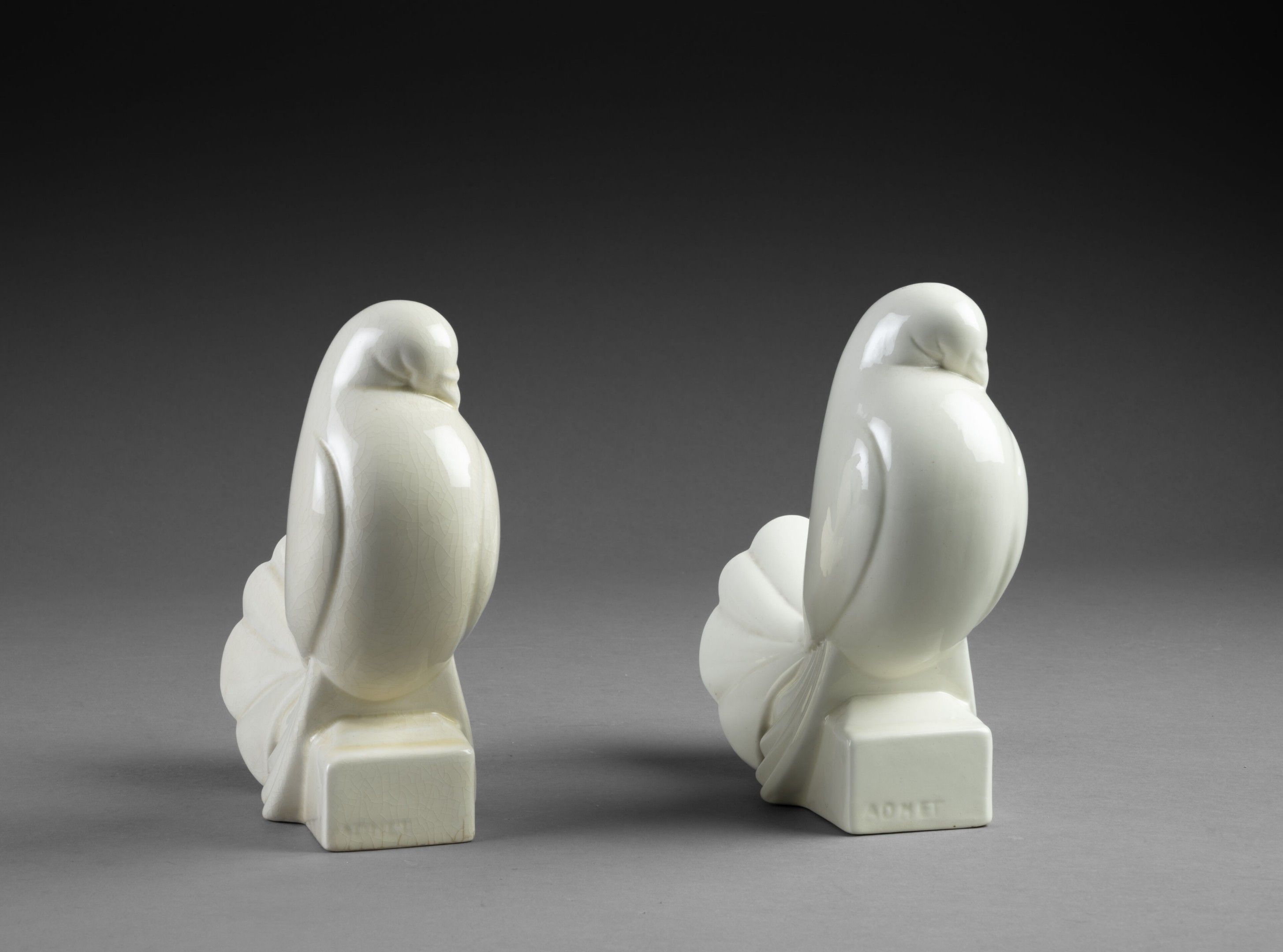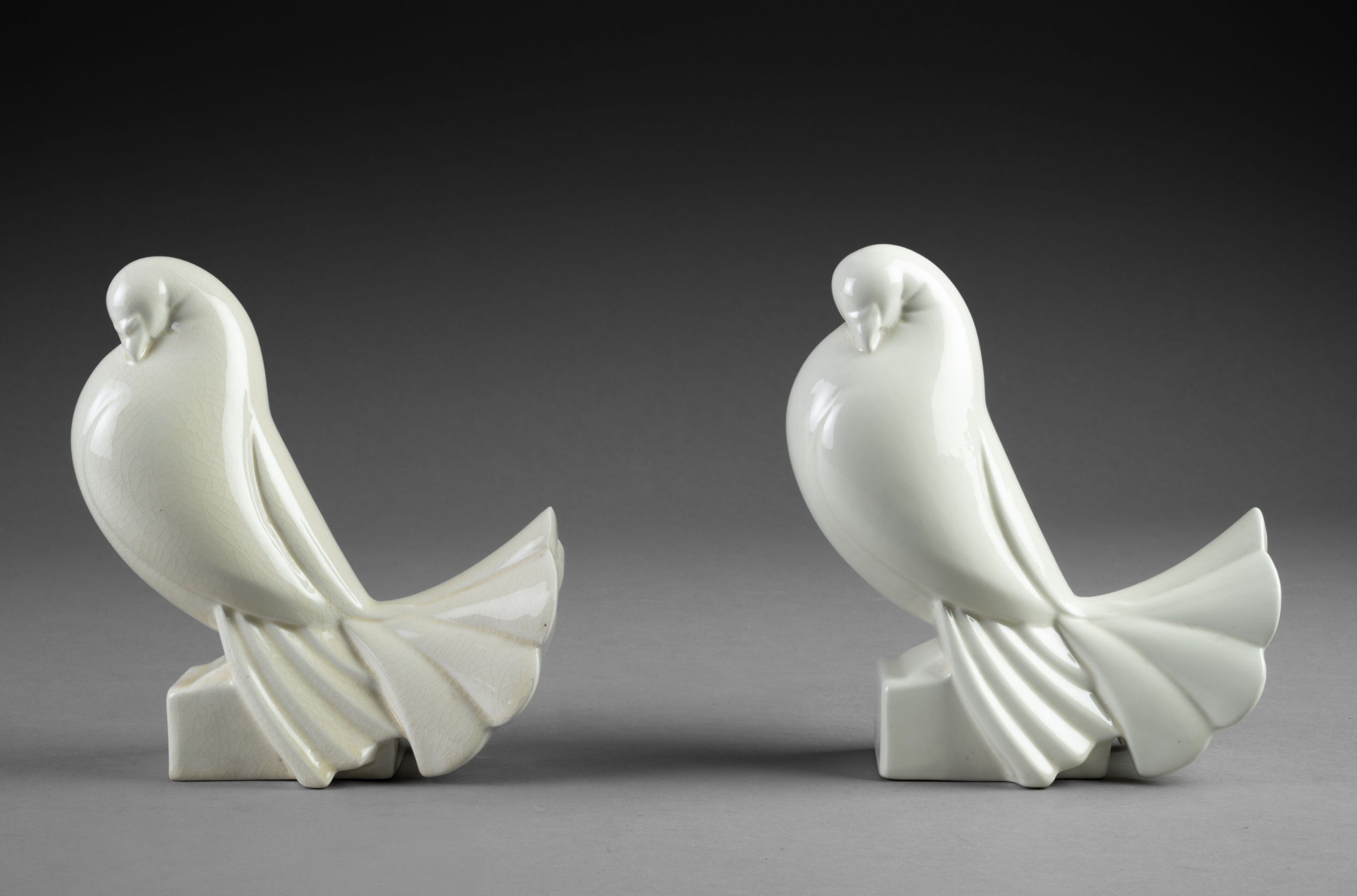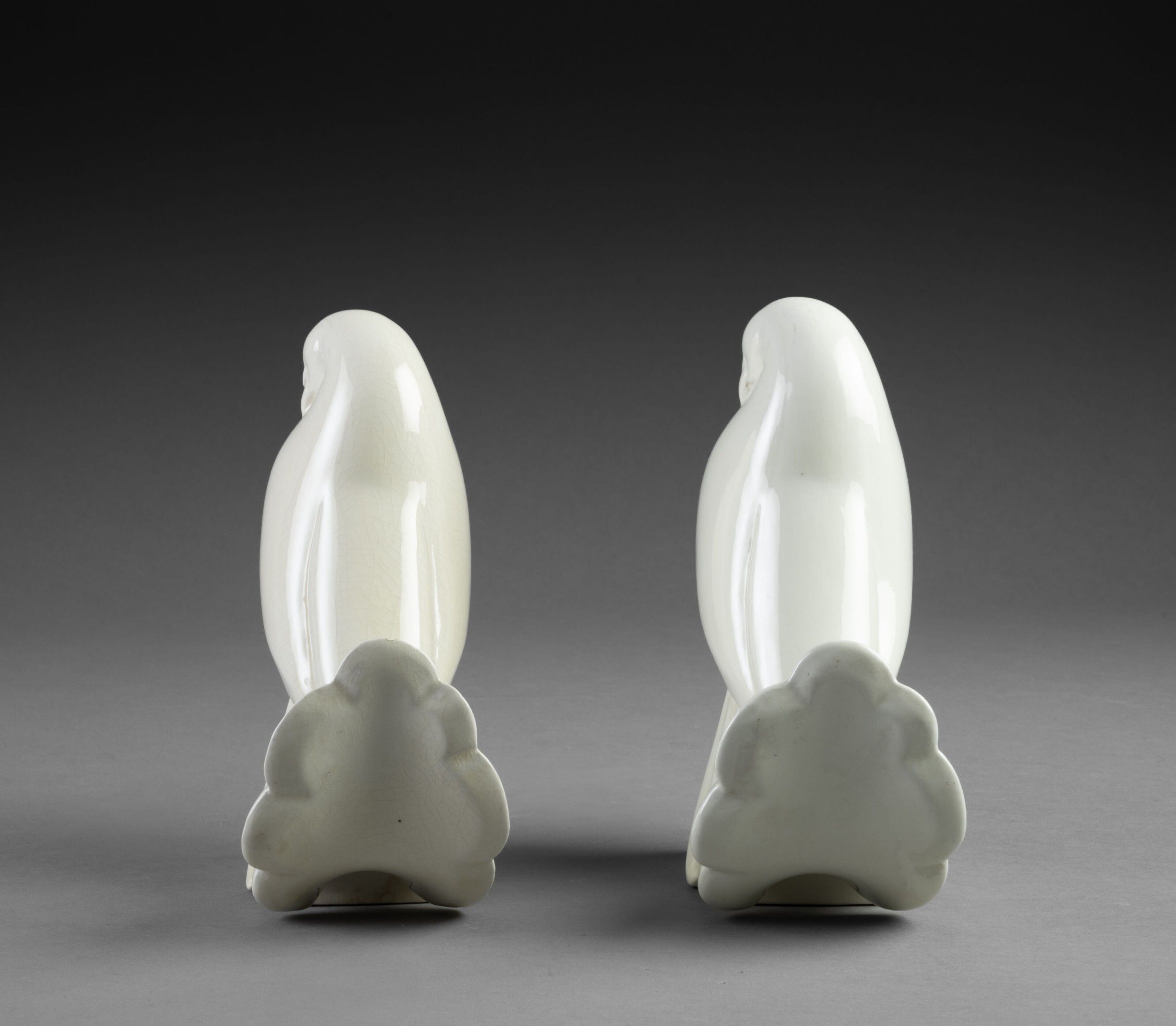 Deux épreuves au modèle en céramique émaillée blanc crème craquelée (une petite restauration à la queue d'une des deux).