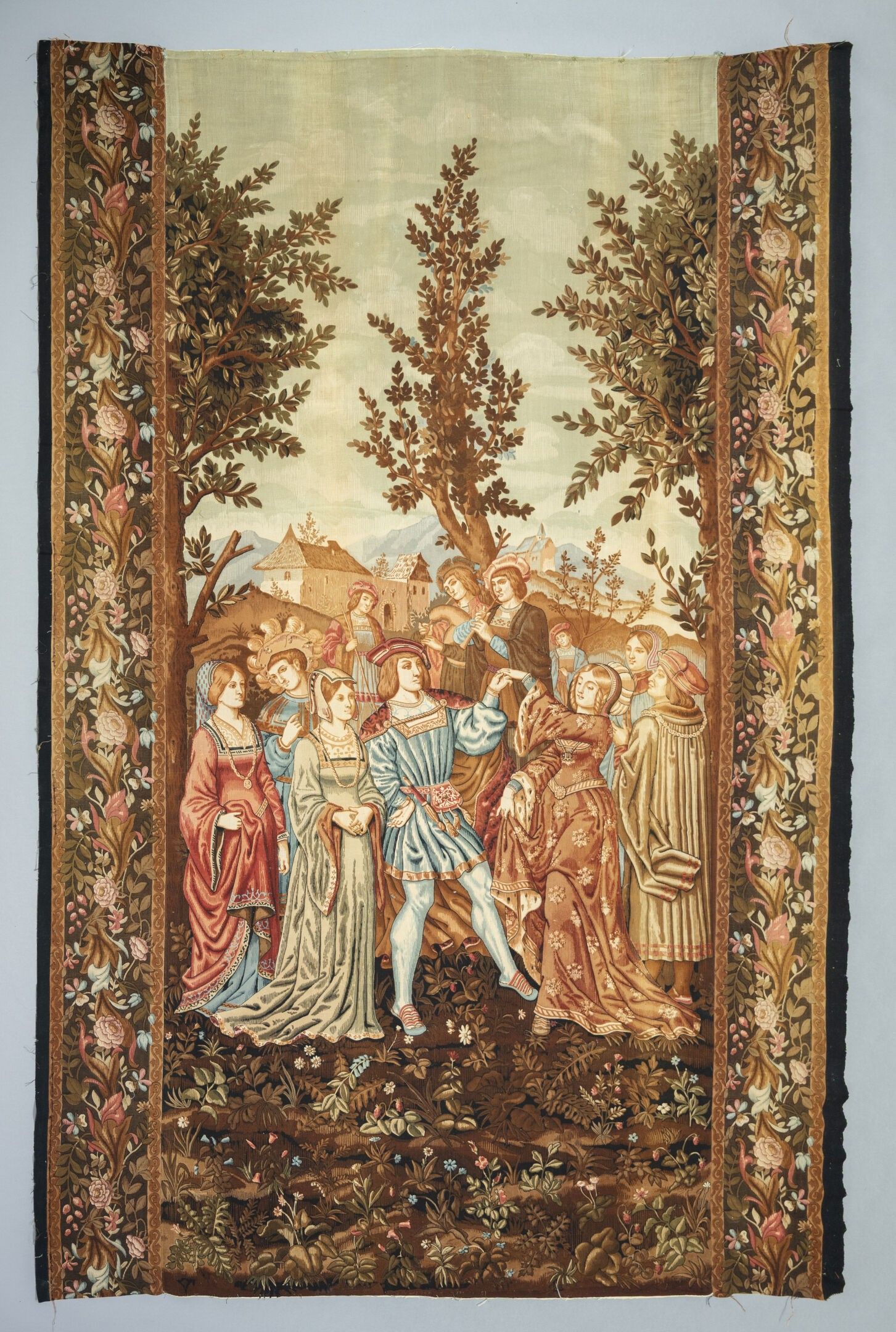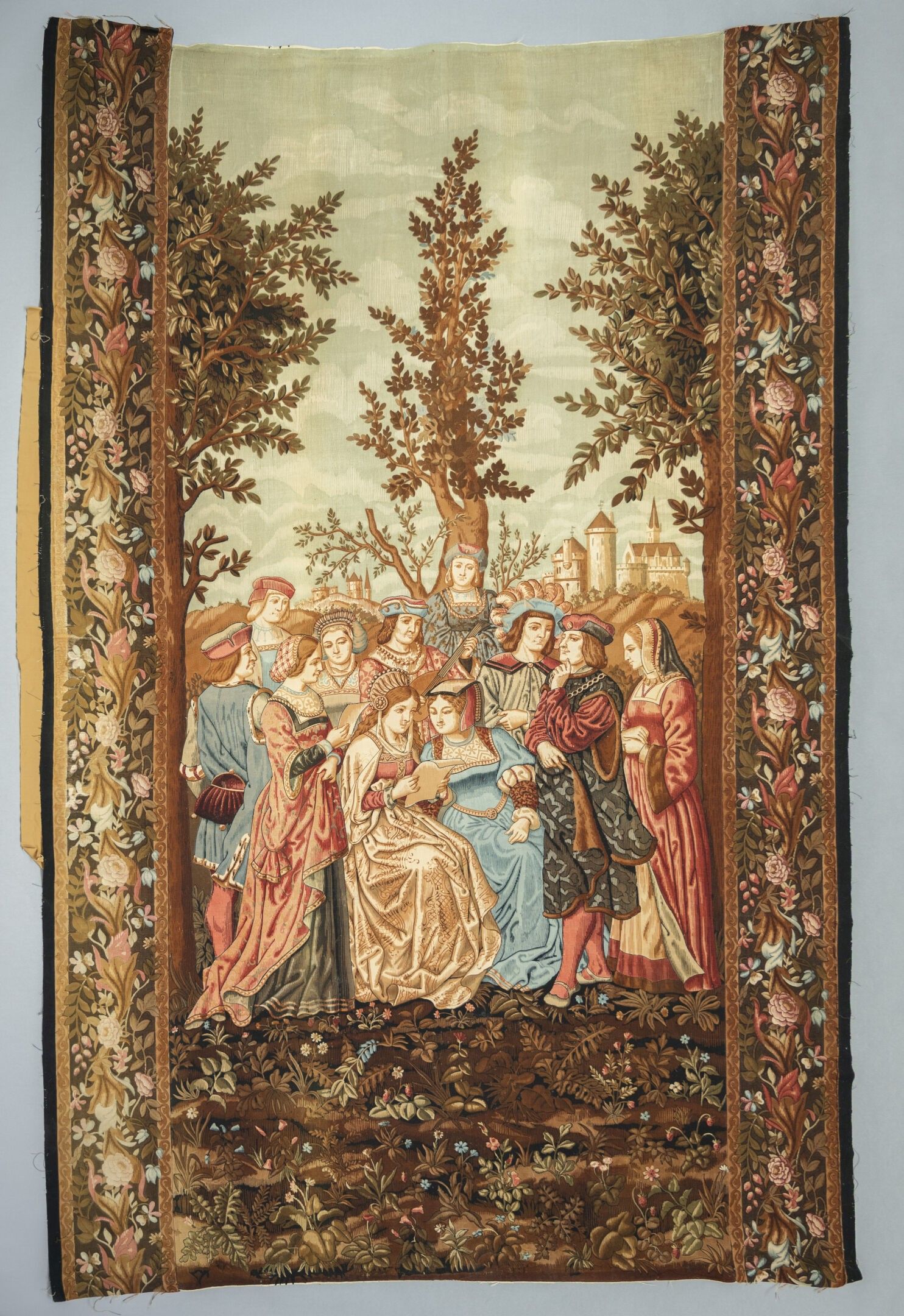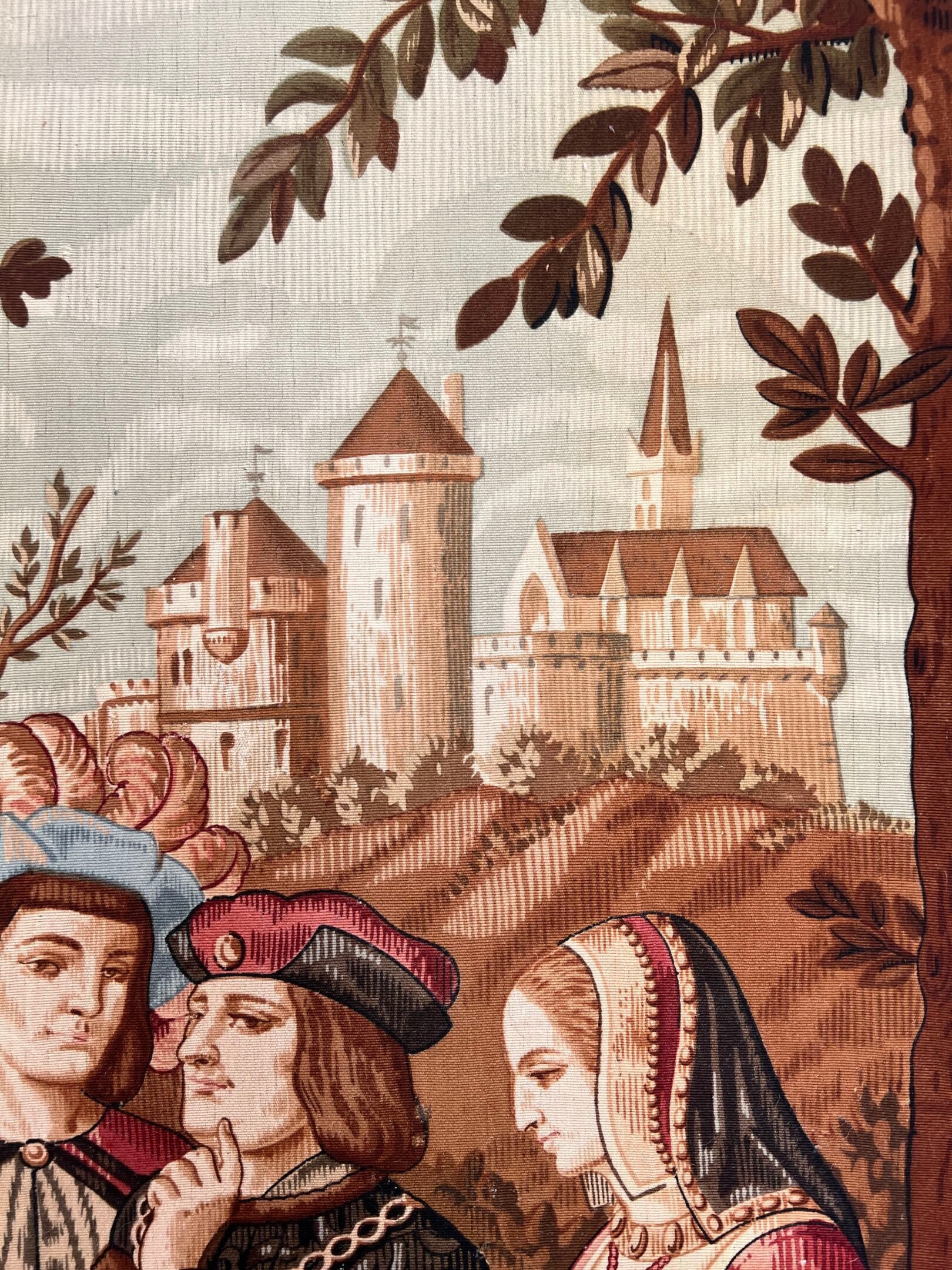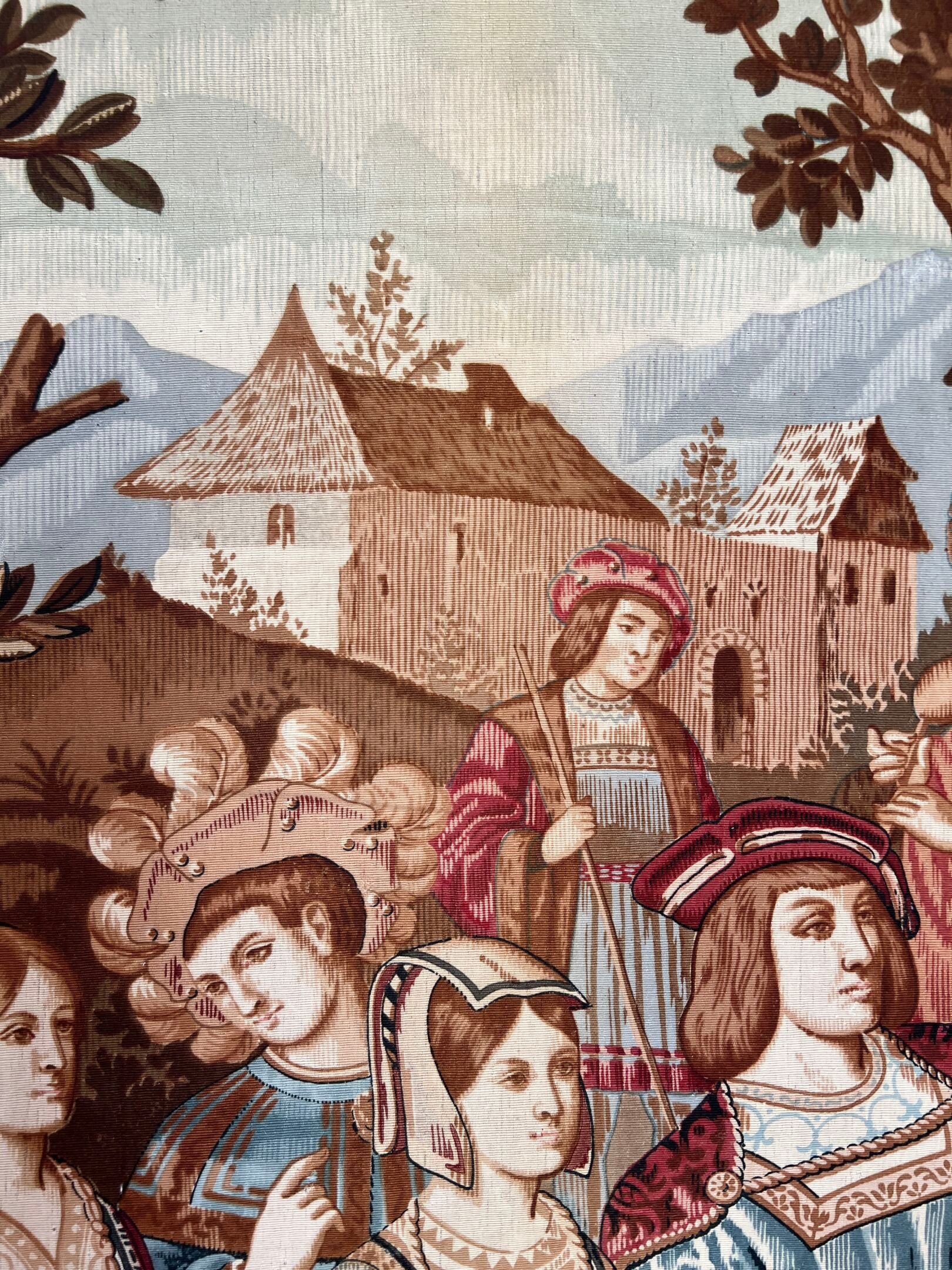 tapisserie mécanique laine imprimée à la planche de bois dans une vive polychromie, décor de scènes de cour animées de nombreux personnages sur un parterre mille-fleurs ; au second plan un château et une église et la montagne dans le lointain. Bordures montantes aux rinceaux de fleurs et feuillage, bordures transversales coupées, (coloris frais, quelques petit trous), 287 x 182 cm RMH
