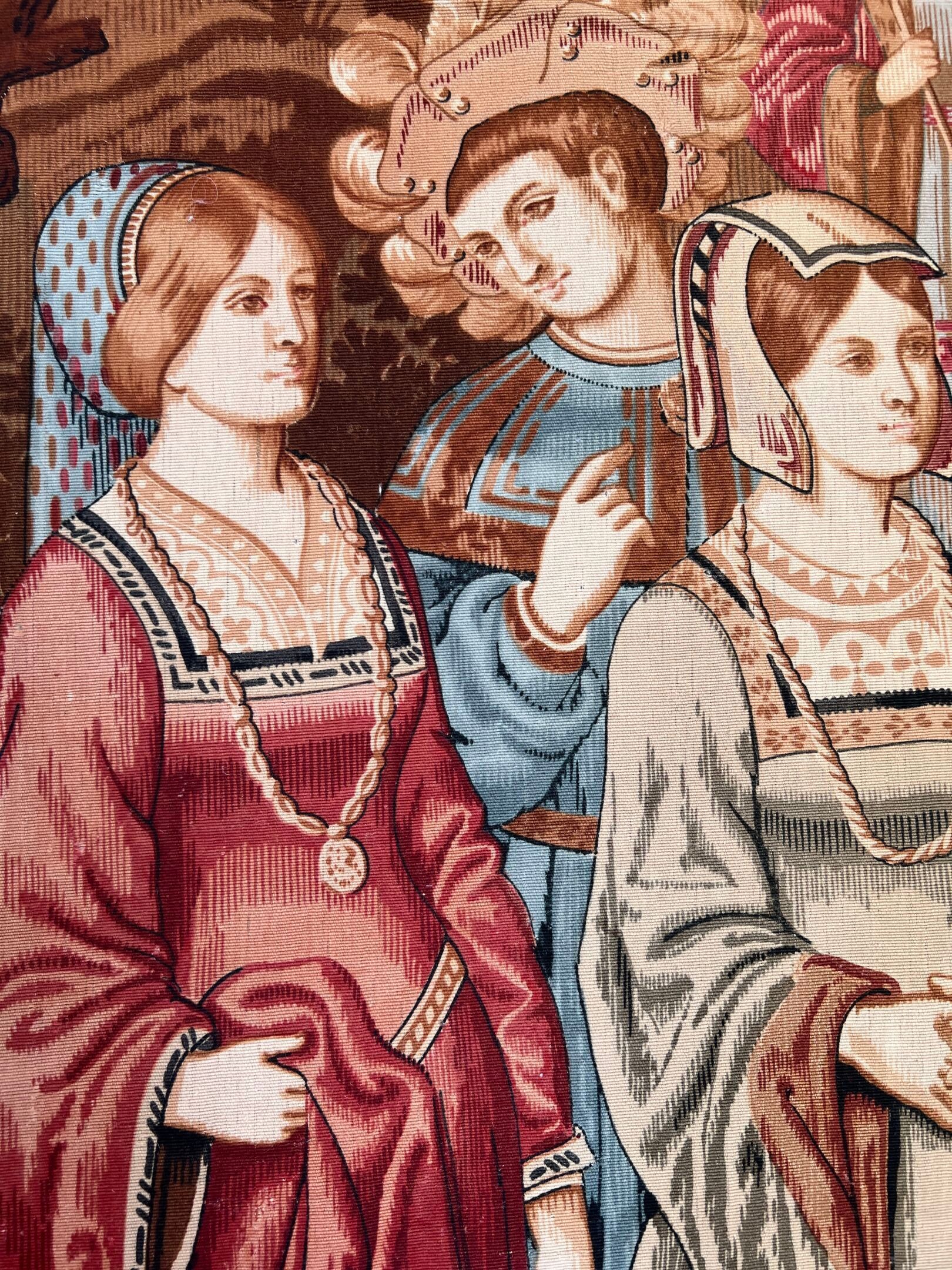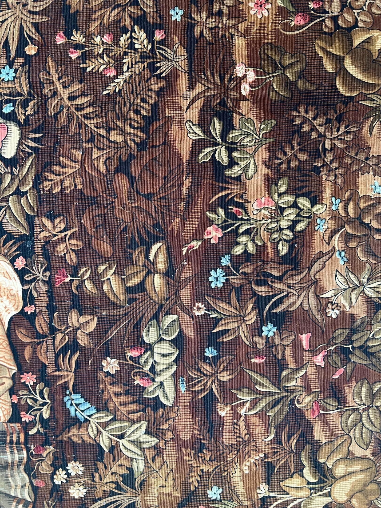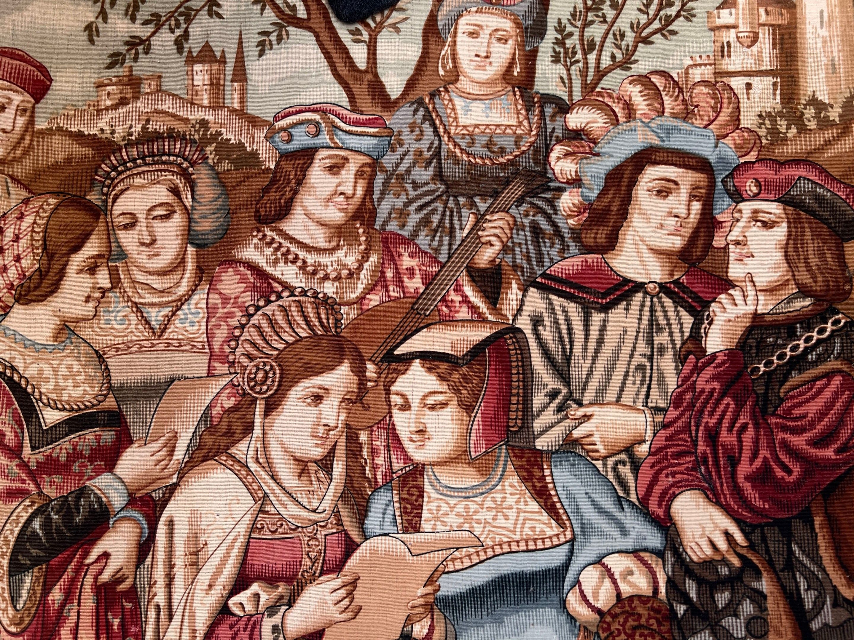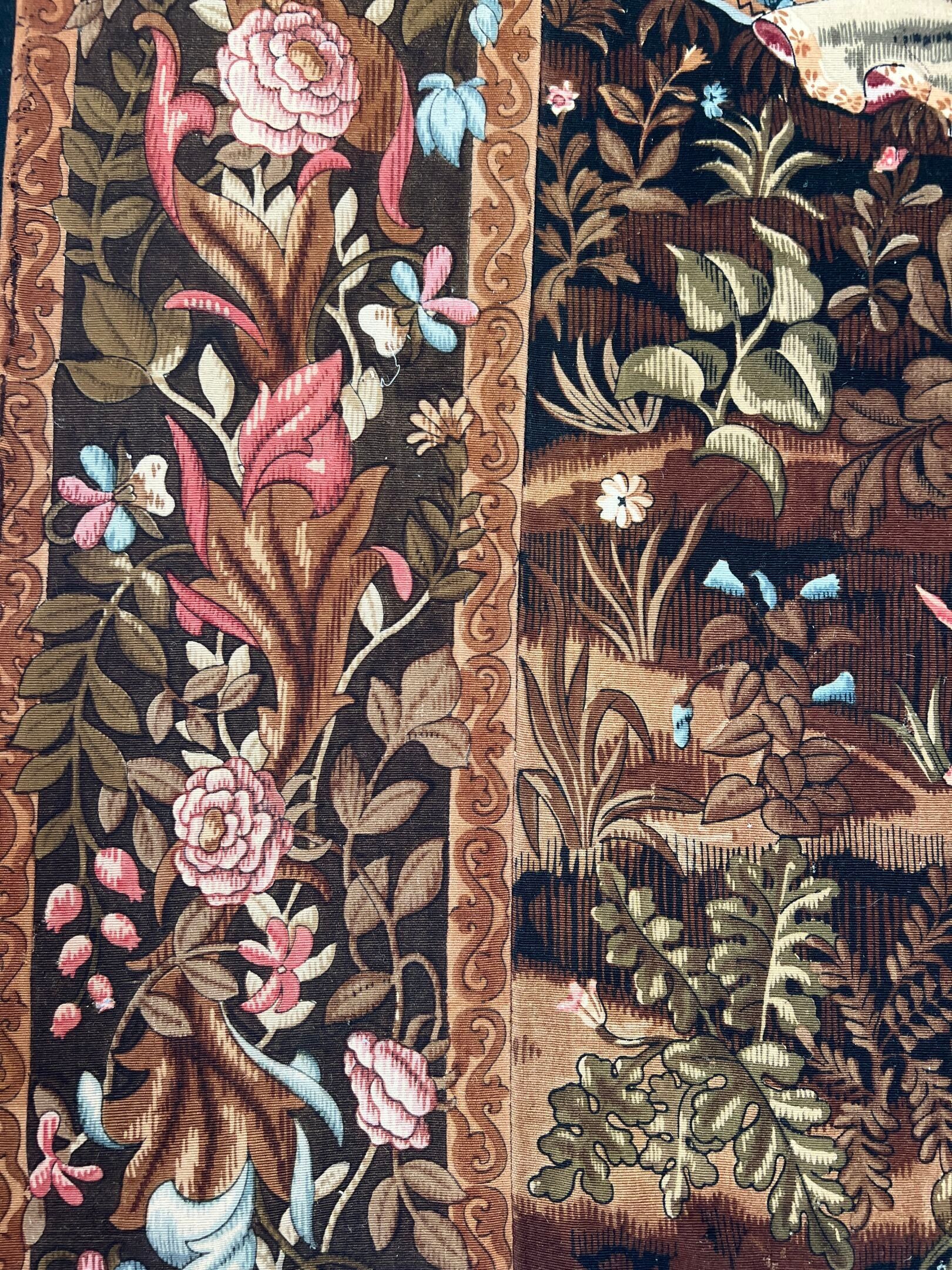 tapisserie mécanique laine imprimée à la planche de bois dans une vive polychromie, décor de scènes de cour animées de nombreux personnages sur un parterre mille-fleurs ; au second plan un château et une église et la montagne dans le lointain. Bordures montantes aux rinceaux de fleurs et feuillage, bordures transversales coupées, (coloris frais, quelques petit trous), 287 x 182 cm RMH