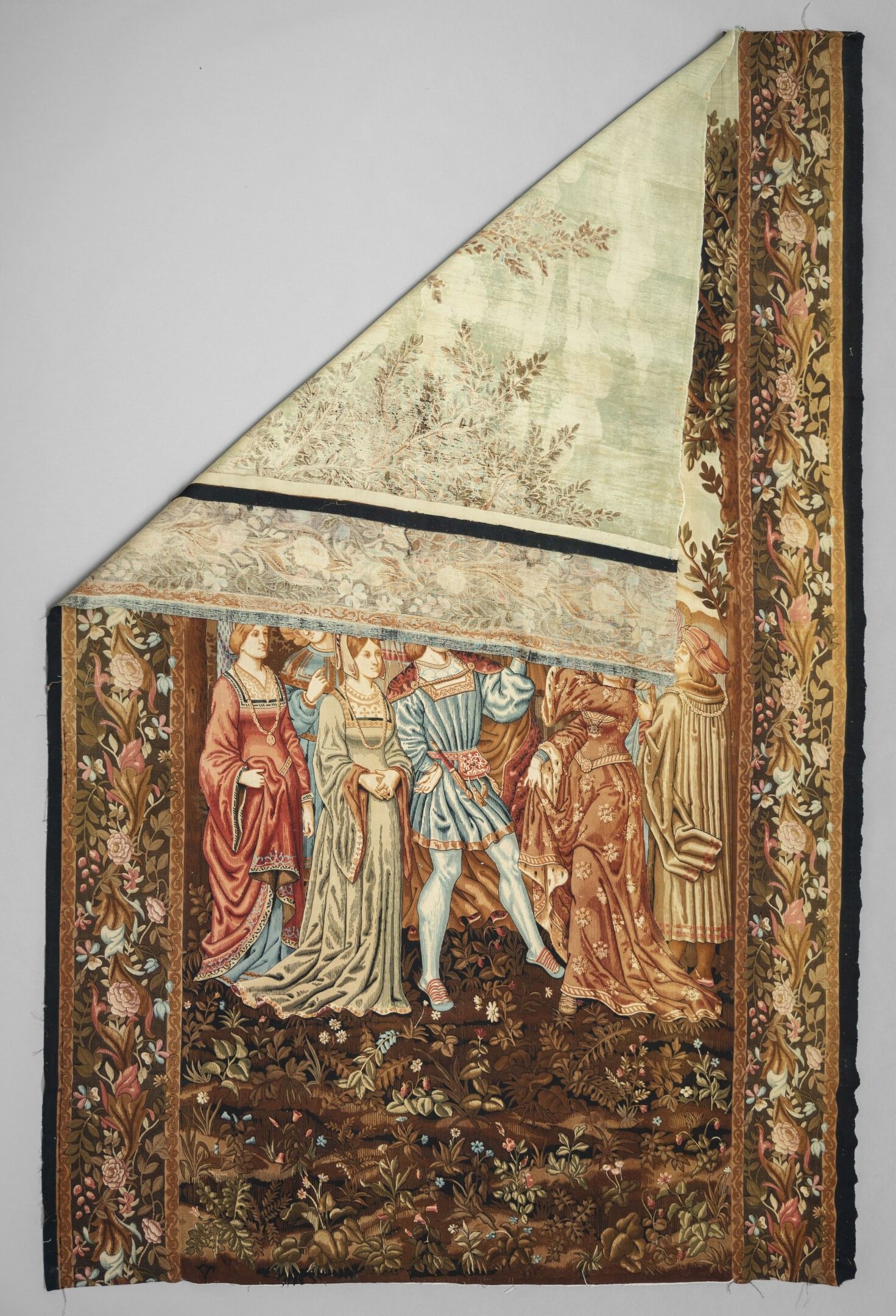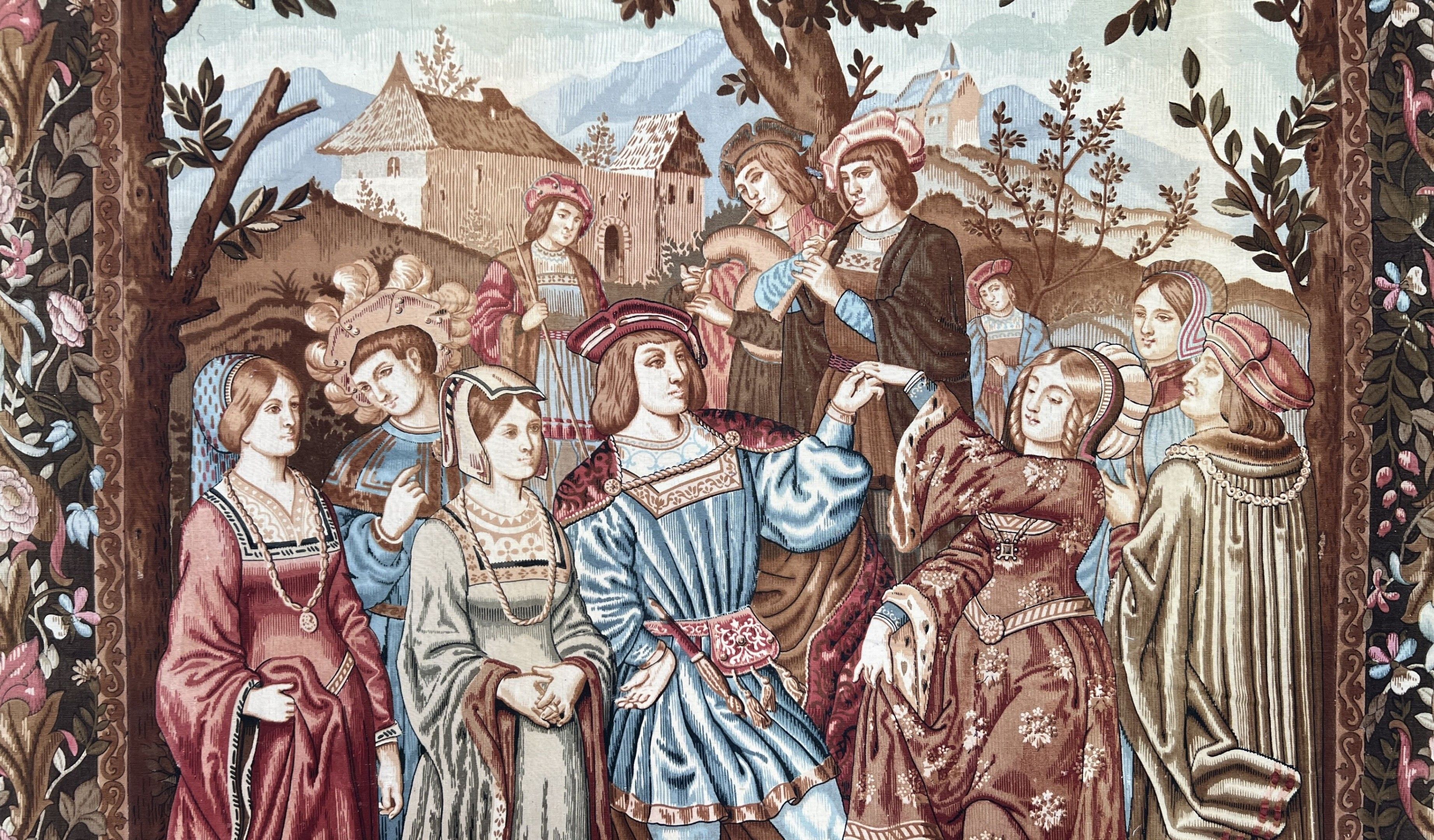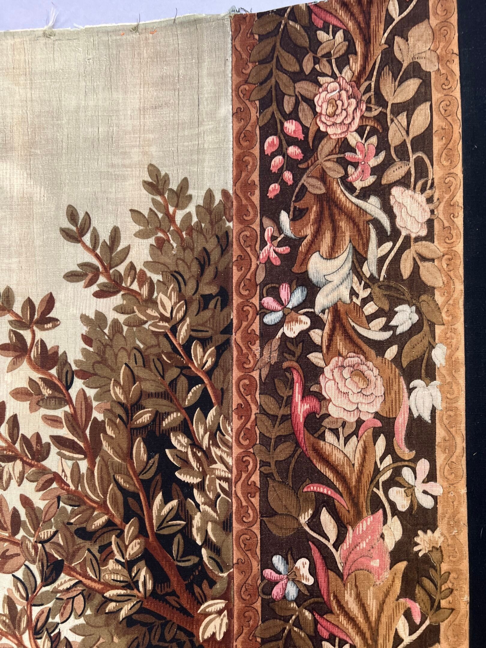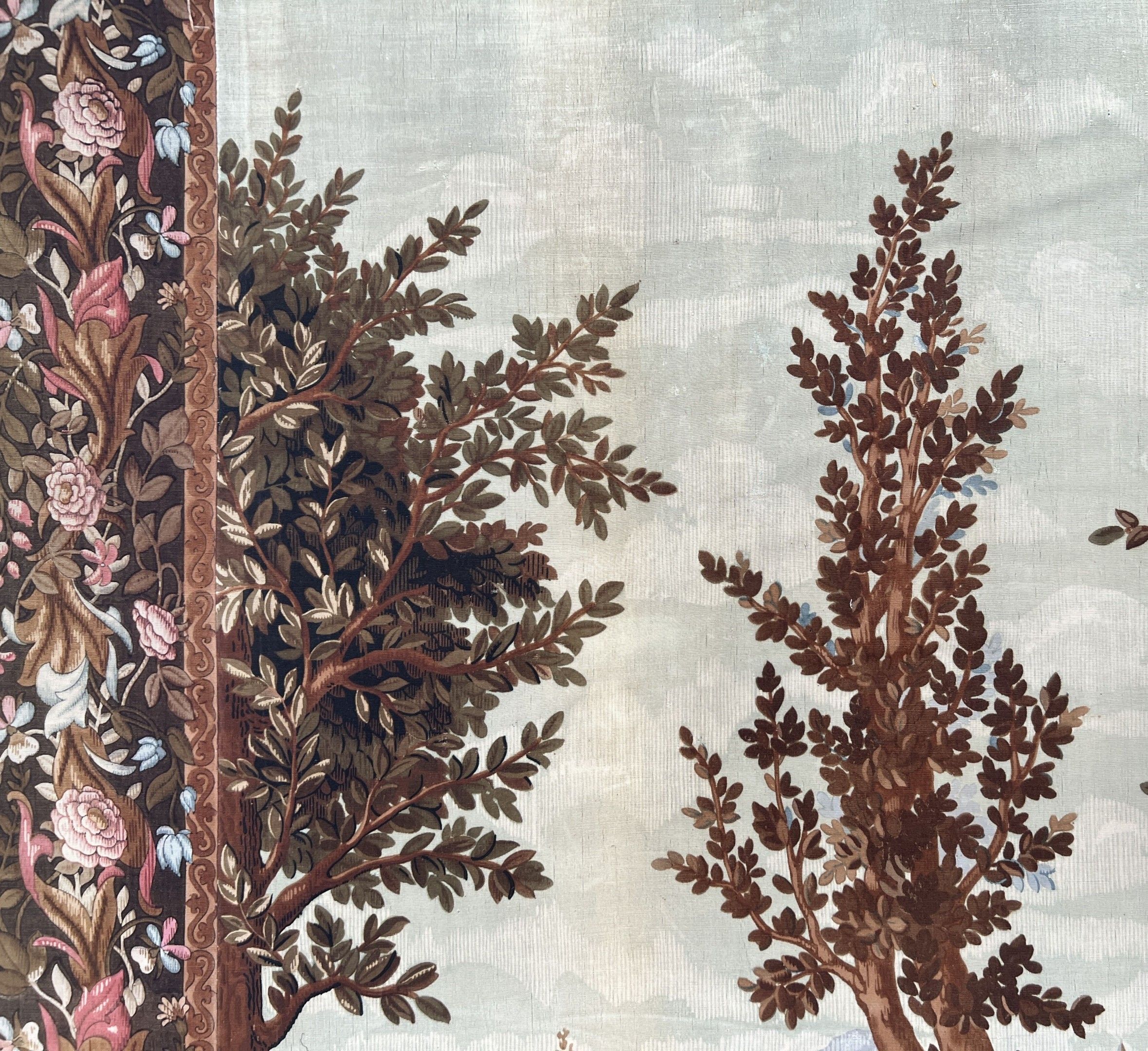 tapisserie mécanique laine imprimée à la planche de bois dans une vive polychromie, décor de scènes de cour animées de nombreux personnages sur un parterre mille-fleurs ; au second plan un château et une église et la montagne dans le lointain. Bordures montantes aux rinceaux de fleurs et feuillage, bordures transversales coupées, (coloris frais, quelques petit trous), 287 x 182 cm RMH