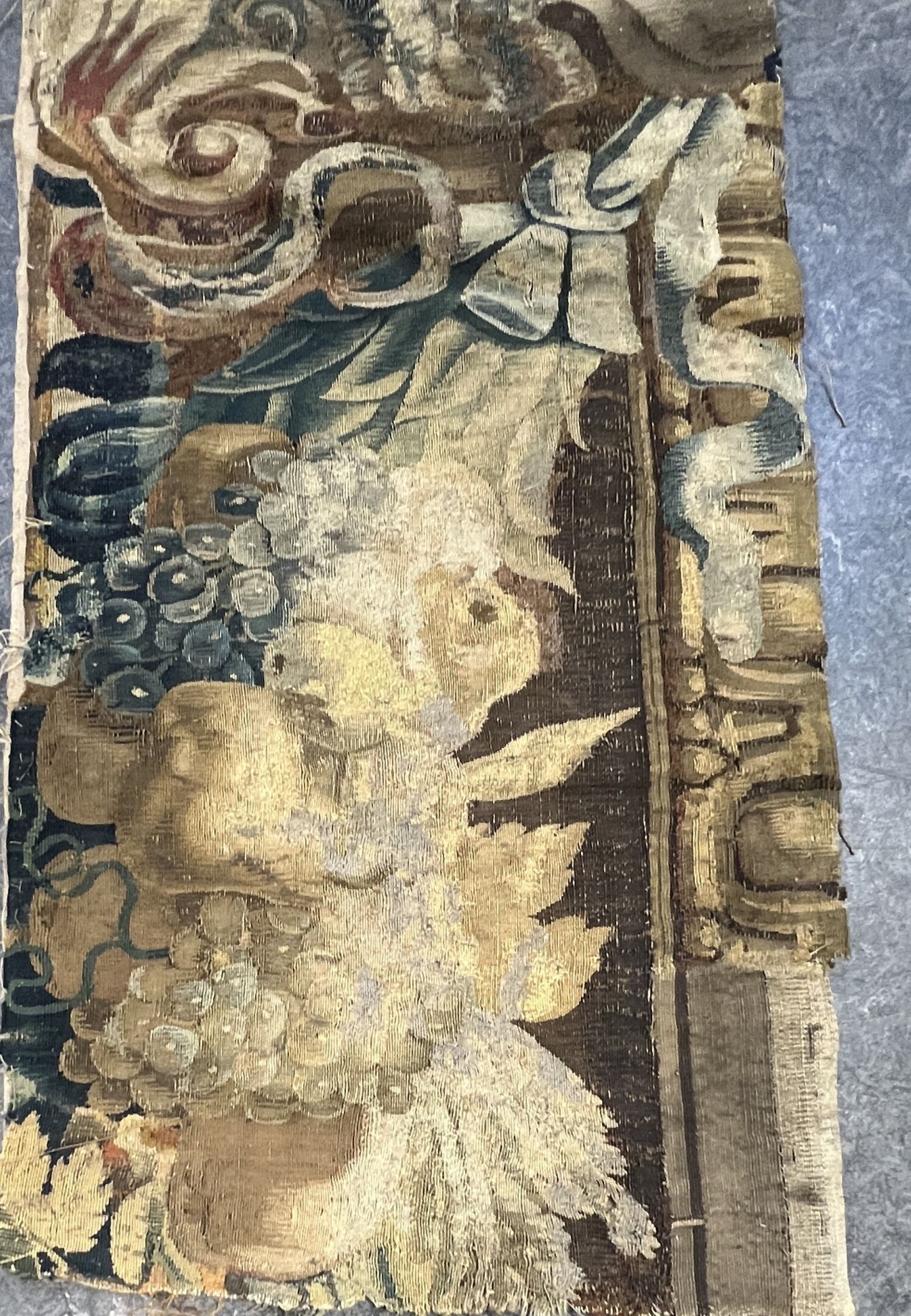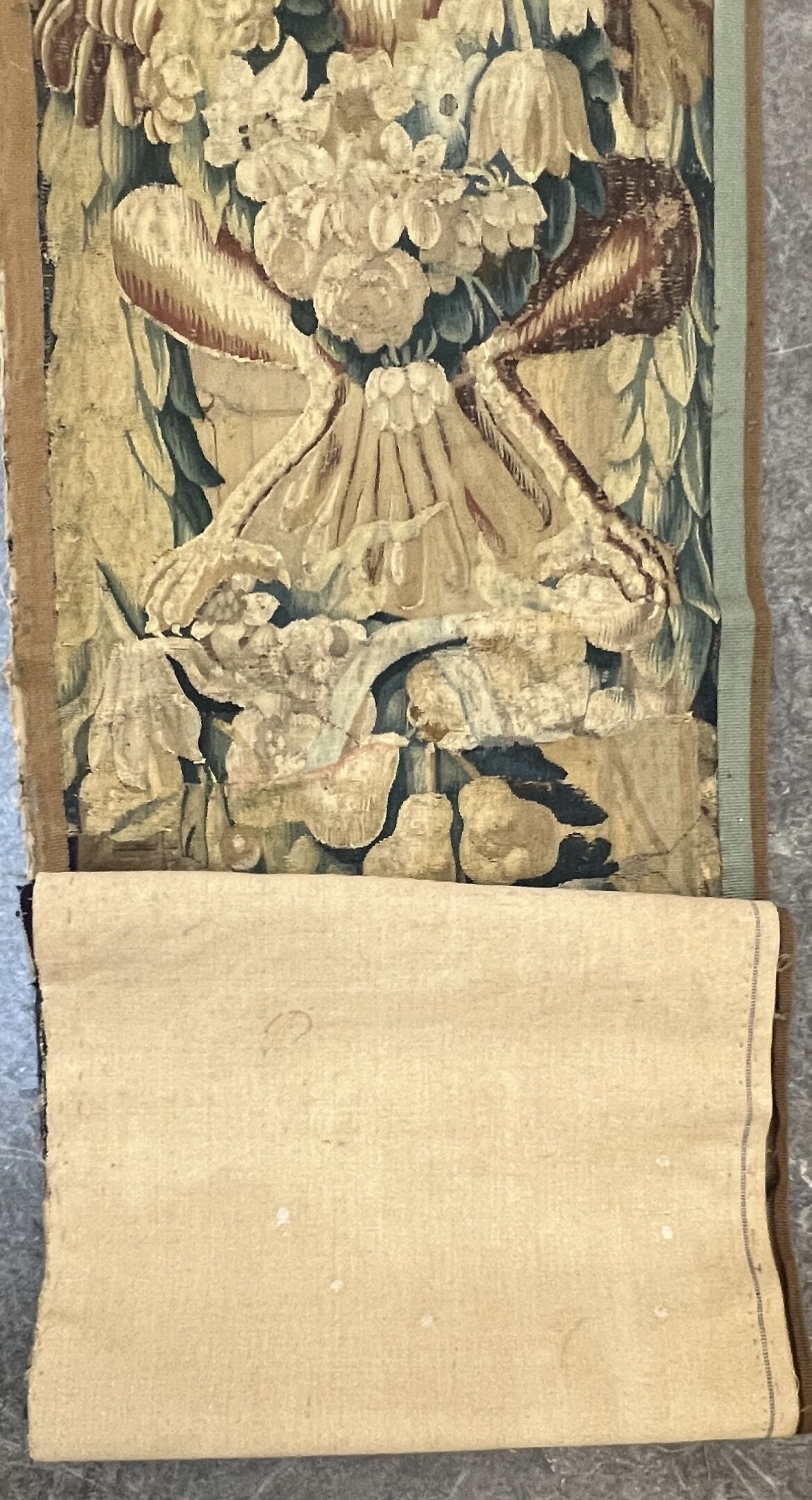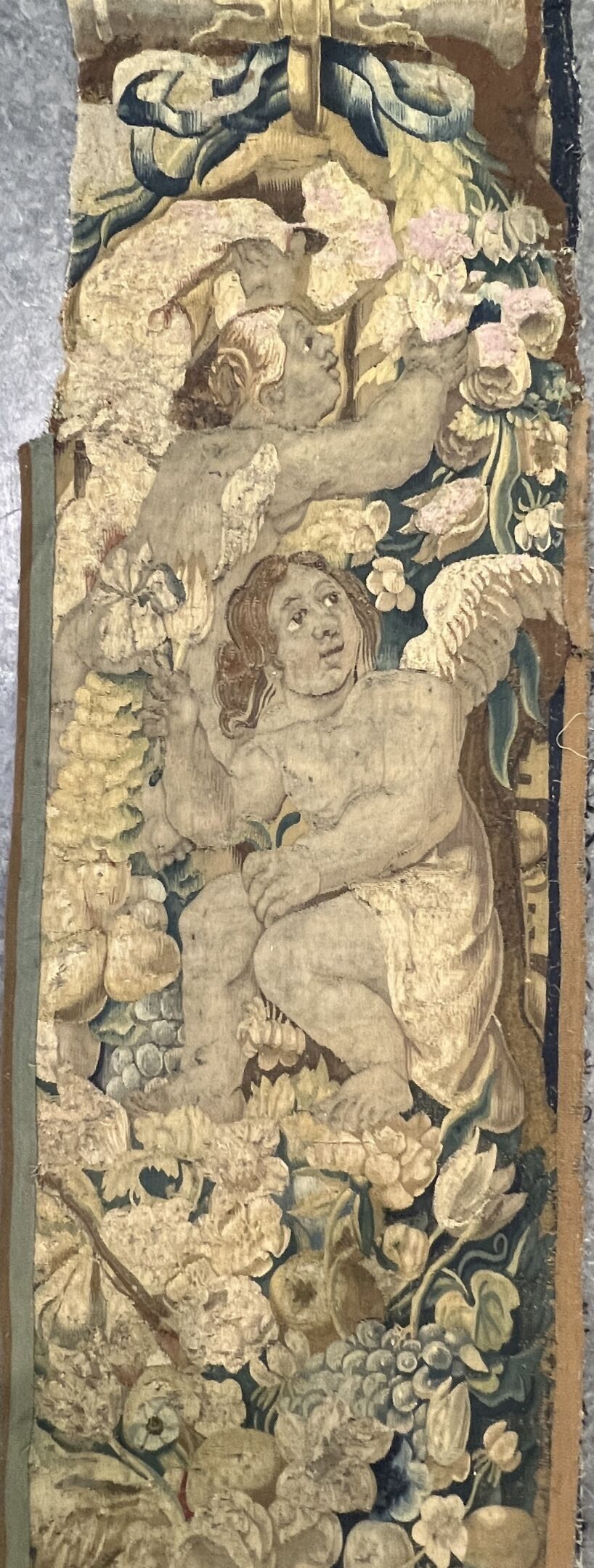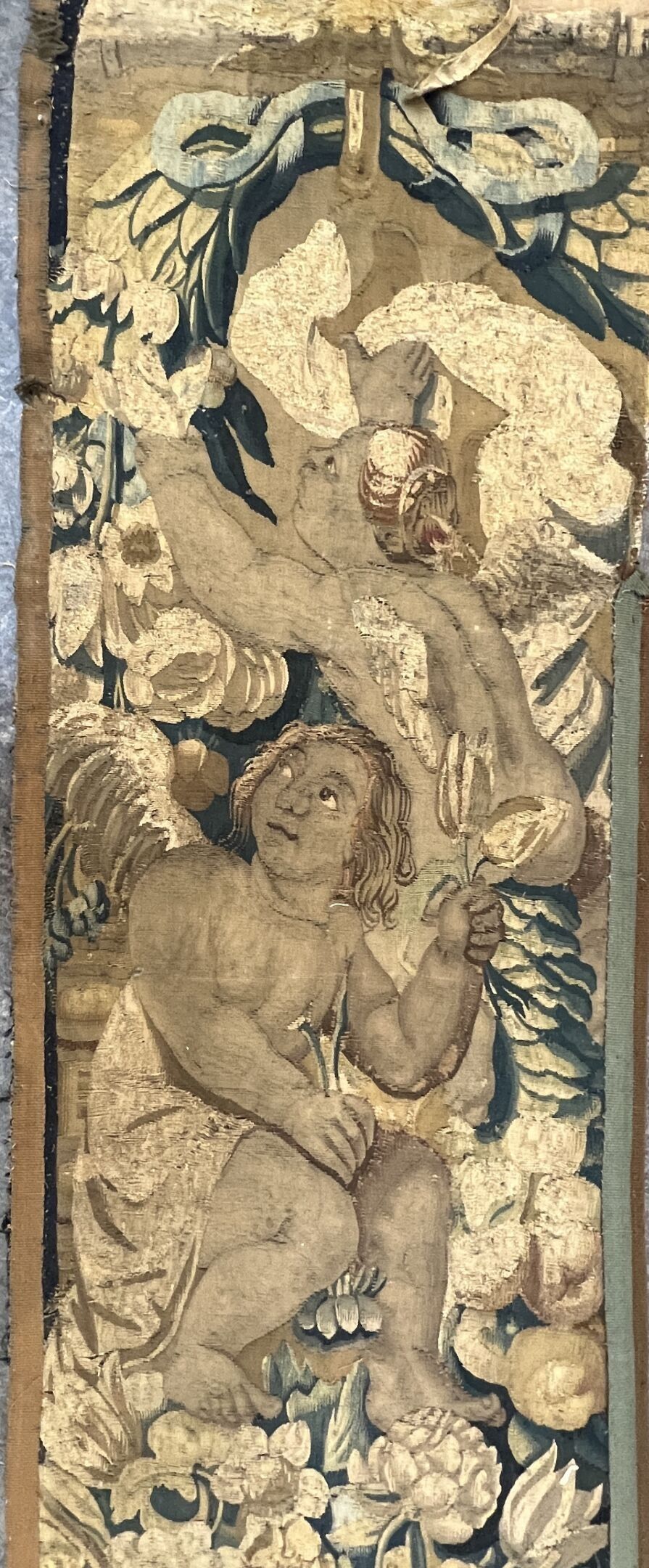 tapisserie tissée laine et soie polychrome, les cartons attribués à Juste d'Egmont (1601-1674. Bordures montantes à décor de coupes de fleurs et de fruits, volatile éployé et d'amours cueillant les roses et les tulipes d'une guirlande de fleurs nouée sur la partie supérieure. Bordure transversale supérieure au cartouche de la tapisserie narrant le Suicide d'Antoine, (usures, manques aux extrémités).