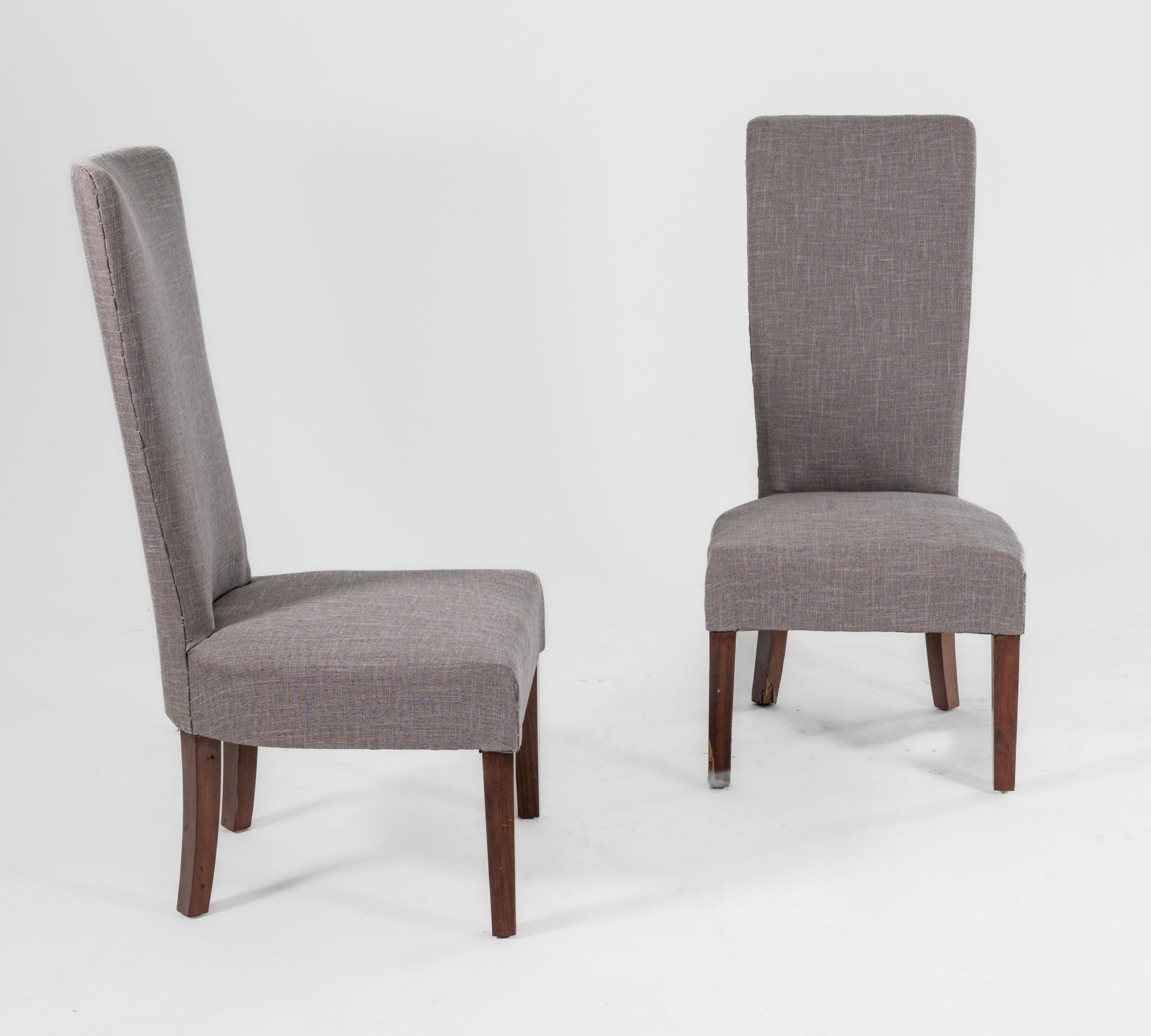 Structure sur quatre pieds supportant une assise et un haut dossier. Ce dernier garni et recouvert de tissu gris