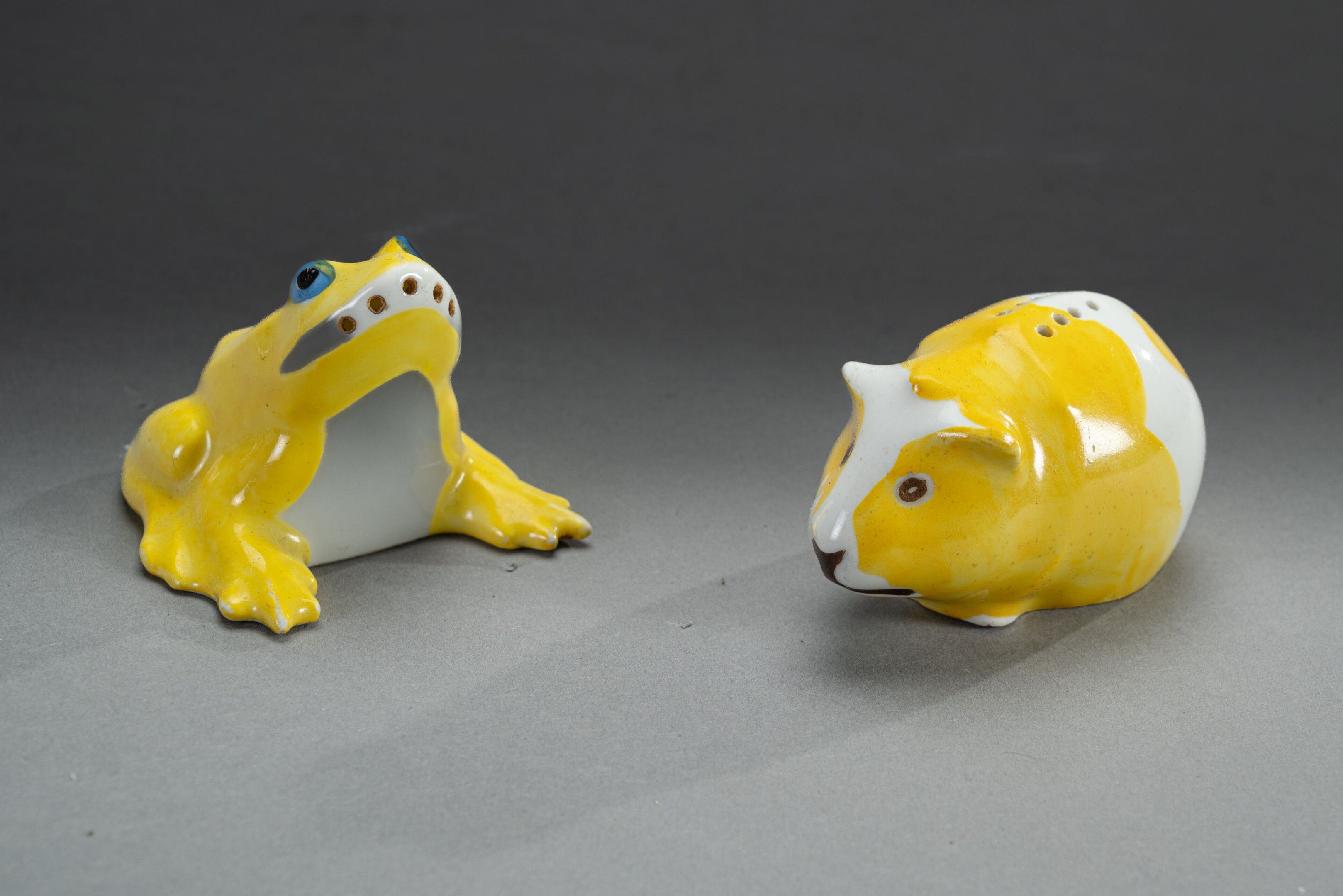 Ensemble comprenant une salière grenouille et une salière cobaye en porcelaine polychrome, marquées au-dessous