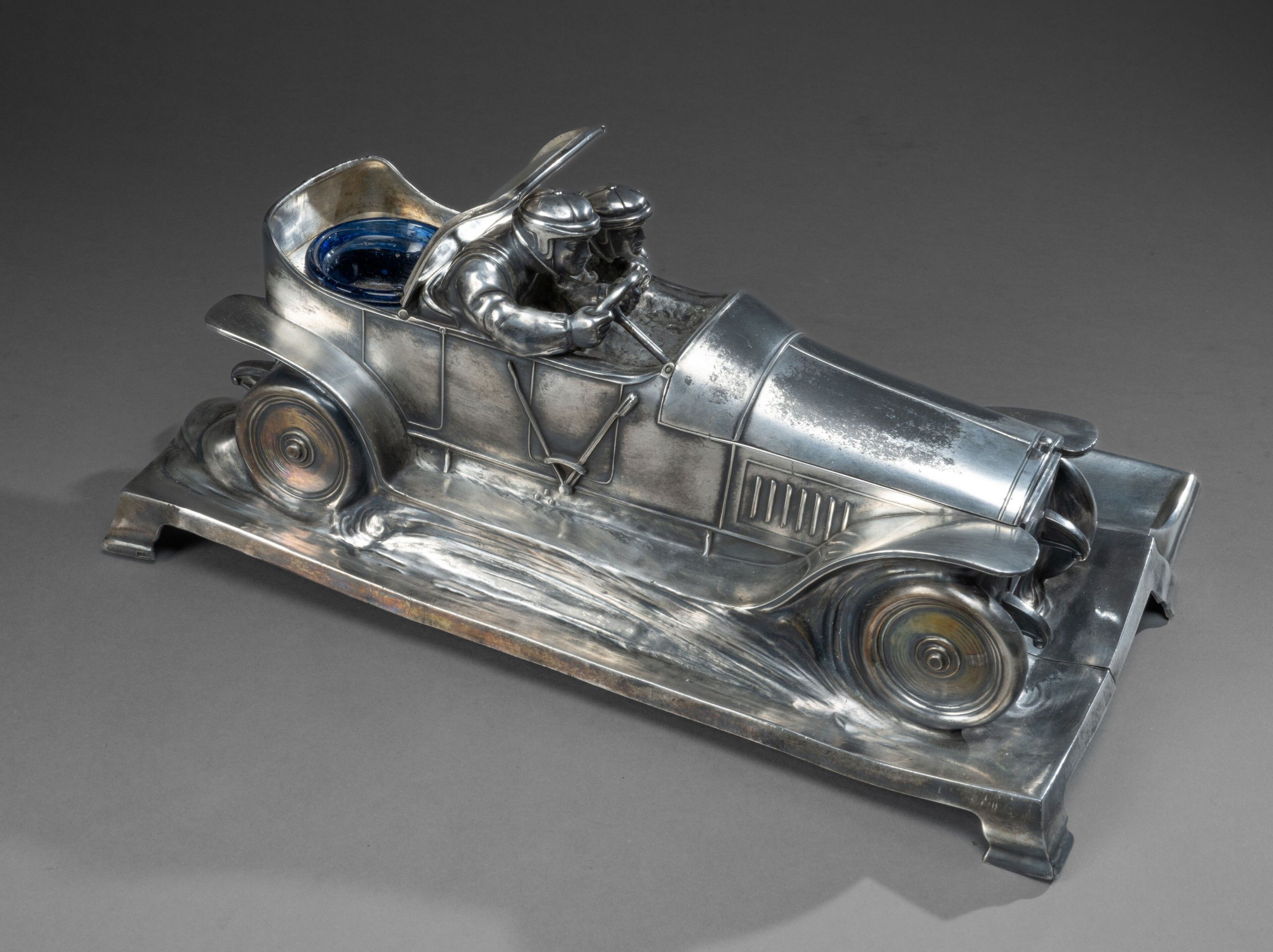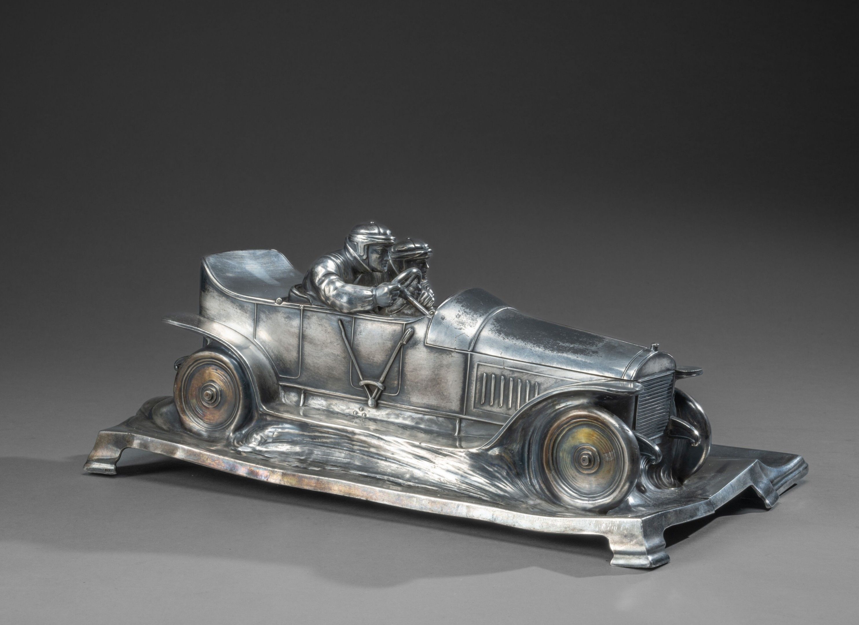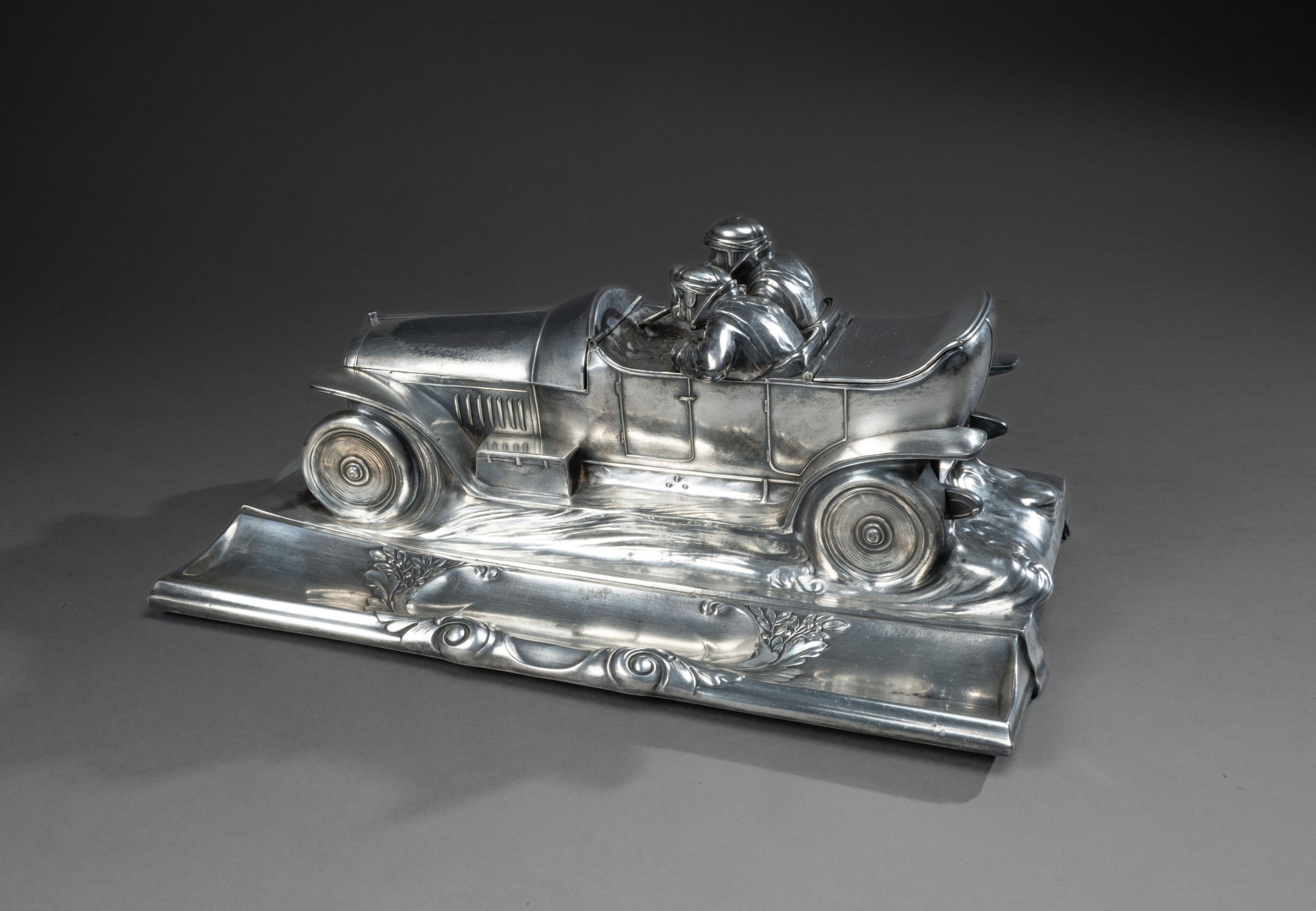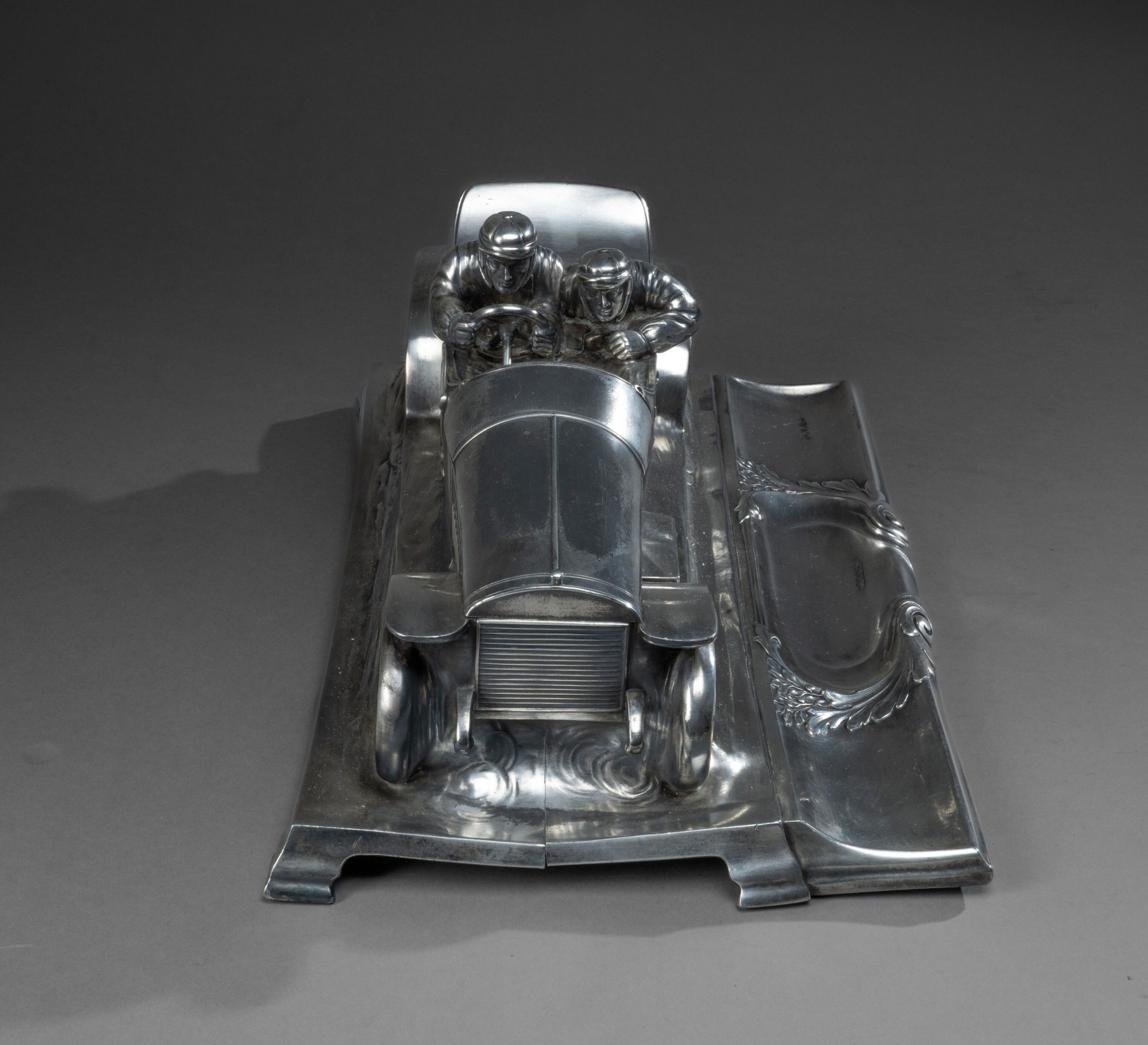 Épreuve en alliage léger à base d'étain argenté figurant une voiture - dont le modèle est proche d'une Mercedes-Benz de l'époque lancée à vive allure, reposant sur une base rectangulaire ornée de motifs végétaux et de volutes art nouveau en léger relief, ménageant un espace pour les porte-plume, le coffre arrière, amovible, renferme un espace pour encrier ; le capot avant, également amovible, constitue un réceptacle pour ranger des timbres et éponges.