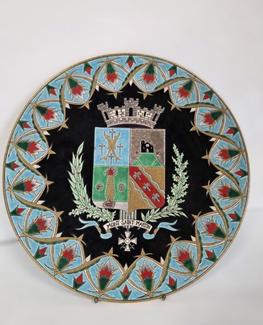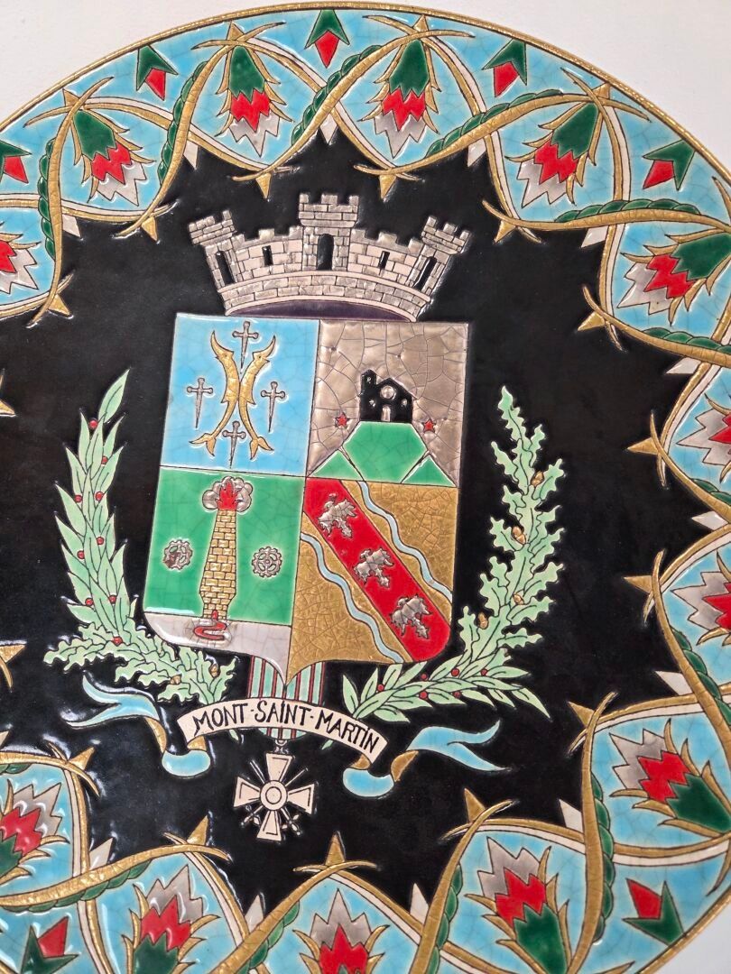 LONGWY - P. MIGNON plat décoratif circulaire en céramique émaillée polychrome à décor du blason de Mont Saint Martin. Diamètre 37cm