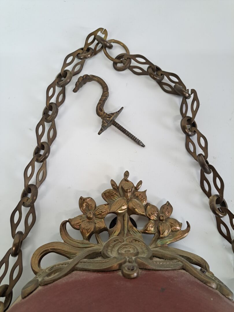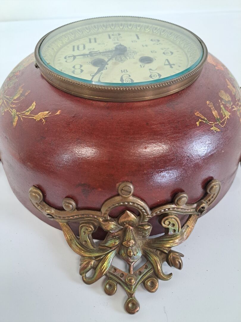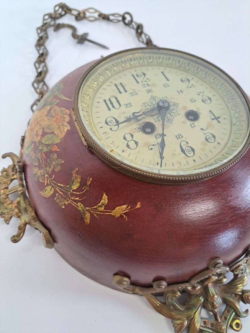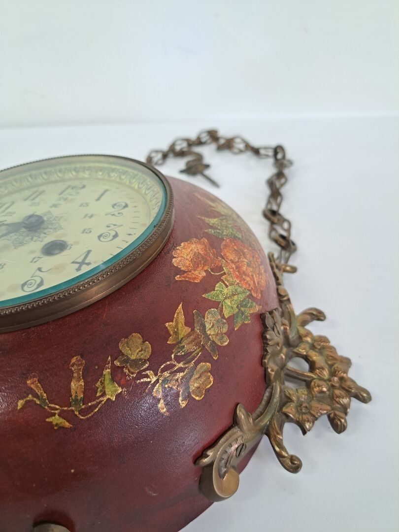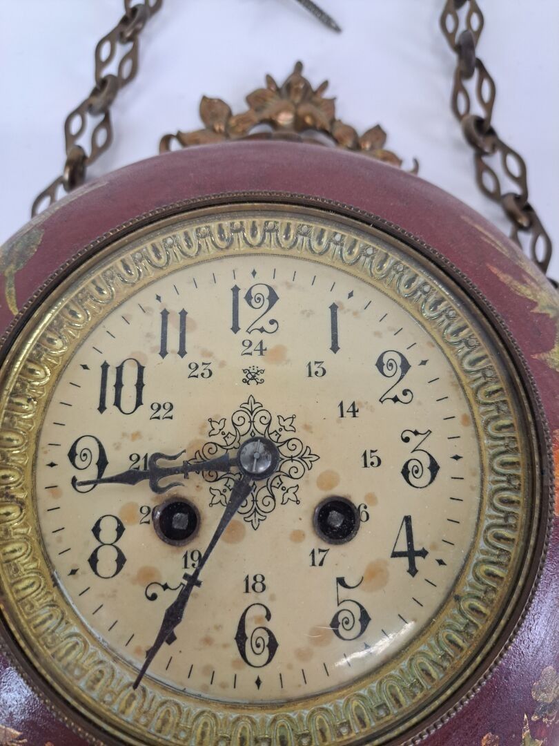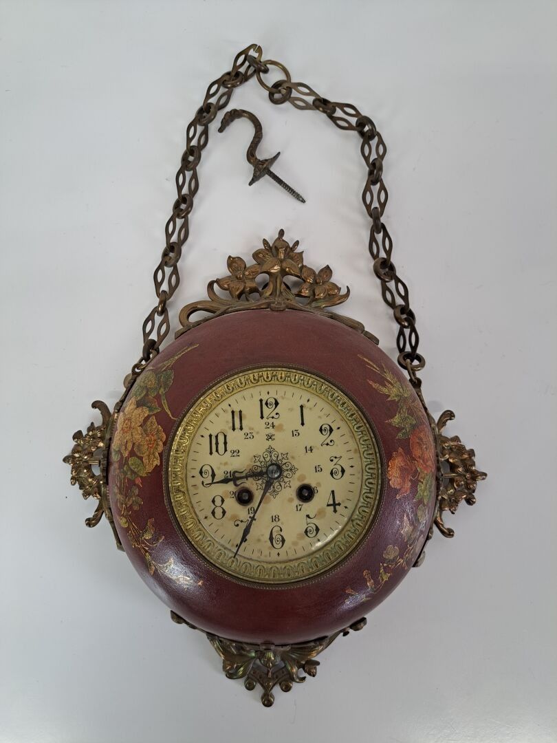 Pendule à suspendre dite boulangère en bronze et tôle émaillée rouge à motifs floraux et surmontée de fleurs. Cadran crème à chiffres arabes. Fin du XIXe siècle. Rousseurs sur le cadran - Avec sa chaîne - Hauteur : 36 cm