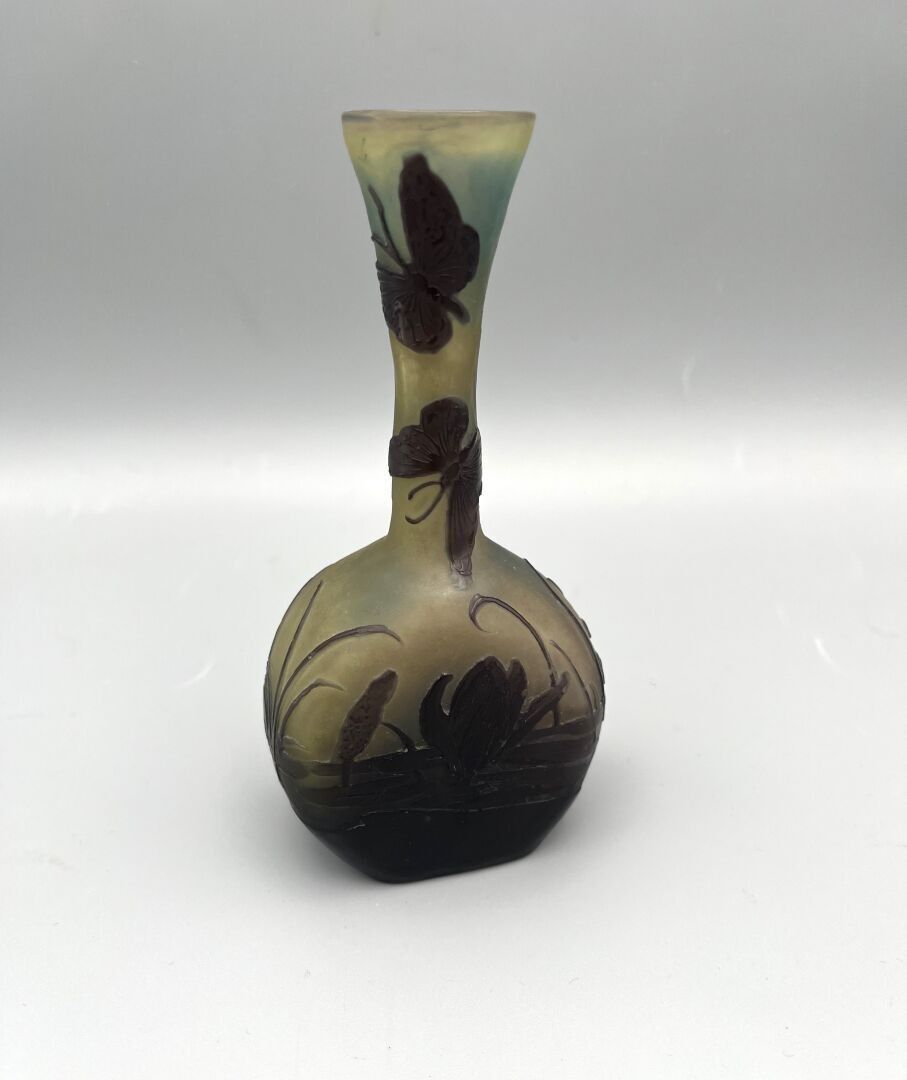 GALLE - Vase en verre multicouche dégagé à l'acide à décor de plantes aquatiques et papillons.