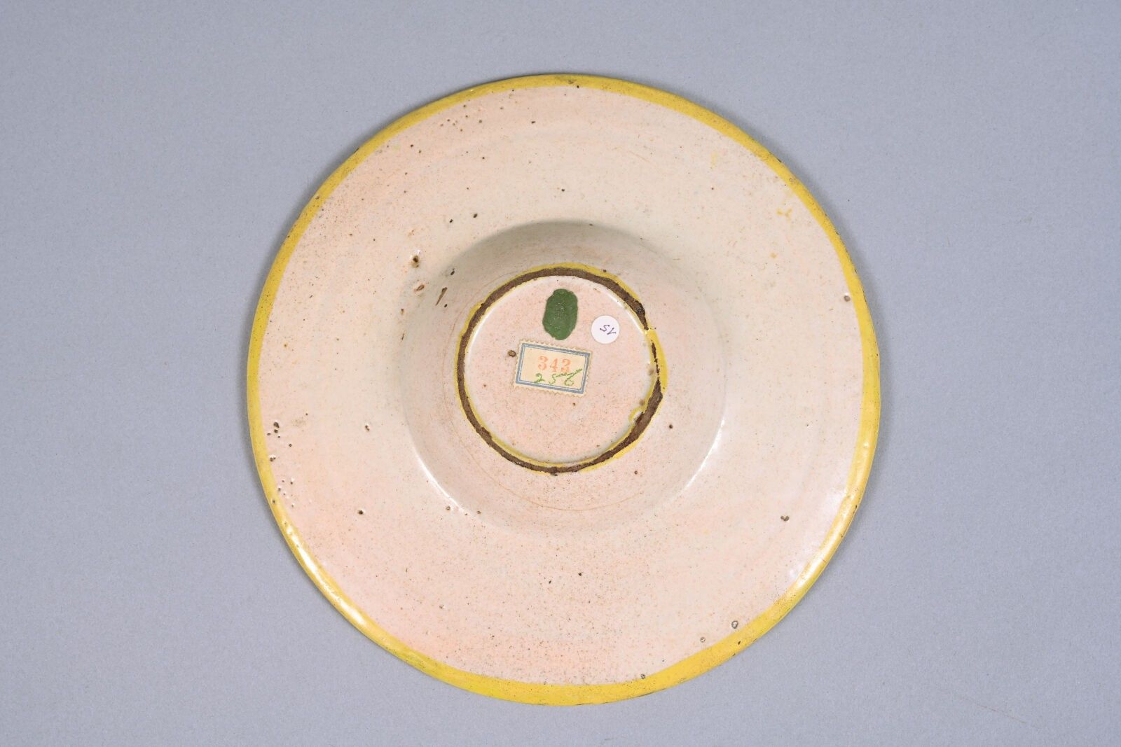 URBINO Plat rond à bassin légèrement creux (tondino) en majolique, à décor polychrome au centre d'un amour, une flamme dans la main, dans un médaillon sur fond jaune cerné d'une guirlande bianco sopra bianco. L'aile est ornée d'une scène de l'Annonciation (?) ; à gauche un ange le doigt levé en direction des cieux et à droite une femme debout de trois-quarts le regardant. Dallage au premier plan, architecture et tentures en drapé. Filet jaune sur le bord. XVIe siècle Diam. 23,5 cm Restauration sur le bord, un cheveu sur le revers, égrenures Provenance : Collections Raoul Heilbronner, Maurice Stora, Jacqueline Stora et par descendance Note : Un tondino a istoriato "la mort d'Achille" présentant le même dallage très particulier au premier plan est reproduit dans l'ouvrage de Greta Kaucher, Le peintre du Marsyas de Milan. La majolique historiée à Urbino en 1530, Ed. Feu et talent, Paris, 2024, p. 58 fig.36 & p. 212 fig. 104.