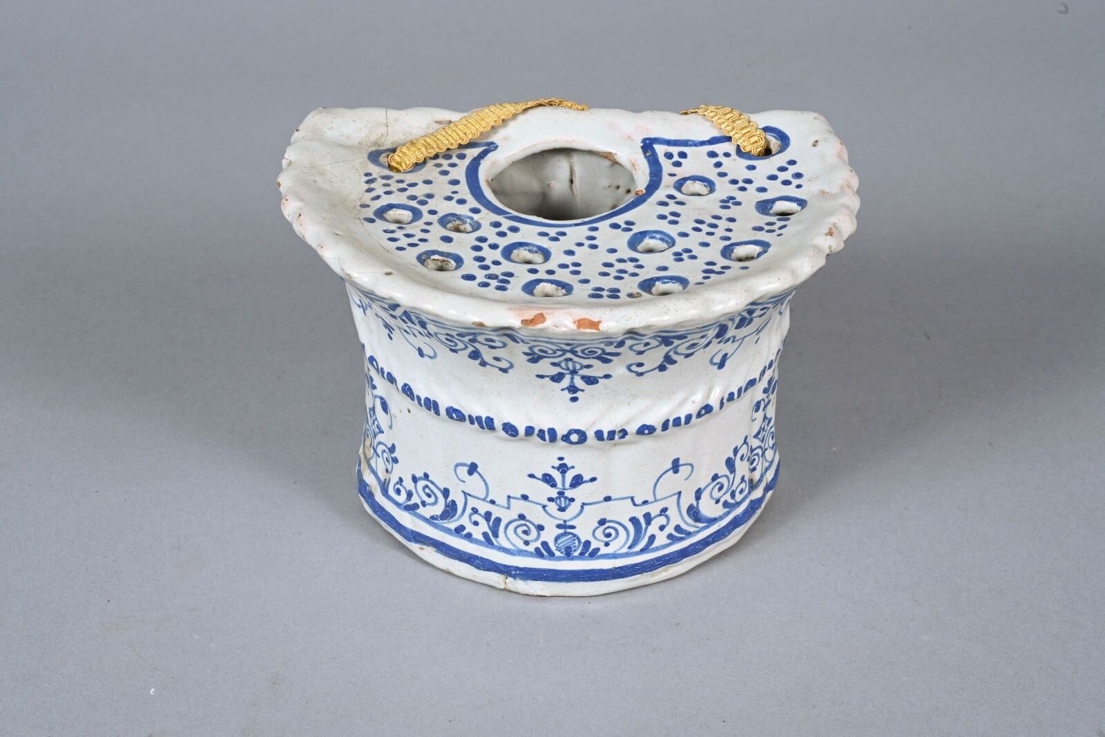 Bouquetière d'applique à paroi godronnée en faïence à décor en camaïeu bleu de broderie.