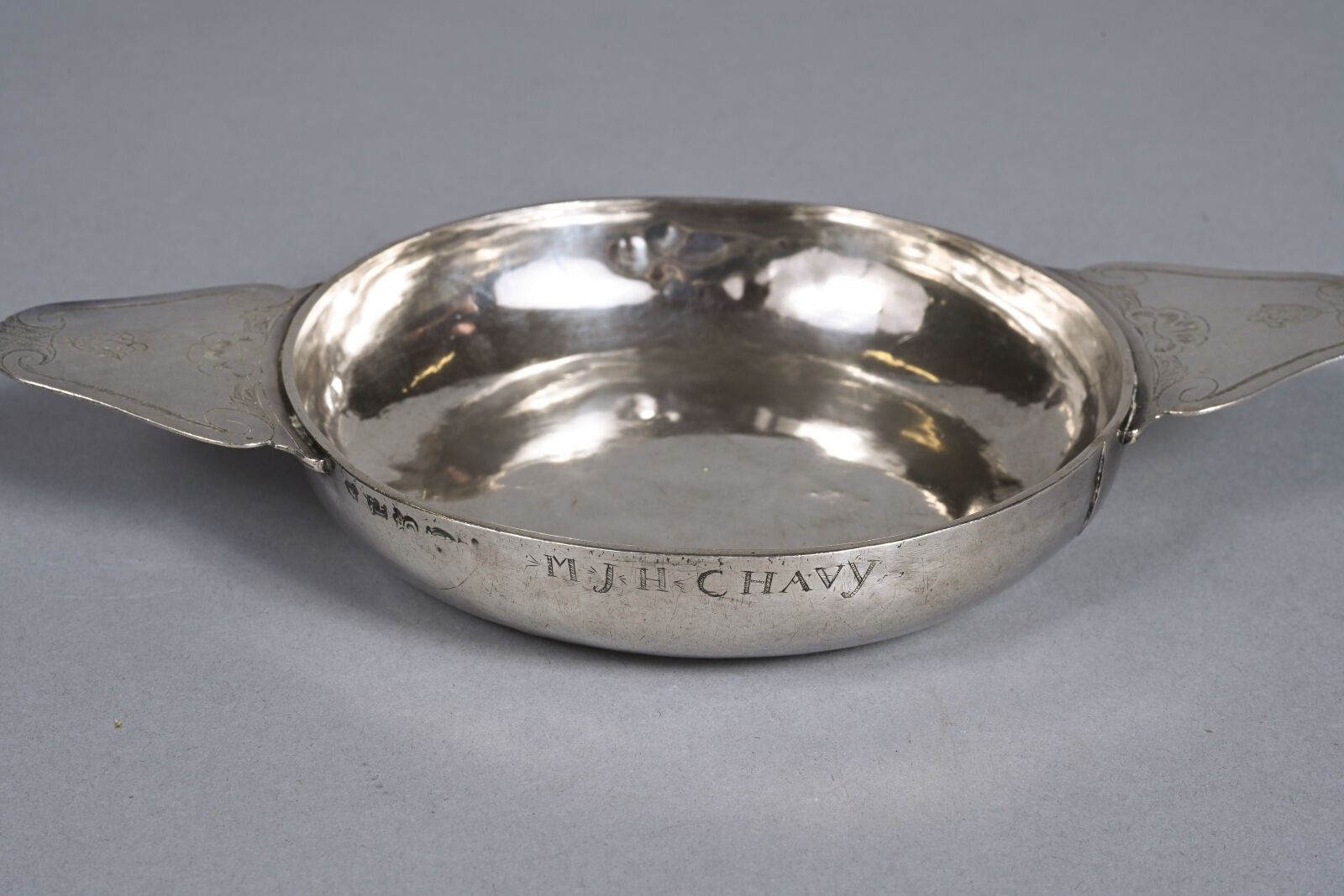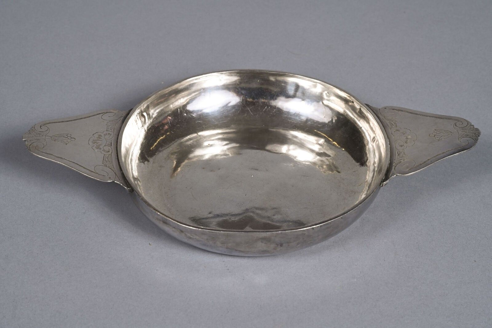 Ecuelle à oreilles en argent gravé de coquilles et feuillages. Gravé MJH Chavy. Poinçons anciens aux Fermiers Généraux, contrôlé au crabe. Poids brut : 172 g Accidents, restaurations