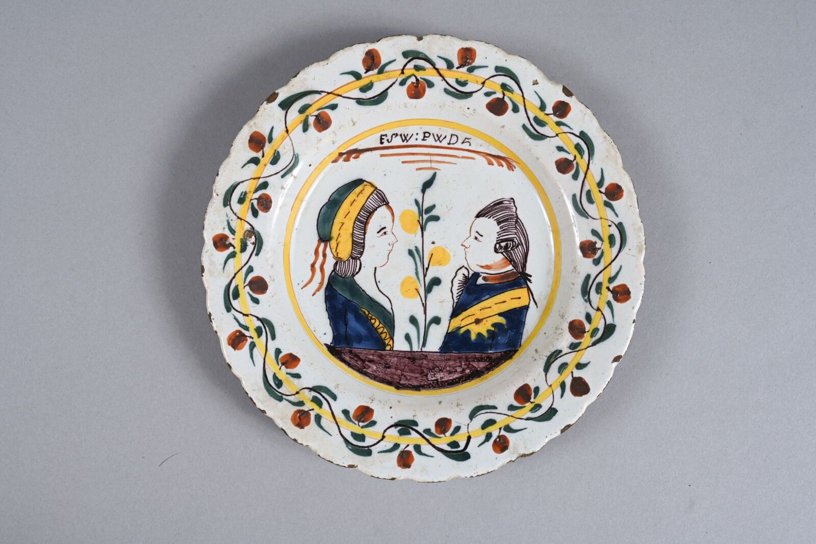 Assiette à bord légèrement festonné en faïence à décor polychrome "orangiste" des portraits en buste du Stadhouder Guillaume V d'Orange (1748-1806) et de son épouse Frederika Wilhemine de Prusse (1751-1801) avec les initiales "FSW" et "PVOR". Sur l'aile, frise d'oranges et feuillage.