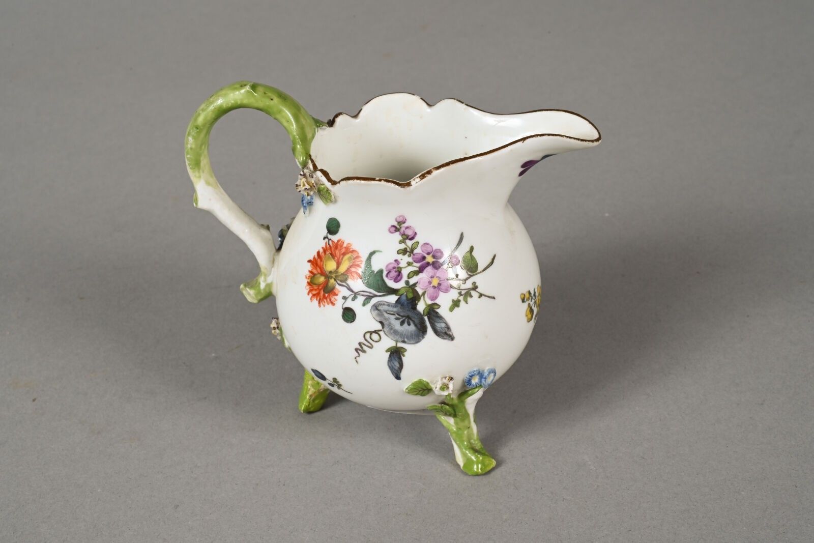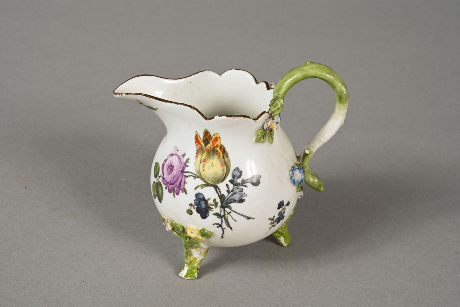Ravier à bord contourné en porcelaine et un pot à lait tripode à décor polychrome de fleurs et insectes. Fleurs en relief sur le pot à lait.