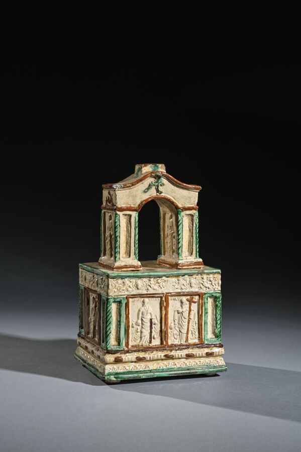 Modèle miniature de poêle en forme d'autel de forme architecturale à deux niveaux en terre vernissée à décor vert et brun sur fond blanc ; la partie supérieure présente une arche centrale et un fronton courbe décoré d'un motif végétal en relief et des colonnes torsadées vertes ; la partie inférieure formée de panneaux en relief représentant les apôtres Saint Philippe et Saint Matthieu entourés de frises d'ornements en relief. Ouverture en arc à la base et petit trou circulaire sur un côté. Lettres incisées sous la base C.C.R. XVIIe siècle H : 22,5cm x 13,5cm x 11cm Éclats et fissures d'origine. Provenance : Collections Raoul Heilbronner, Maurice Stora, Jacqueline Stora et par descendance