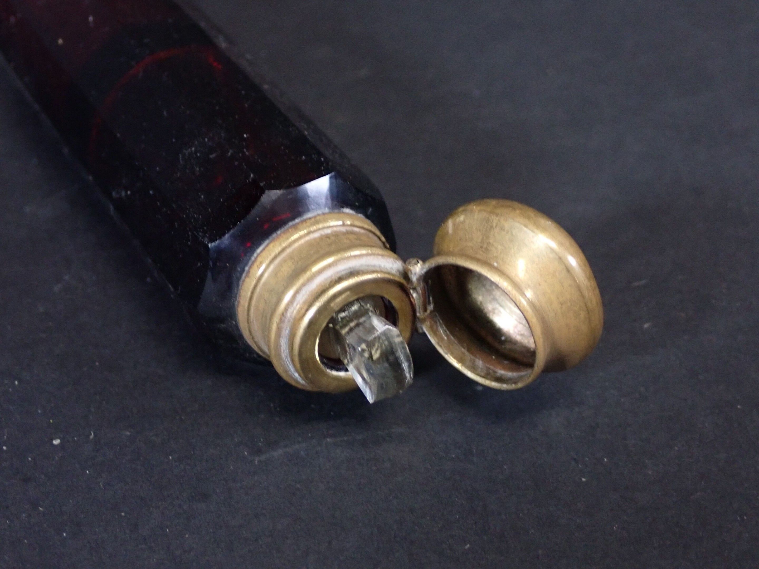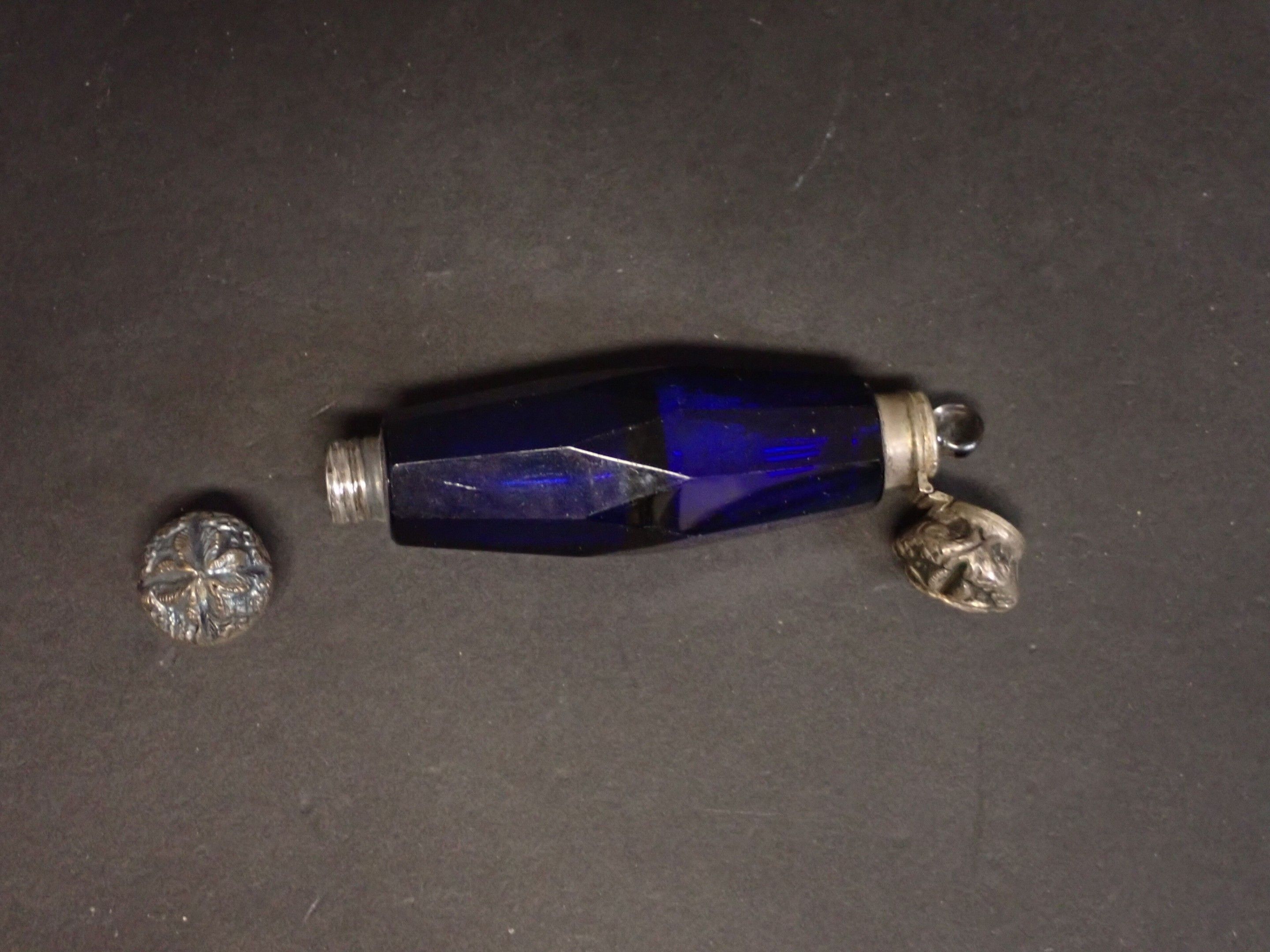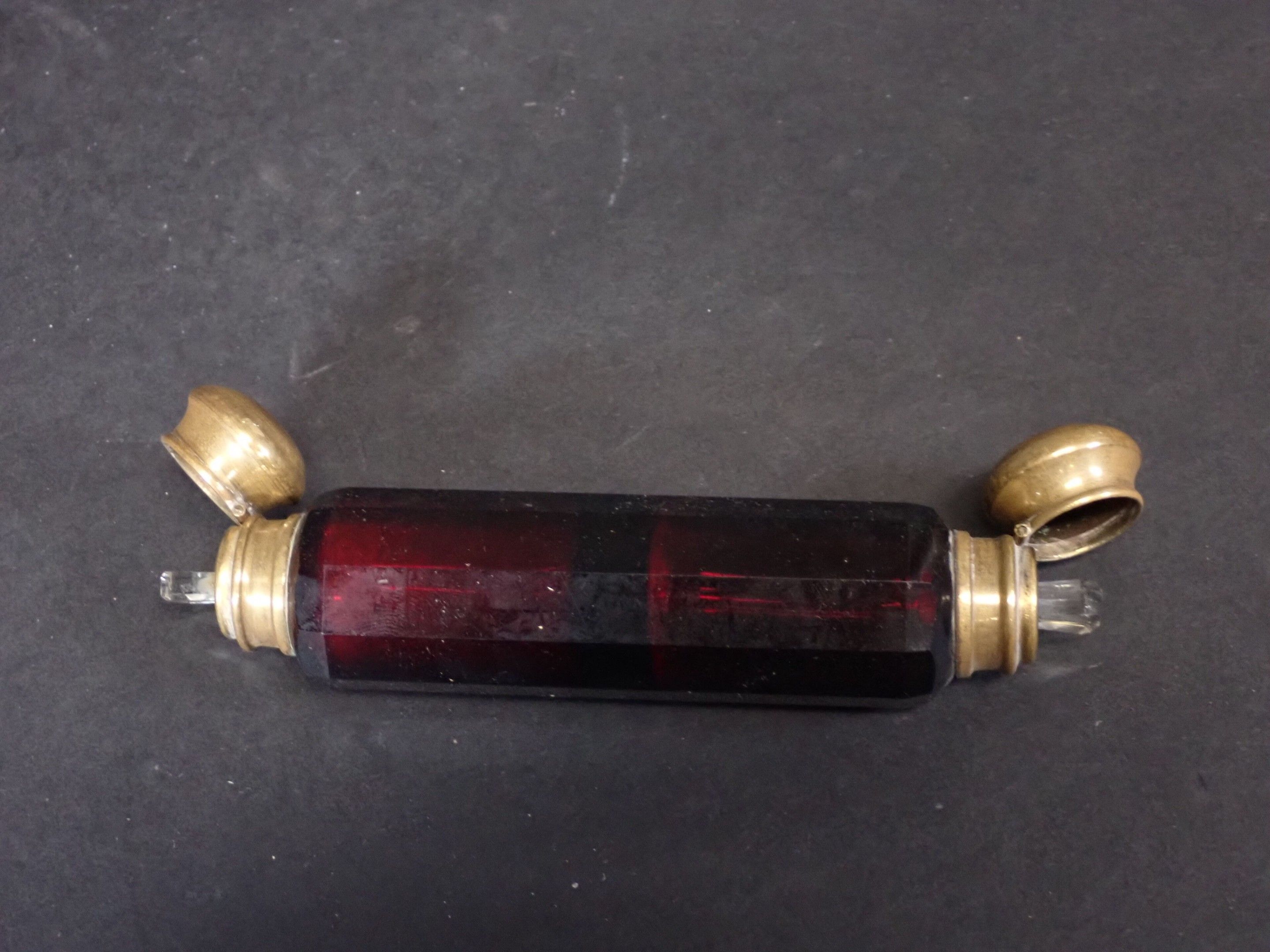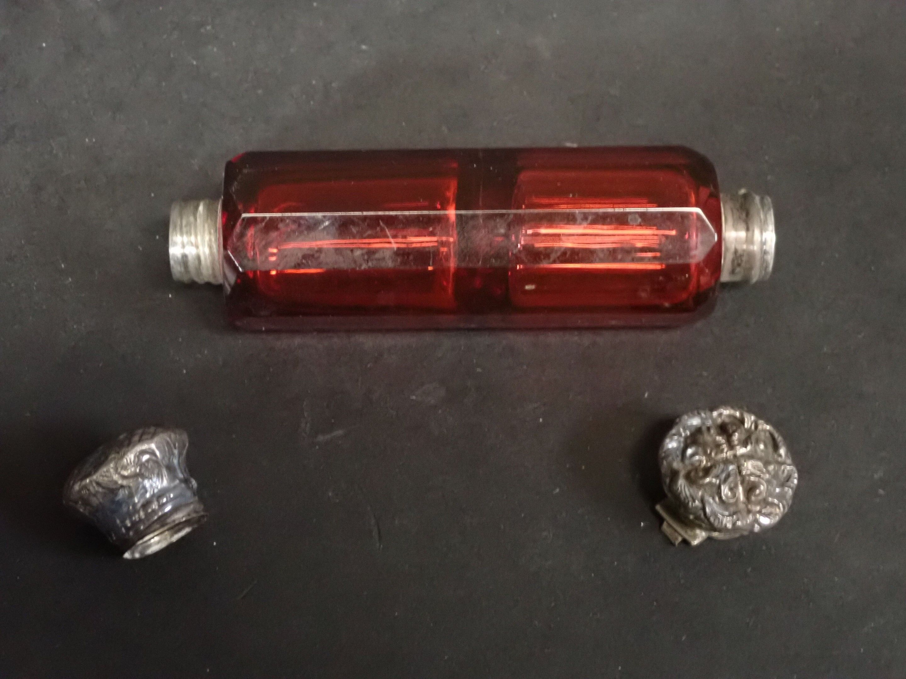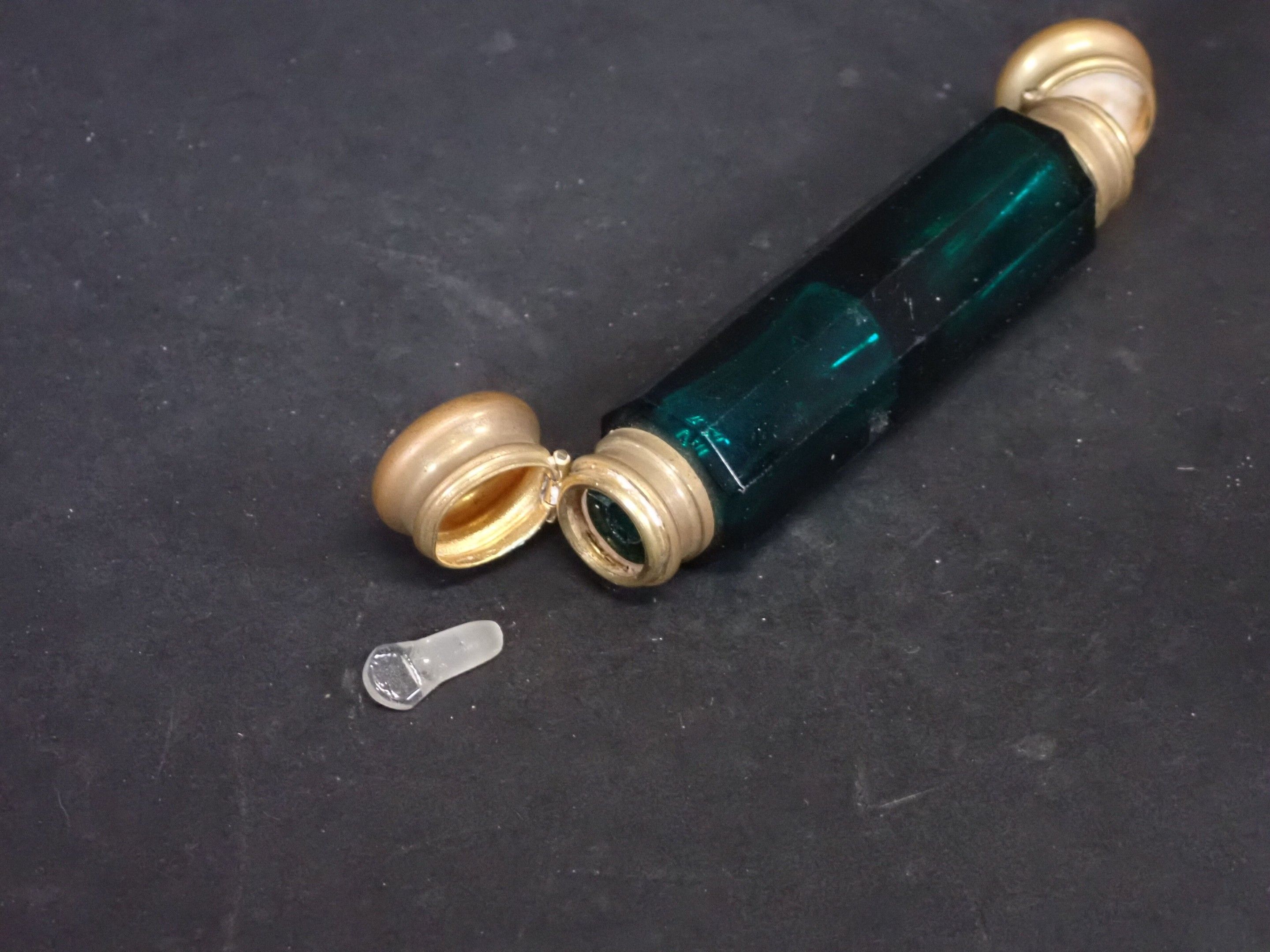 Lot de 4 flacons à sel d'époque fin du XIX's, à double compartiments en verre teinté de couleurs et doubles bouchons en métal - Long. 13 à 10 cm (usures)