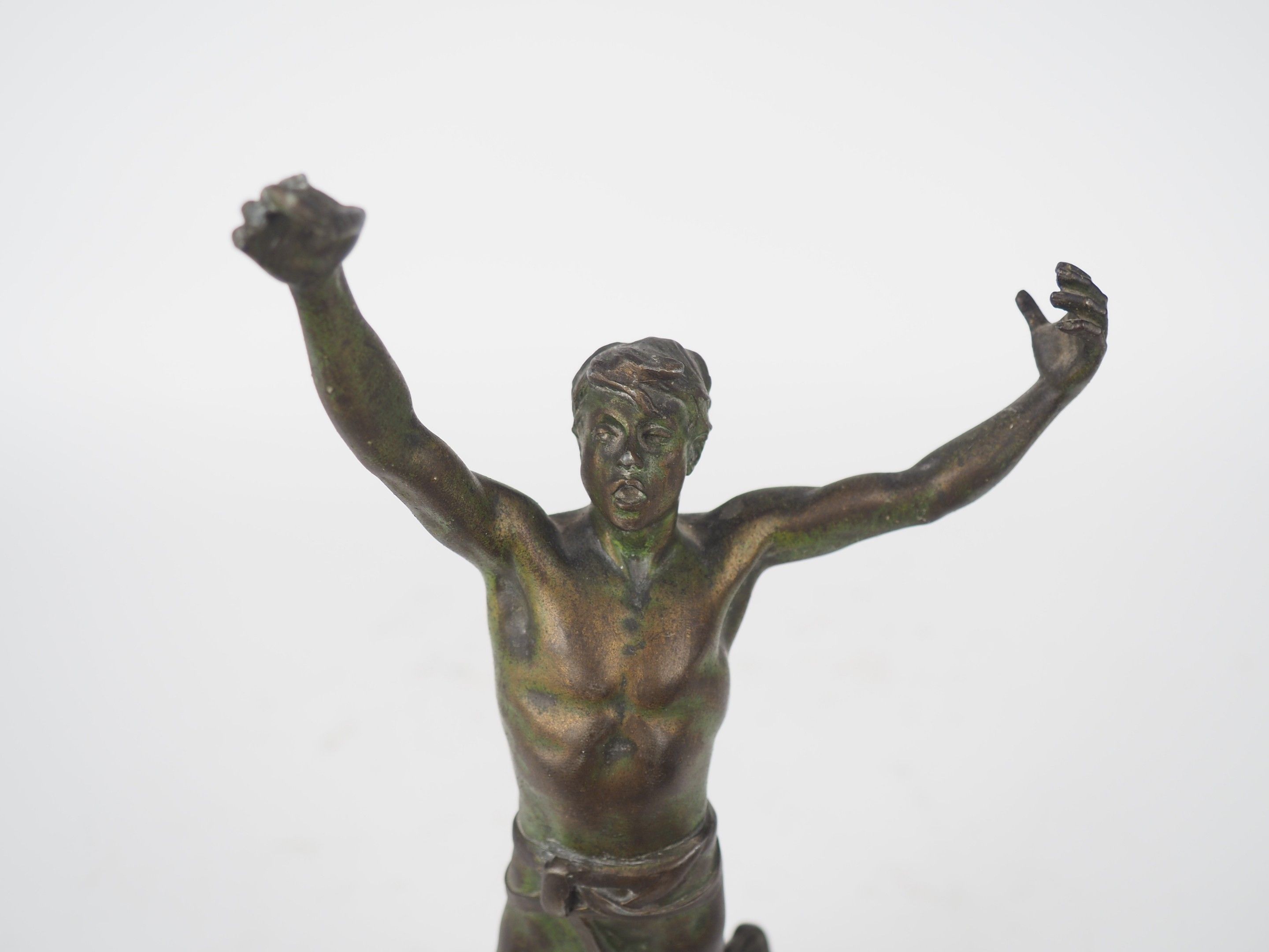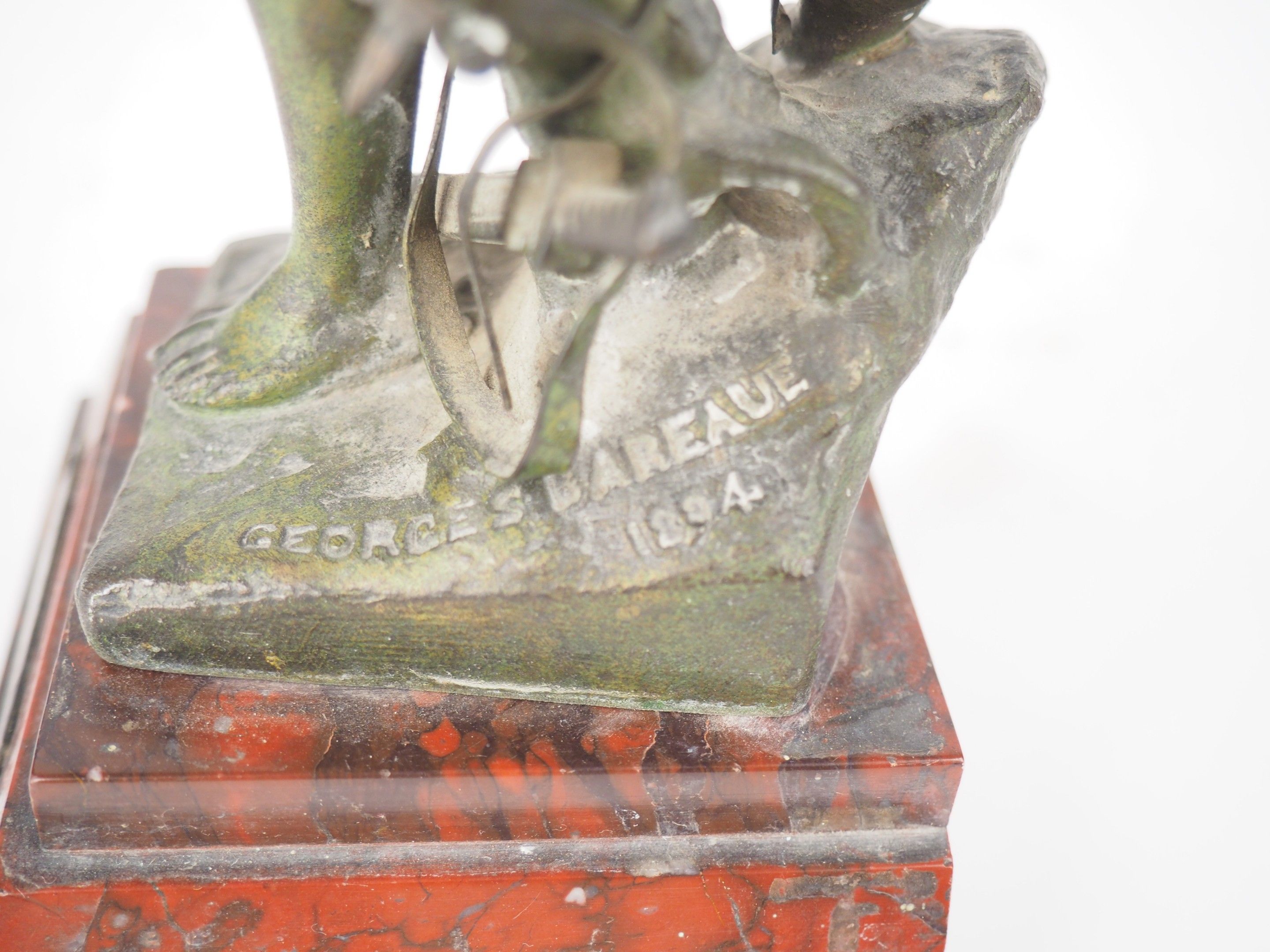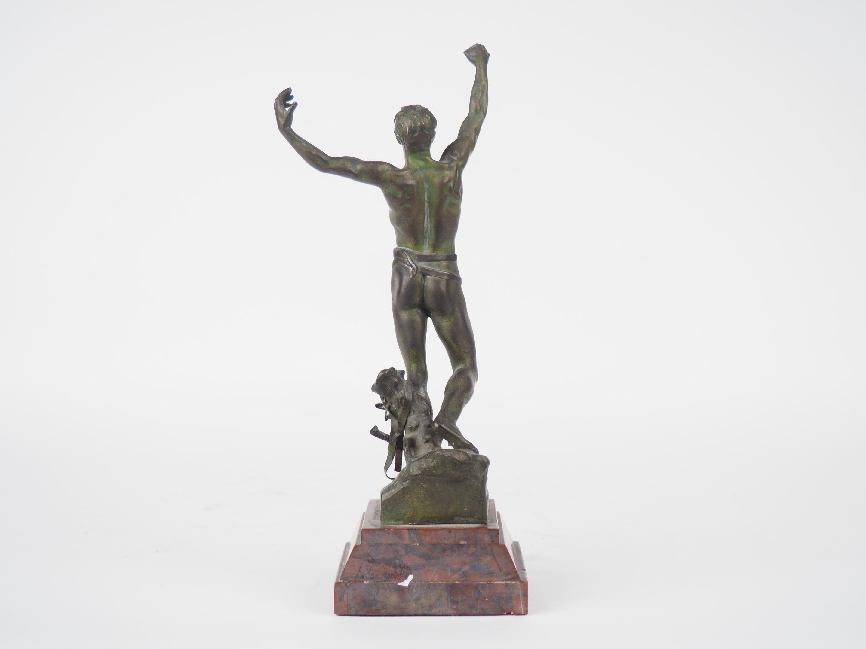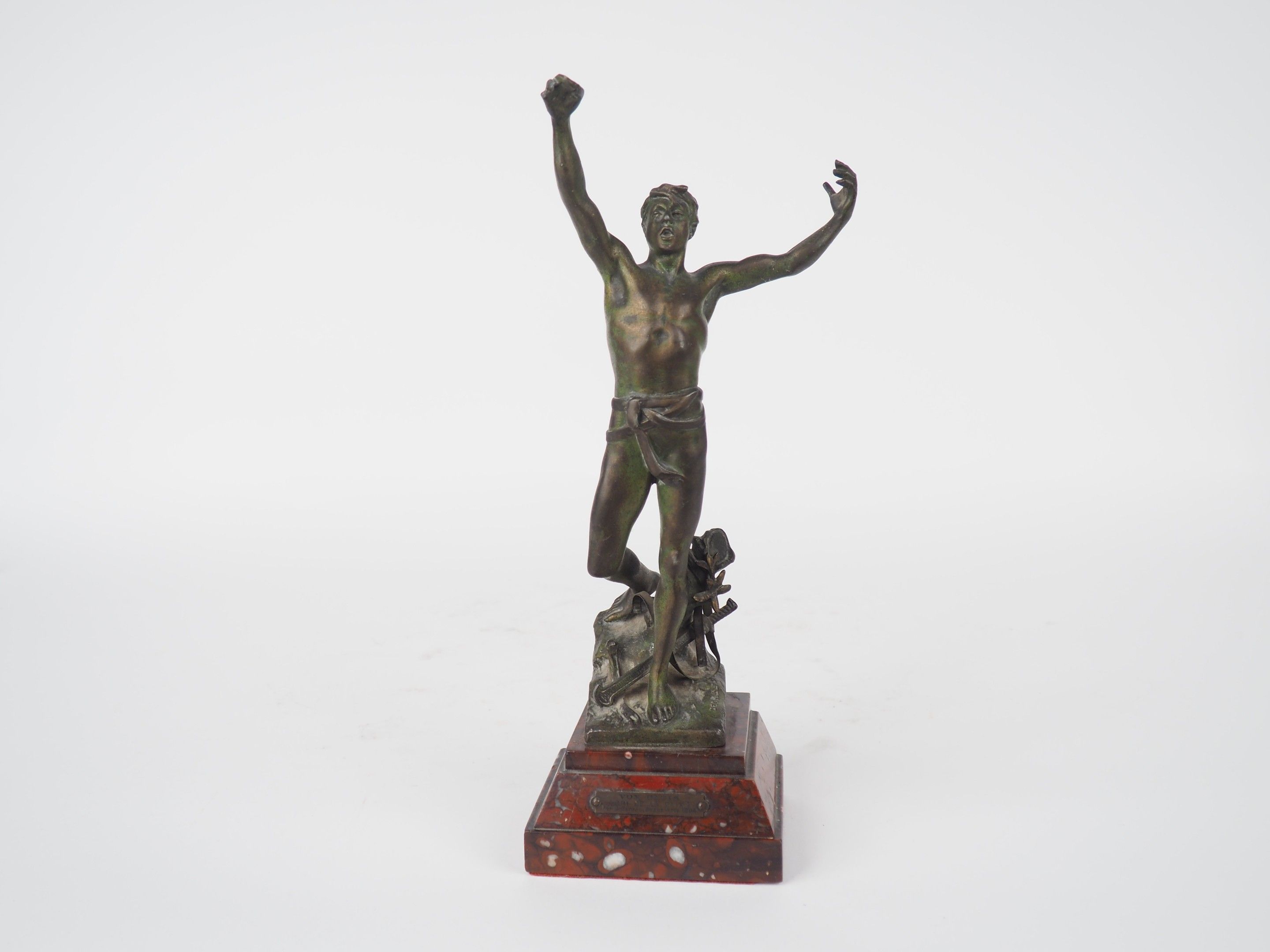 Sujet en régule à patine verte sur un socle à degrés en marbre rouge
