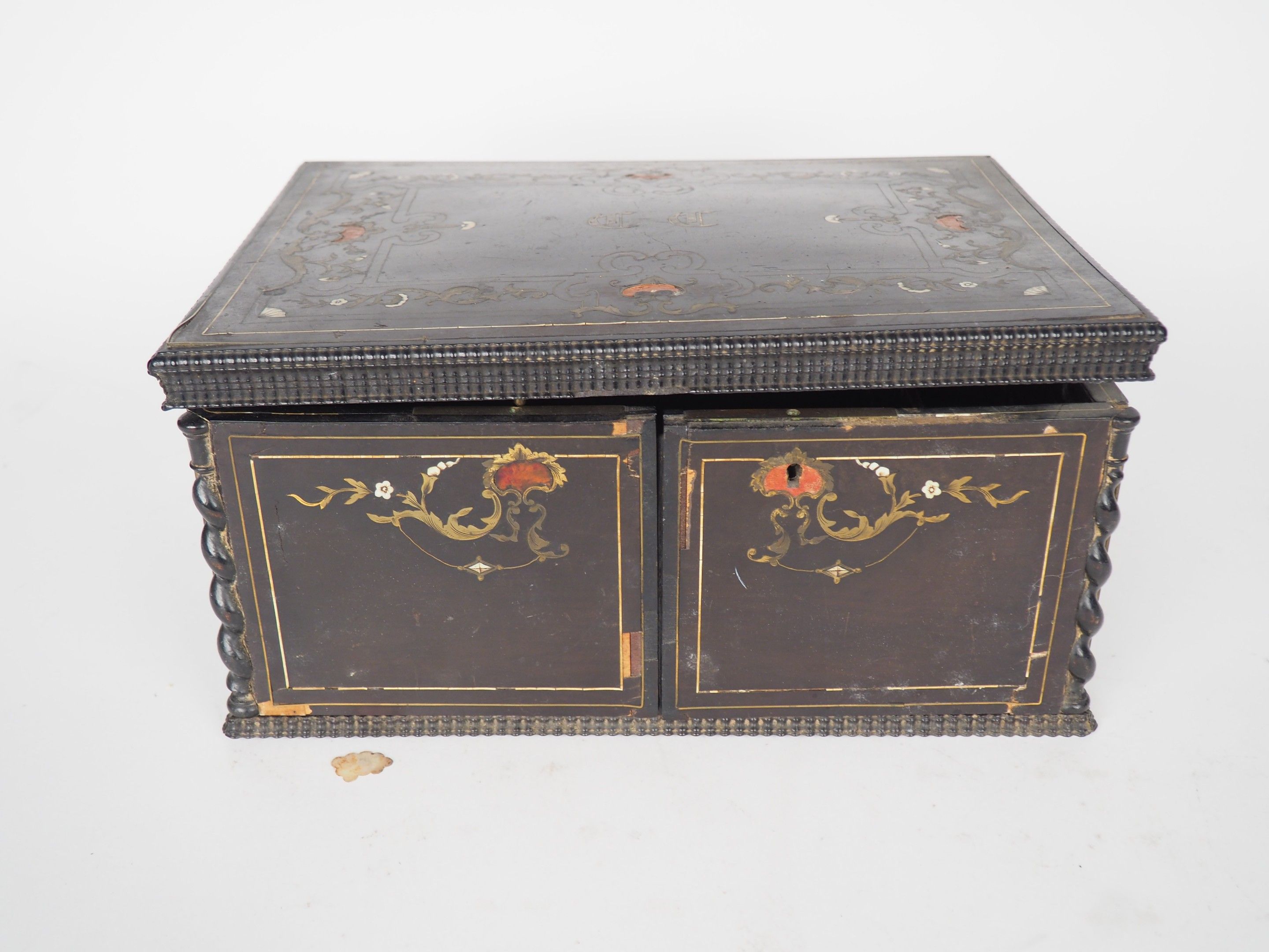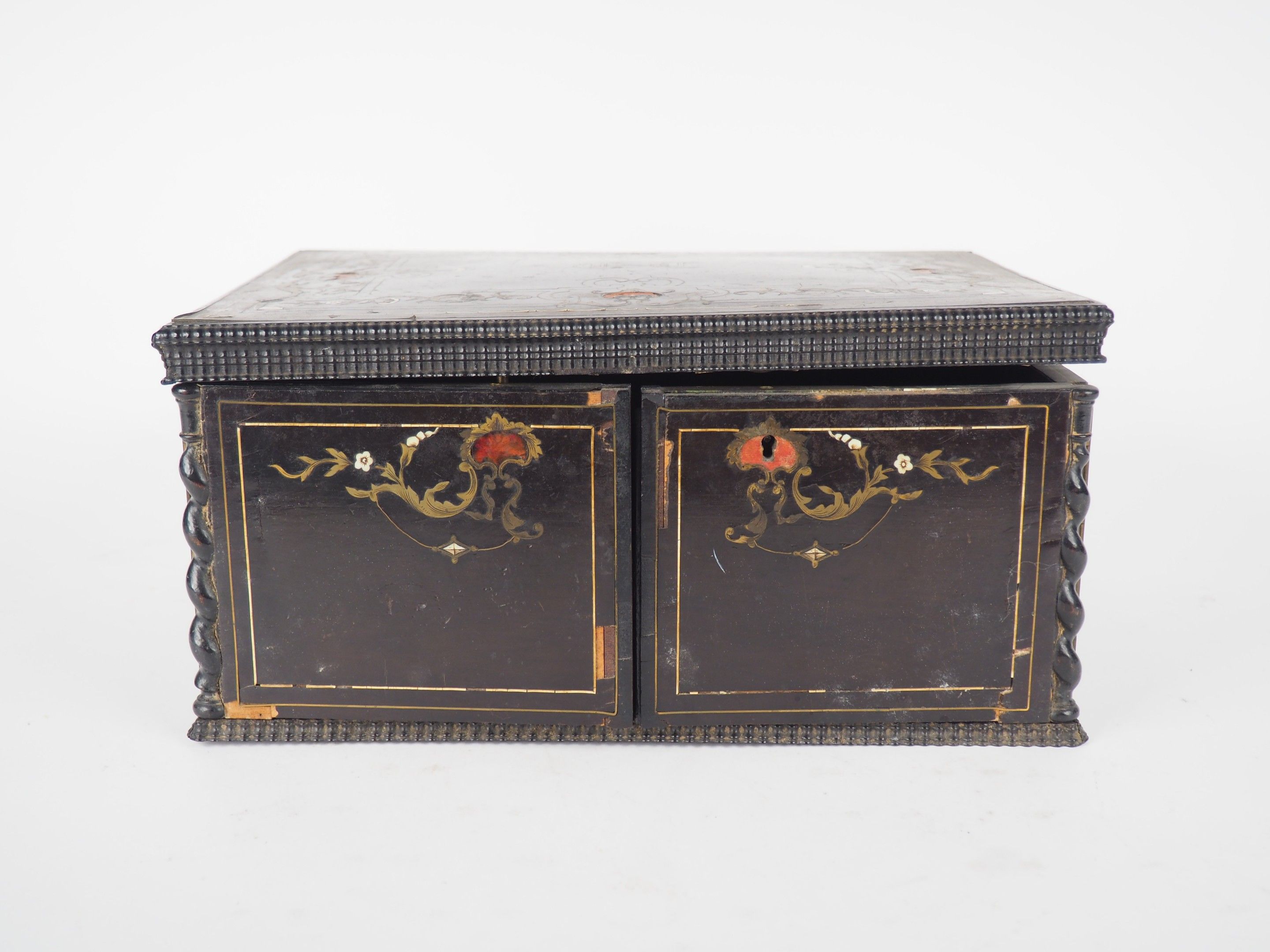 Ecritoire de voyage Napoléon III en bois noirci, acajou et laiton à décor marqueté de fleurs et de rinceaux feuillagés, ouvrant à un abattant et deux petits vanteaux.