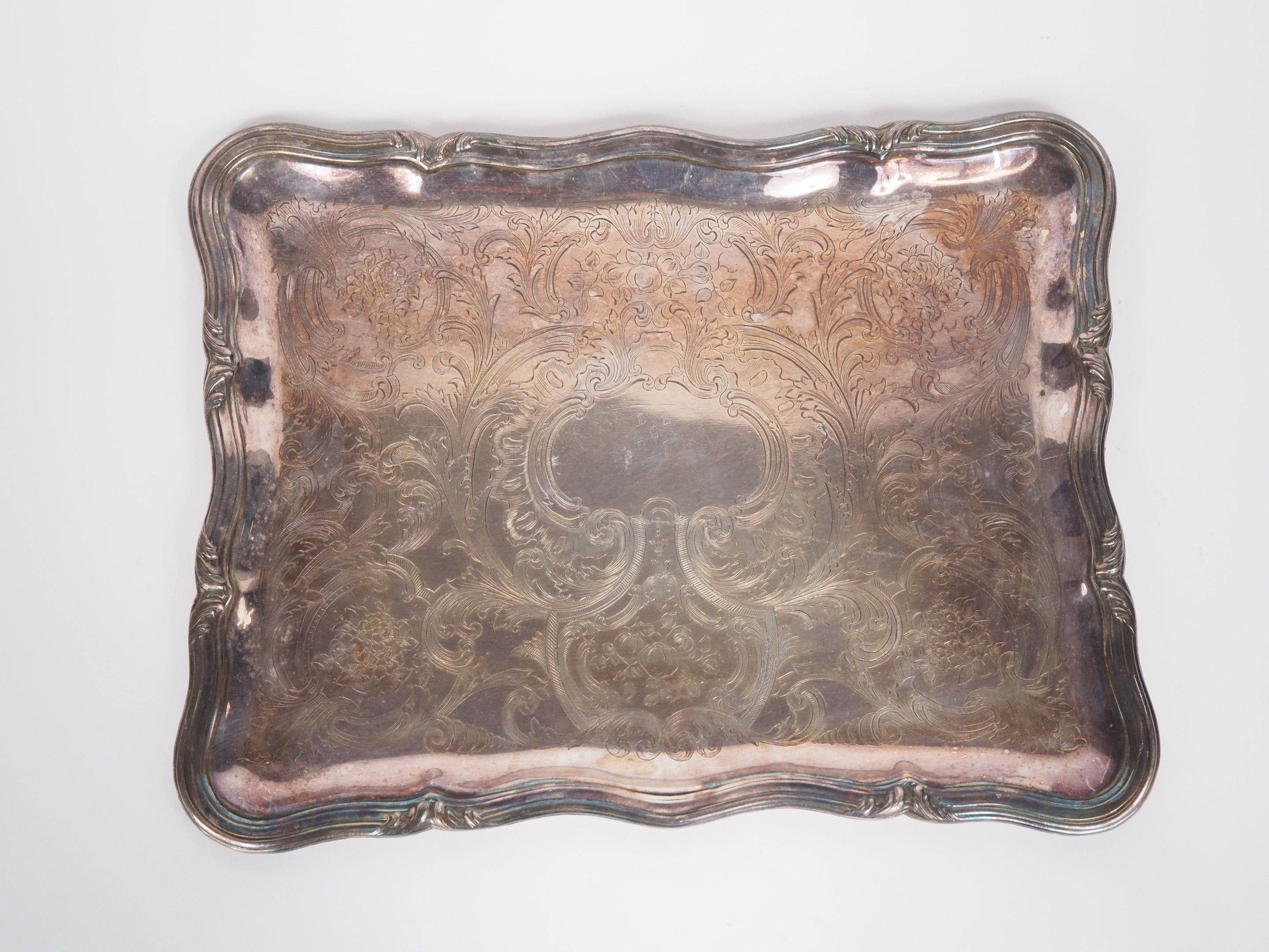 Plateau en métal argenté de style Louis XV à décor ciselé de rinceaux feuillagés, bords chantournés. Dim. 33 x 43 cm.