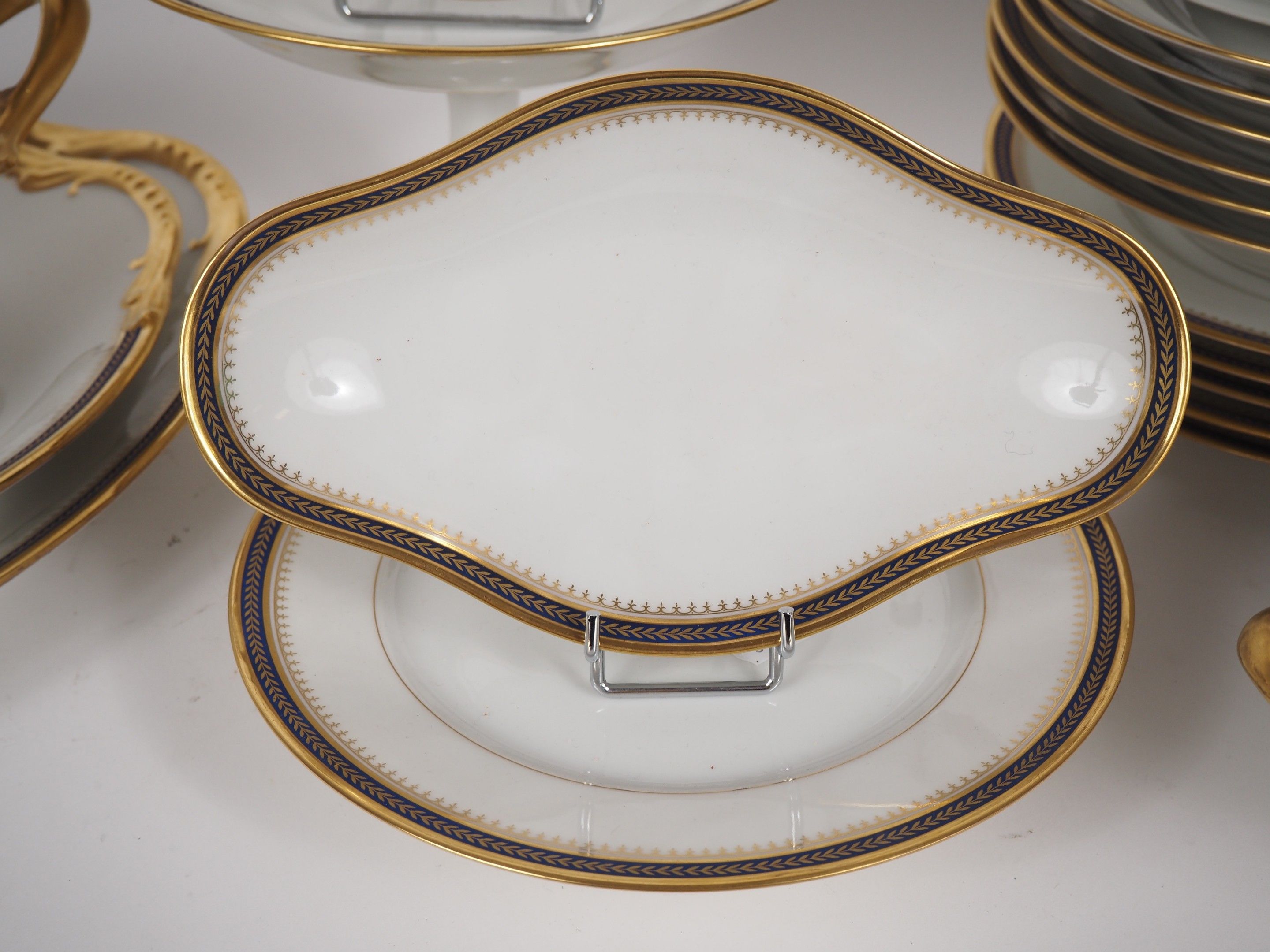 Partie de service de table en porcelaine à décor doré de liserés et de frises de laurier, comprenant :