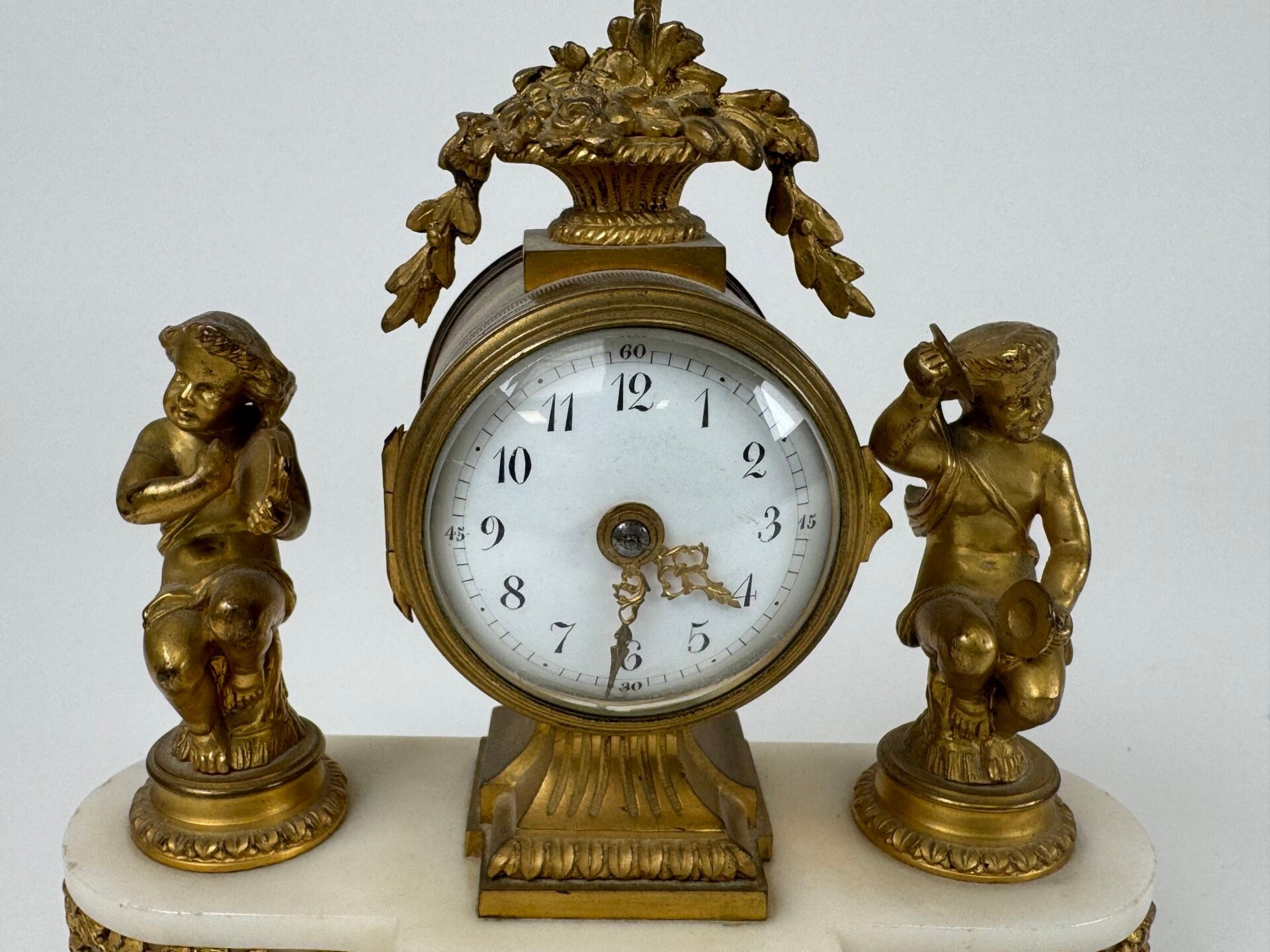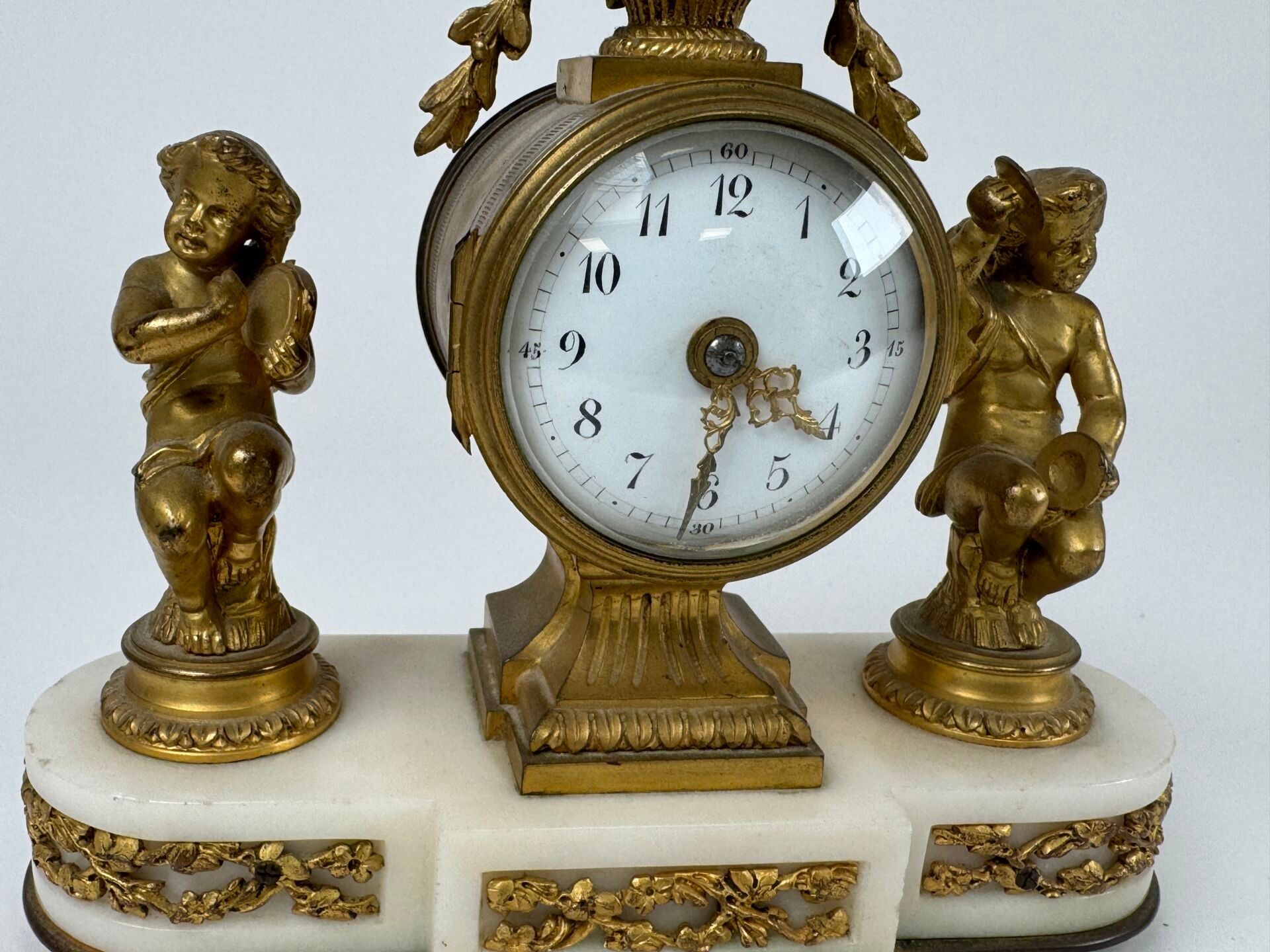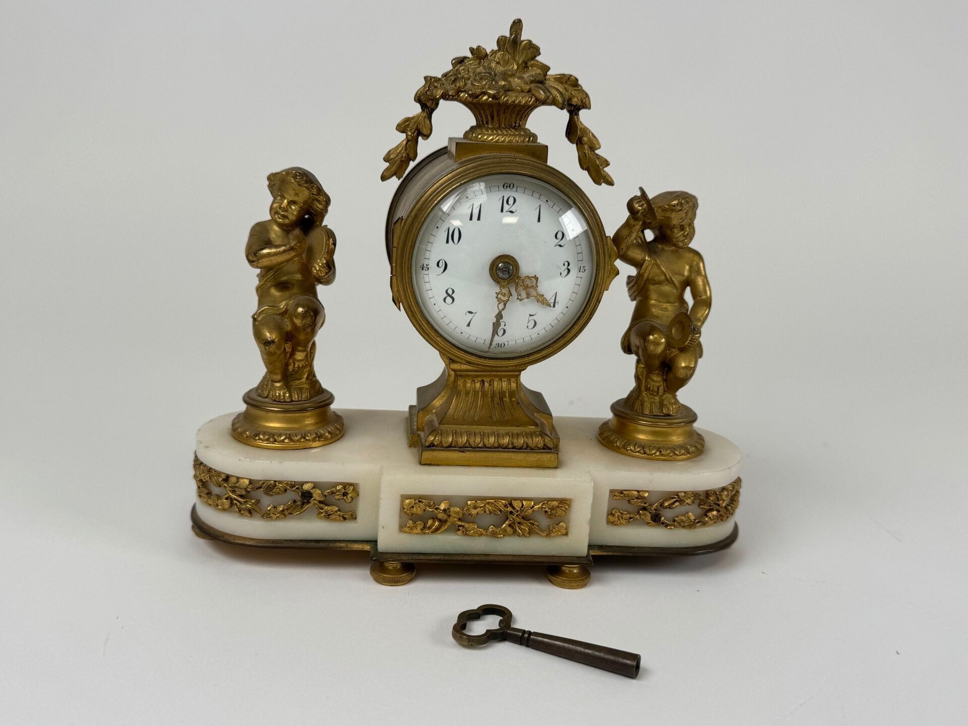 Petite pendule en bronze doré et albâtre à décor de deux Amours Musiciens.