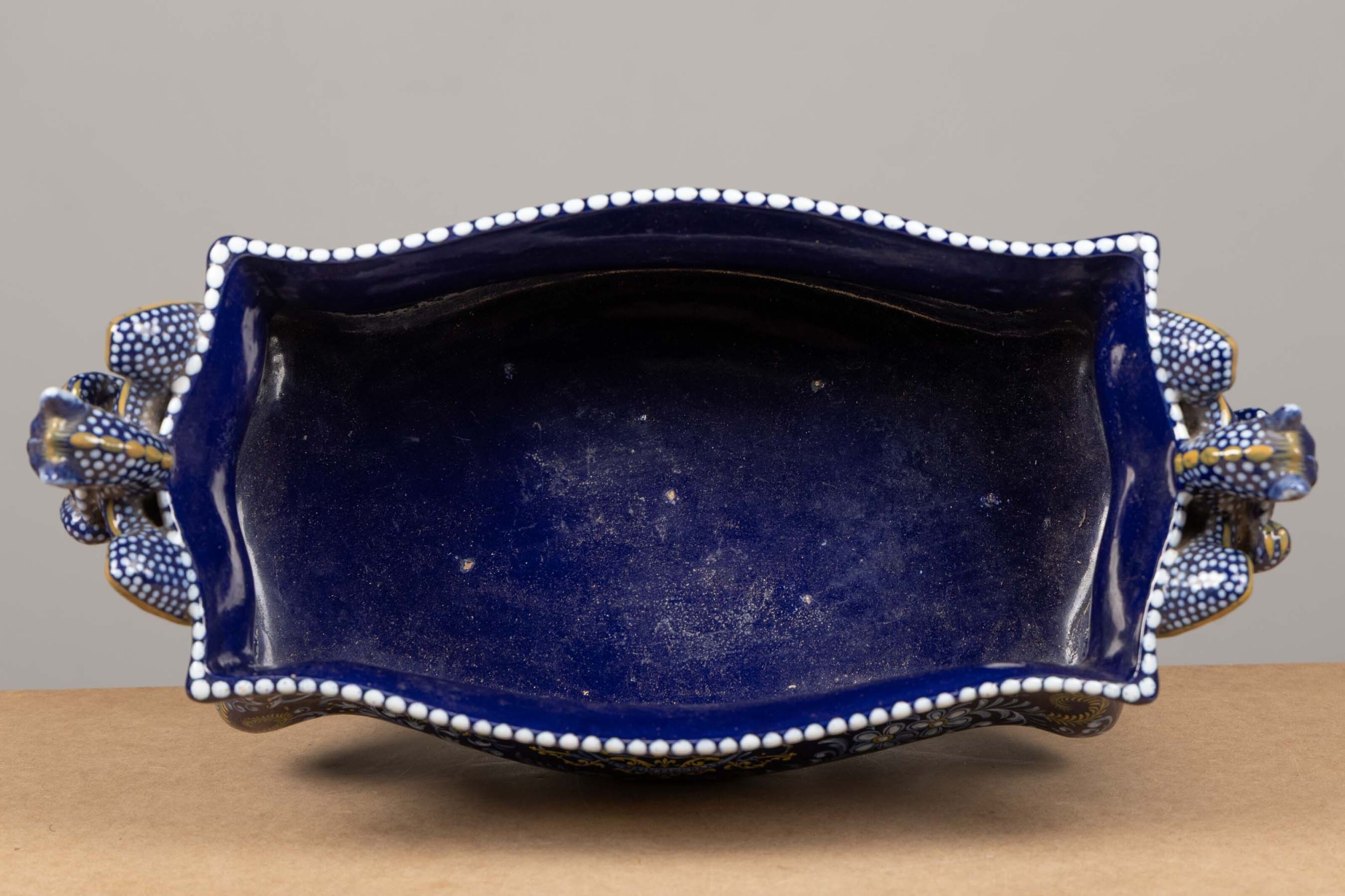 Jardinière en faïence décor en blanc fixe sur fond bleu profond.