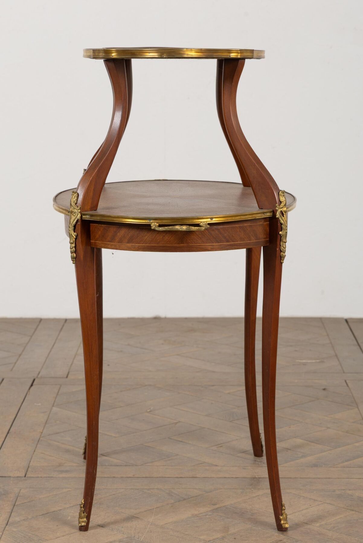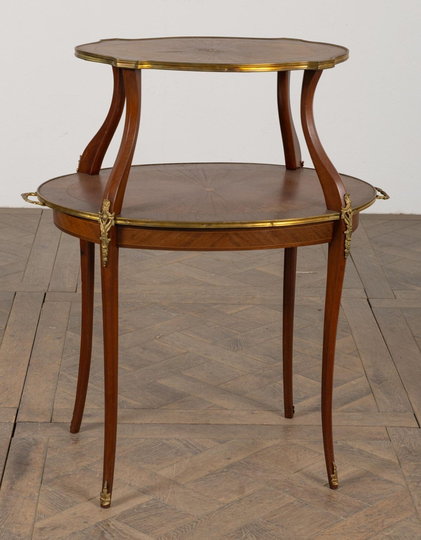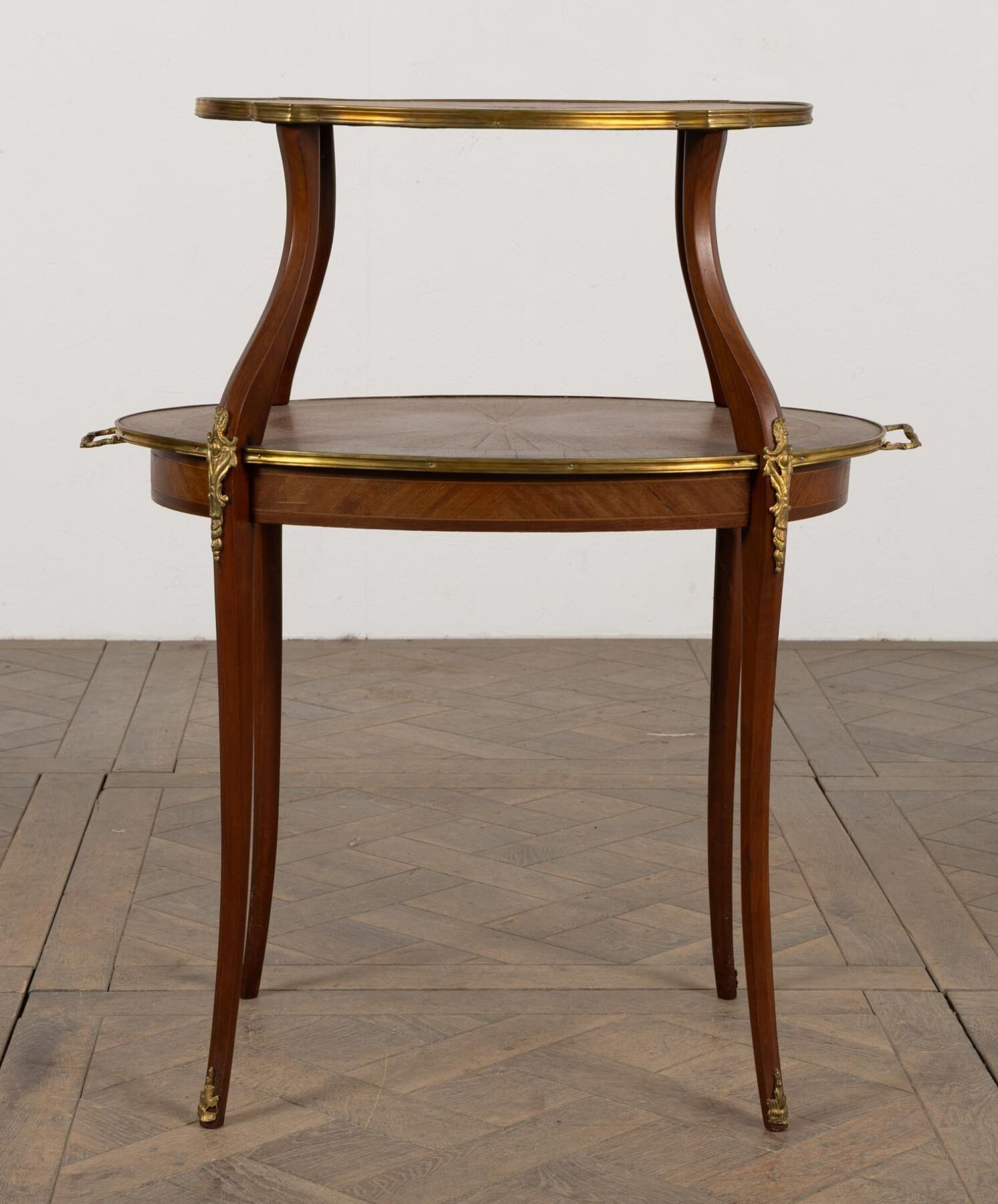 Table à thé à deux plateaux, en marqueterie de bois de placage et ornementation de bronze doré.