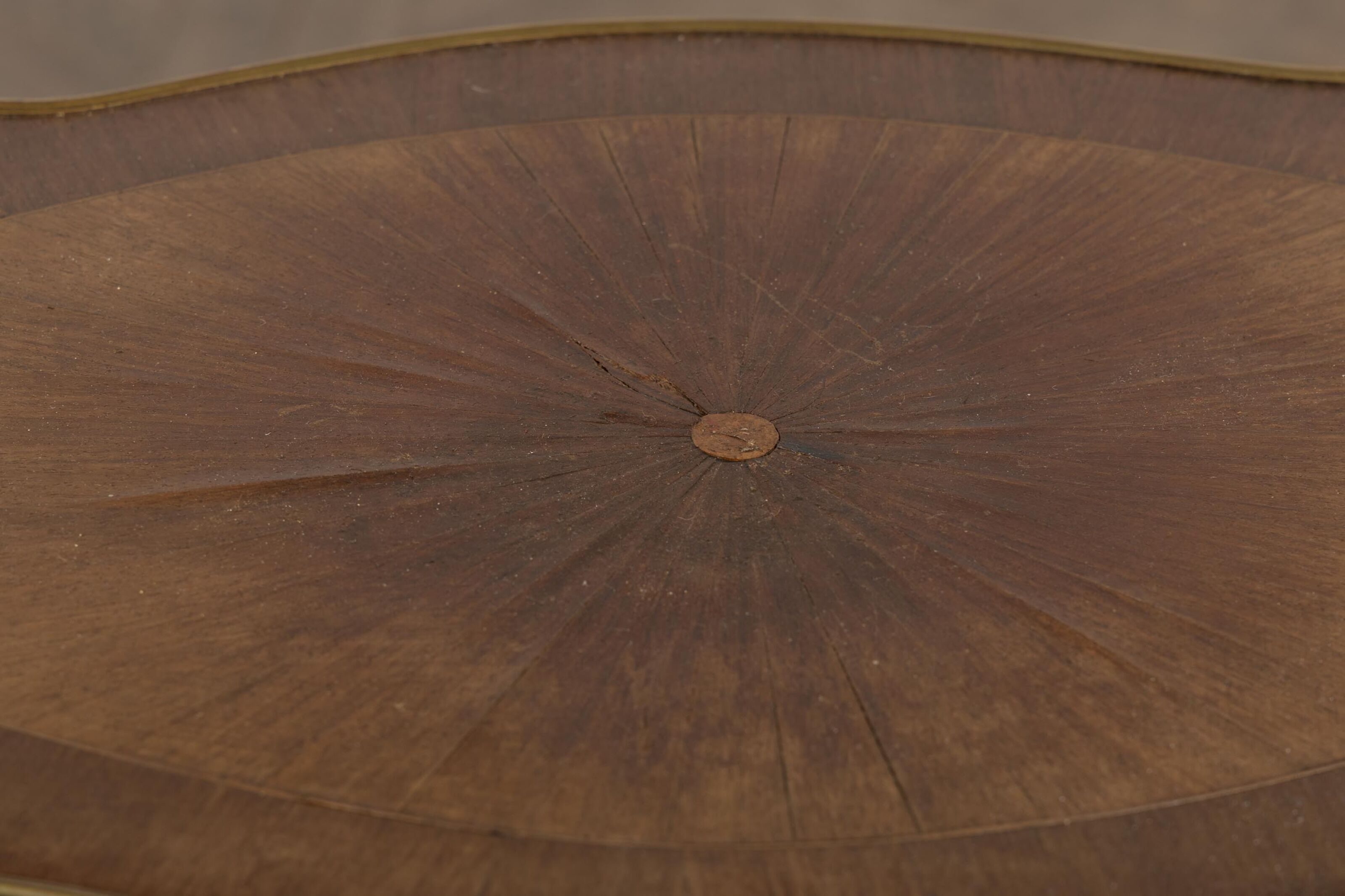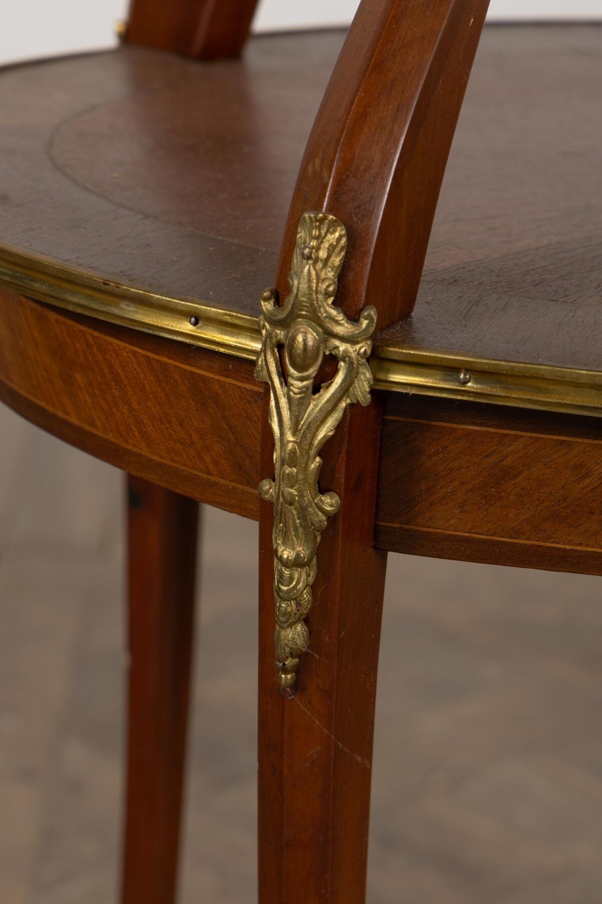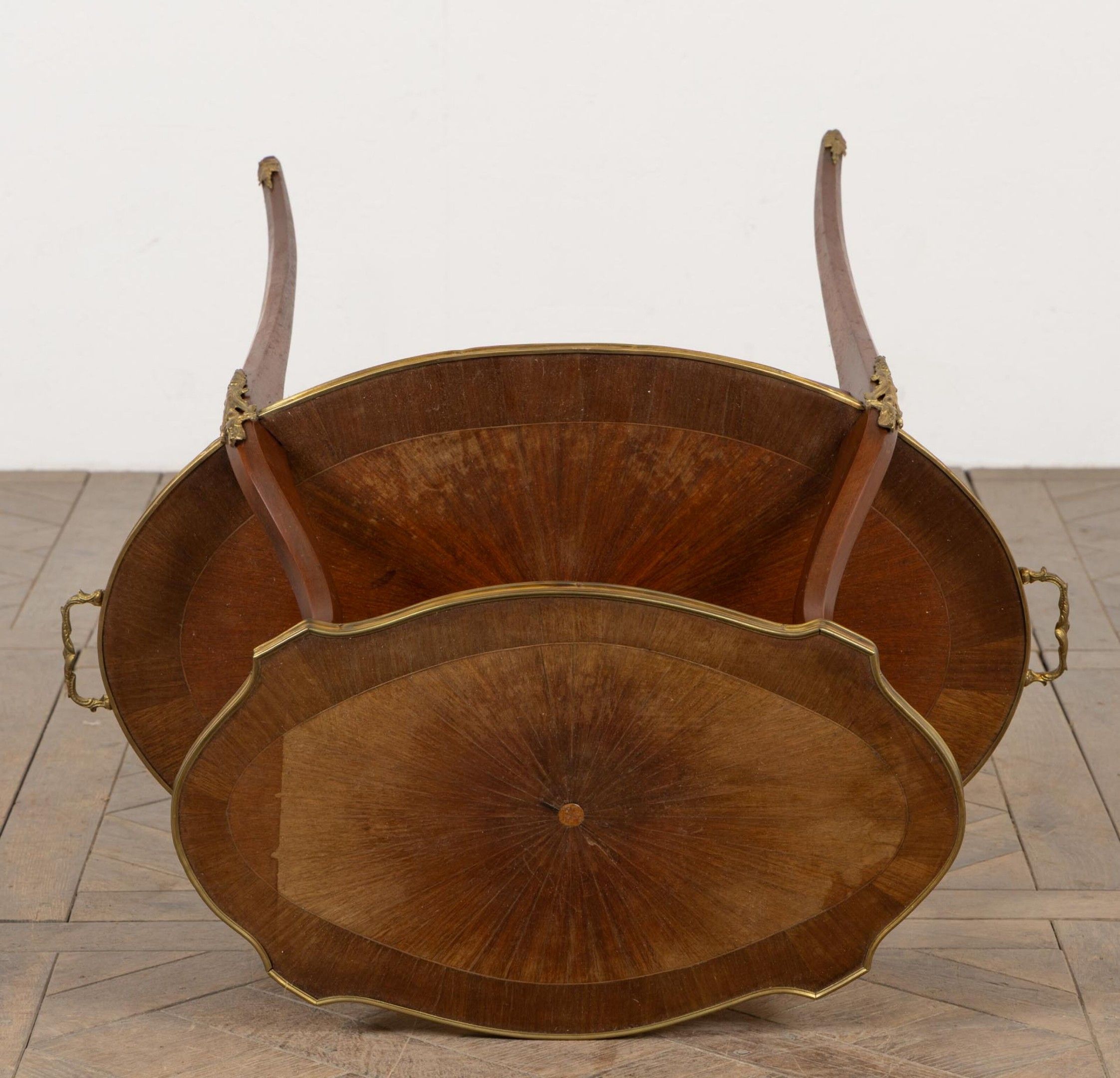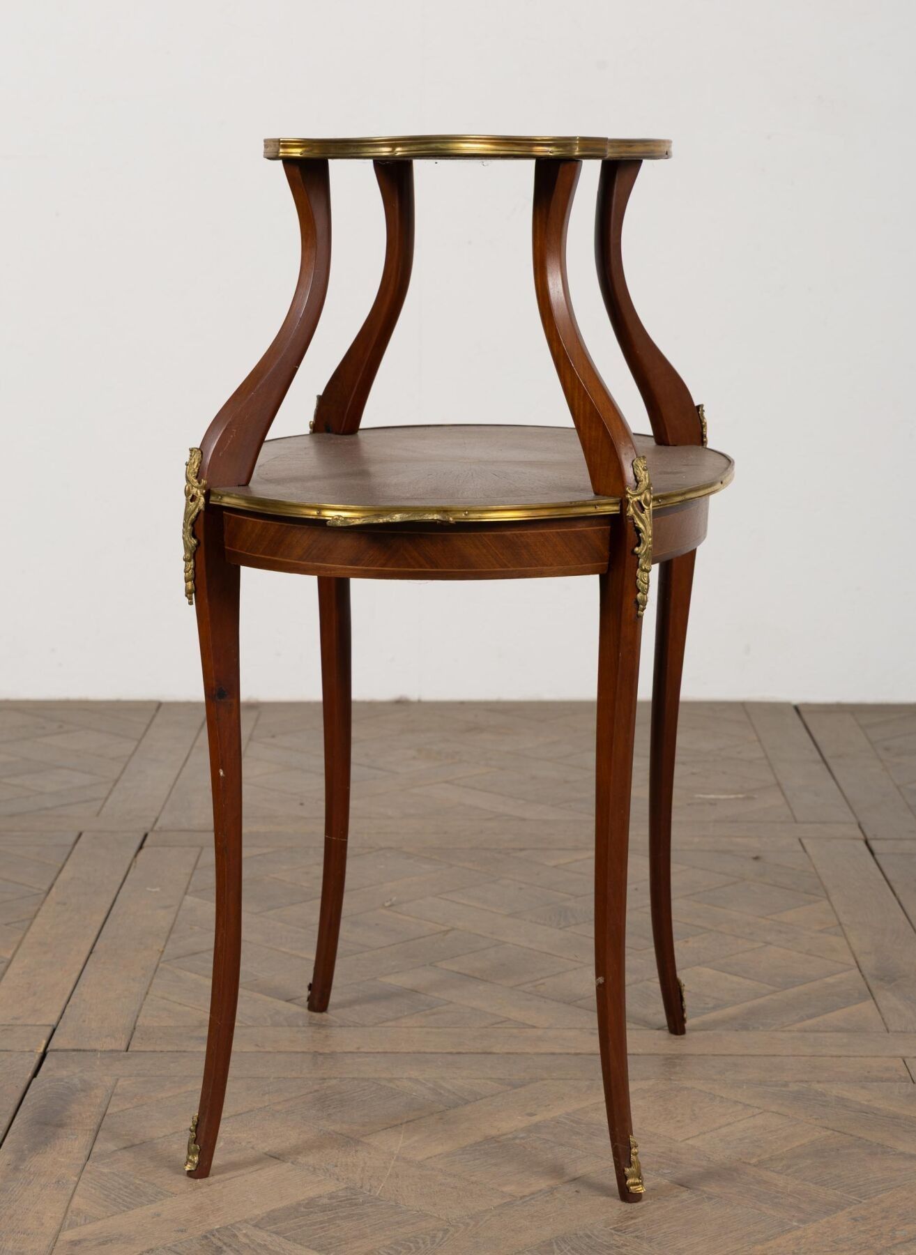 Table à thé à deux plateaux, en marqueterie de bois de placage et ornementation de bronze doré.