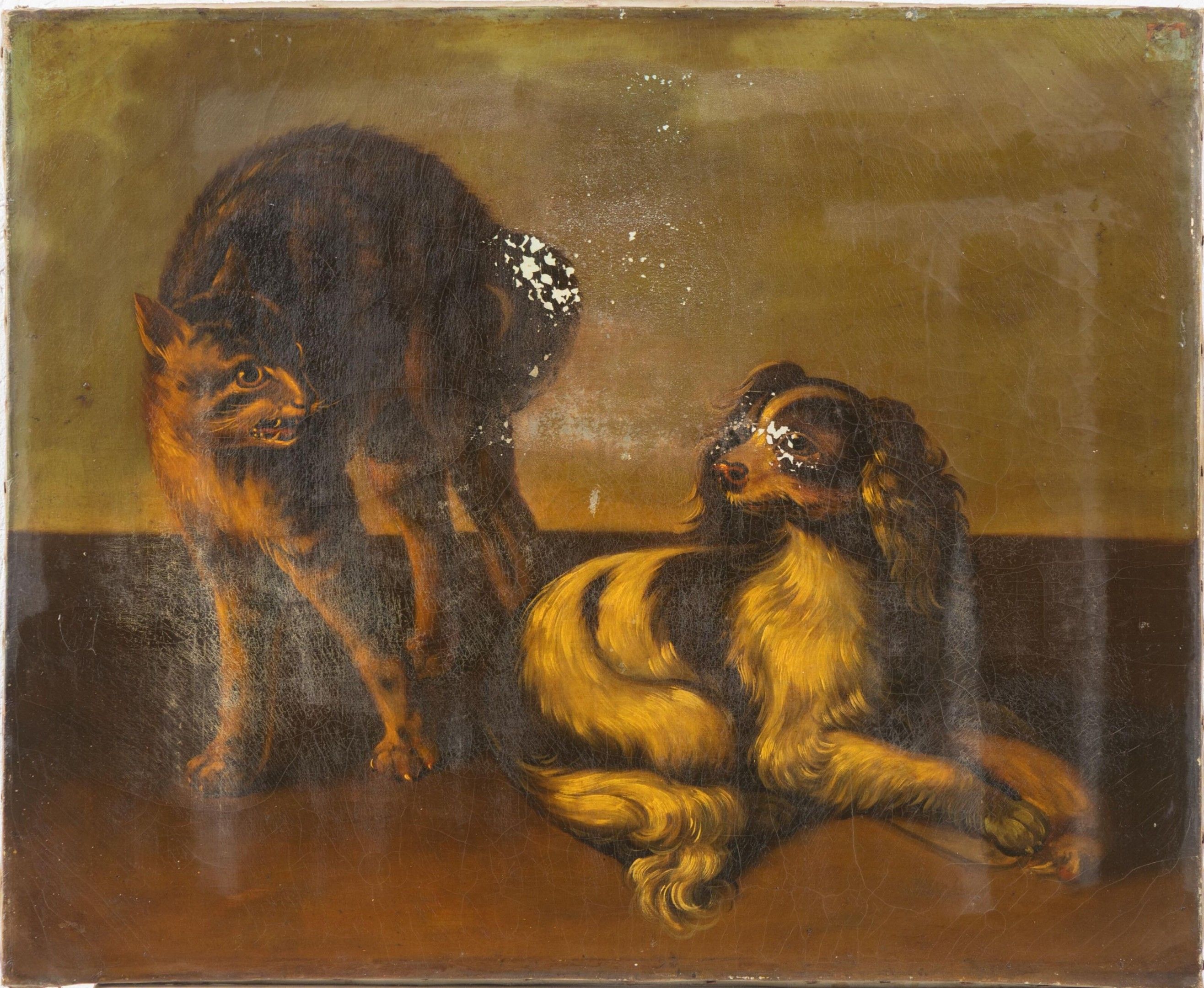 Chat tentant d'effrayer un chien cavalier King Charles.