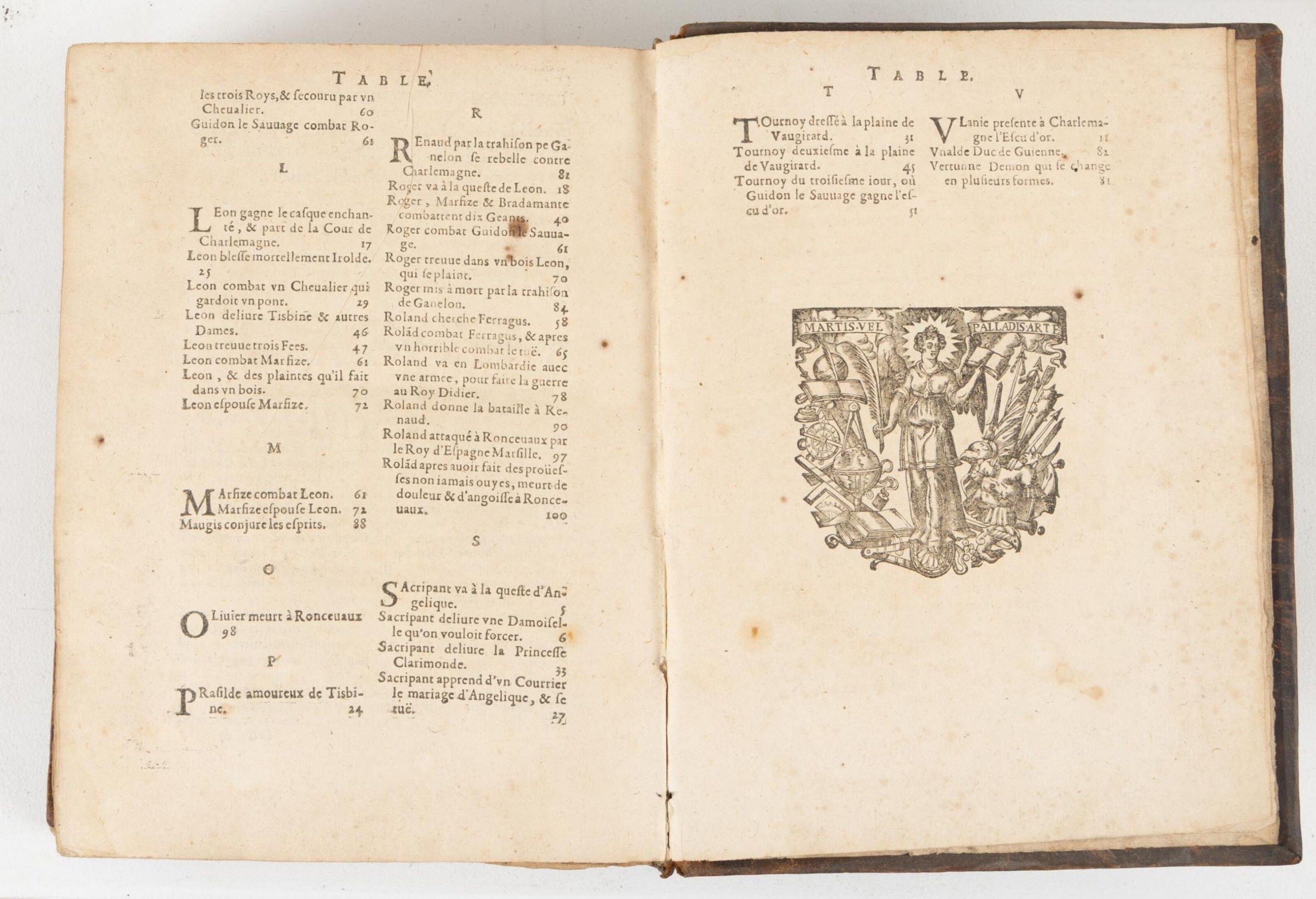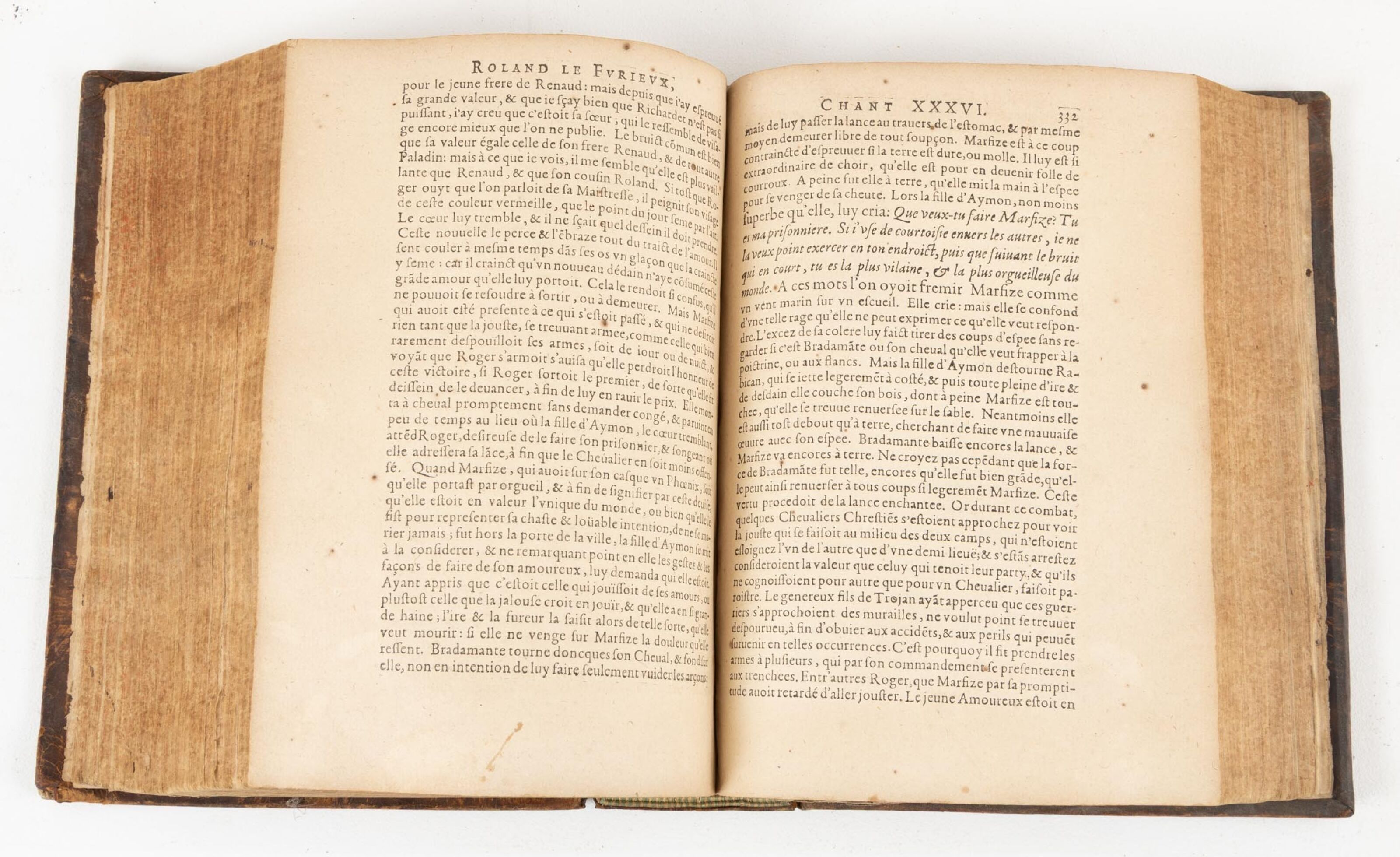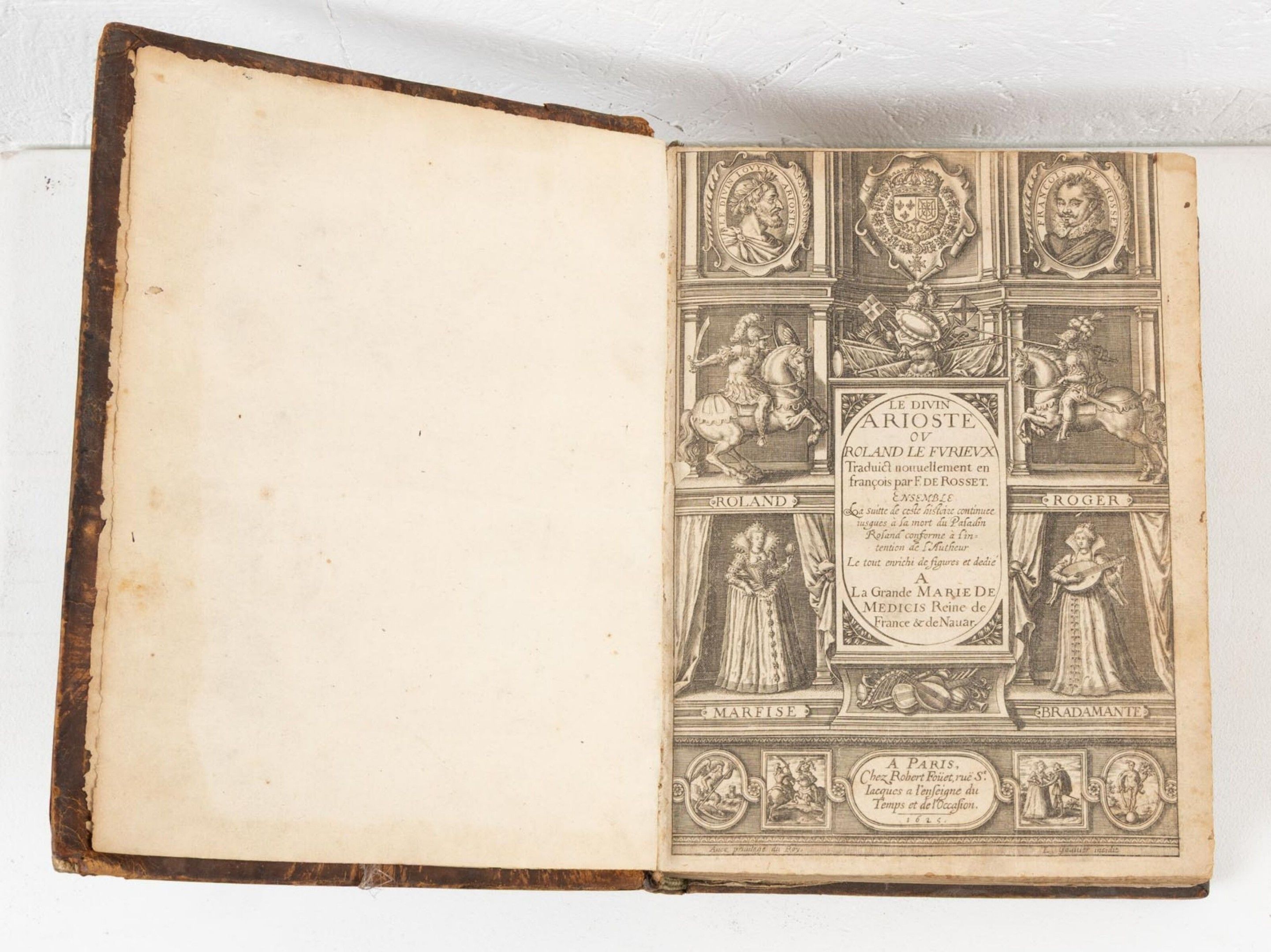 L'ARIOSTE & ROSSET (François, De). Le divin Arioste ou Le Roland Le Furieux. Traduit nouuellement en françois par F. DE ROSSET (...) le tout dédié à la Grande Marie de Médicis Reine de France & de Nauar. Paris, Robert Foüet, rue Saint-Jacques à l'enseigne du Temps et de l'Occasion, 1625. Un vol. in-4 veau basane, dos à cinq nerfs orné à froid, pièce de titre. Ouvrage enrichi de nombreuses gravures sur bois illustrant les chants par Léonard GAULTIER (1561-1641), dont le frontispice. manques