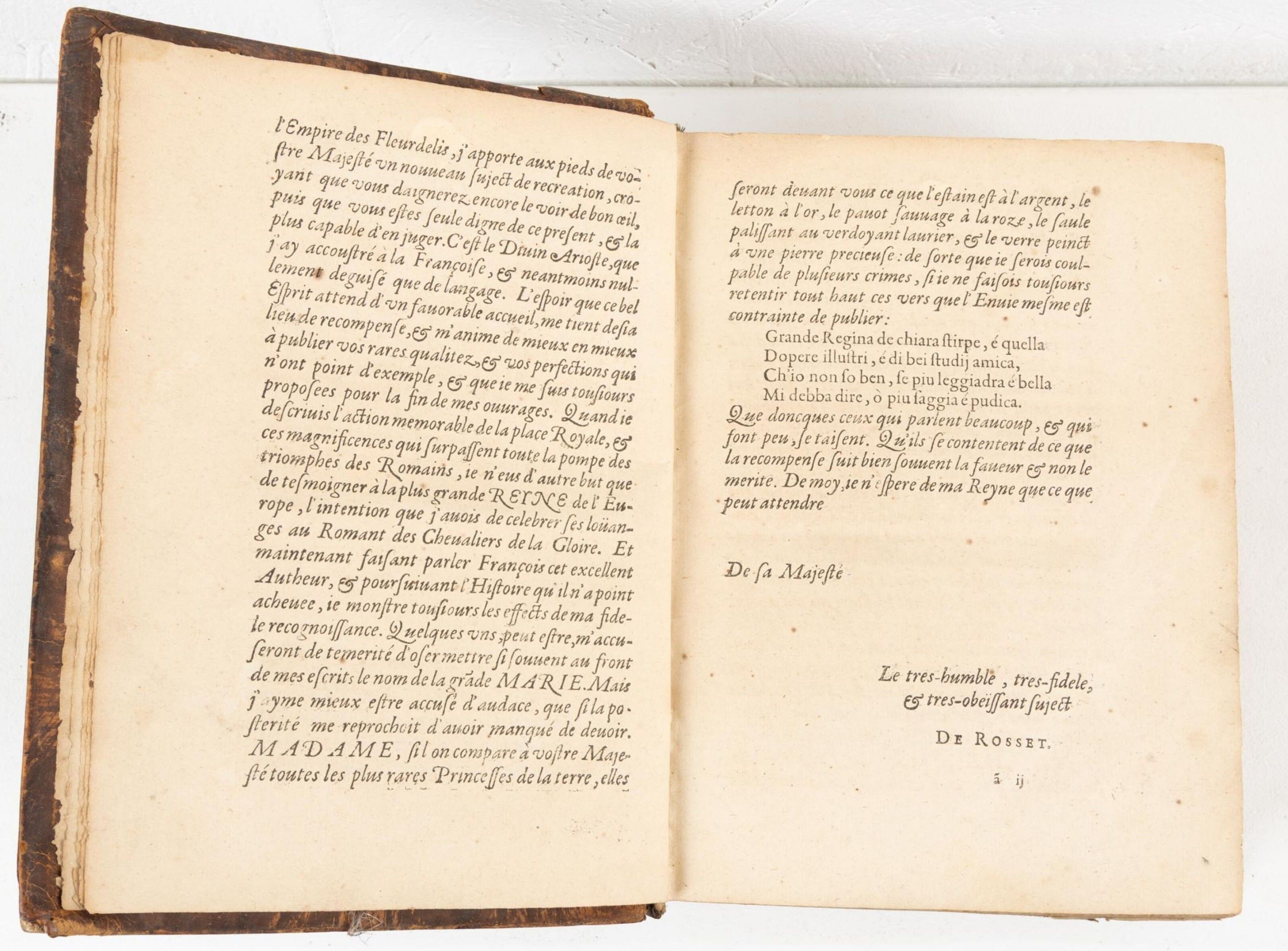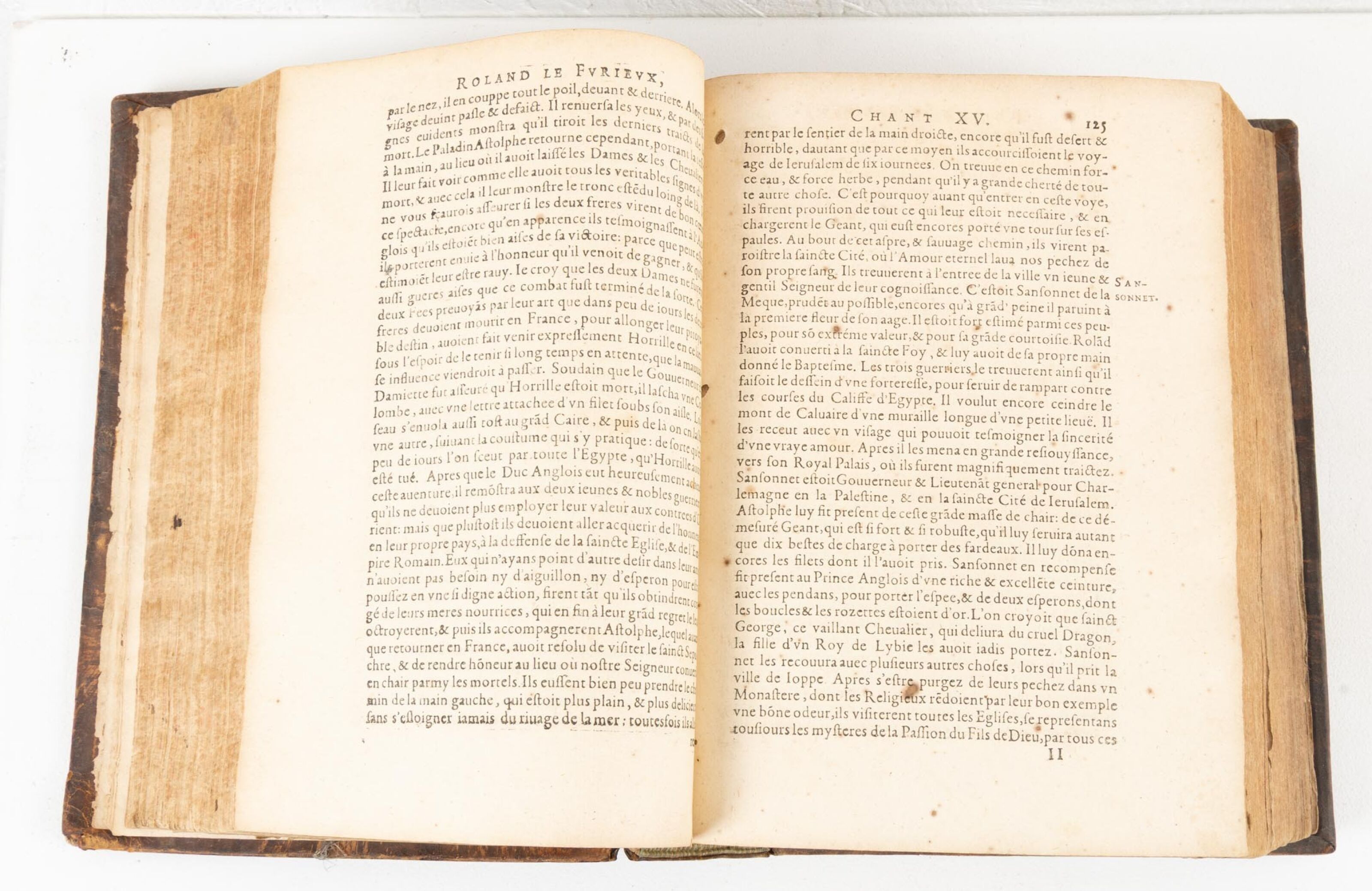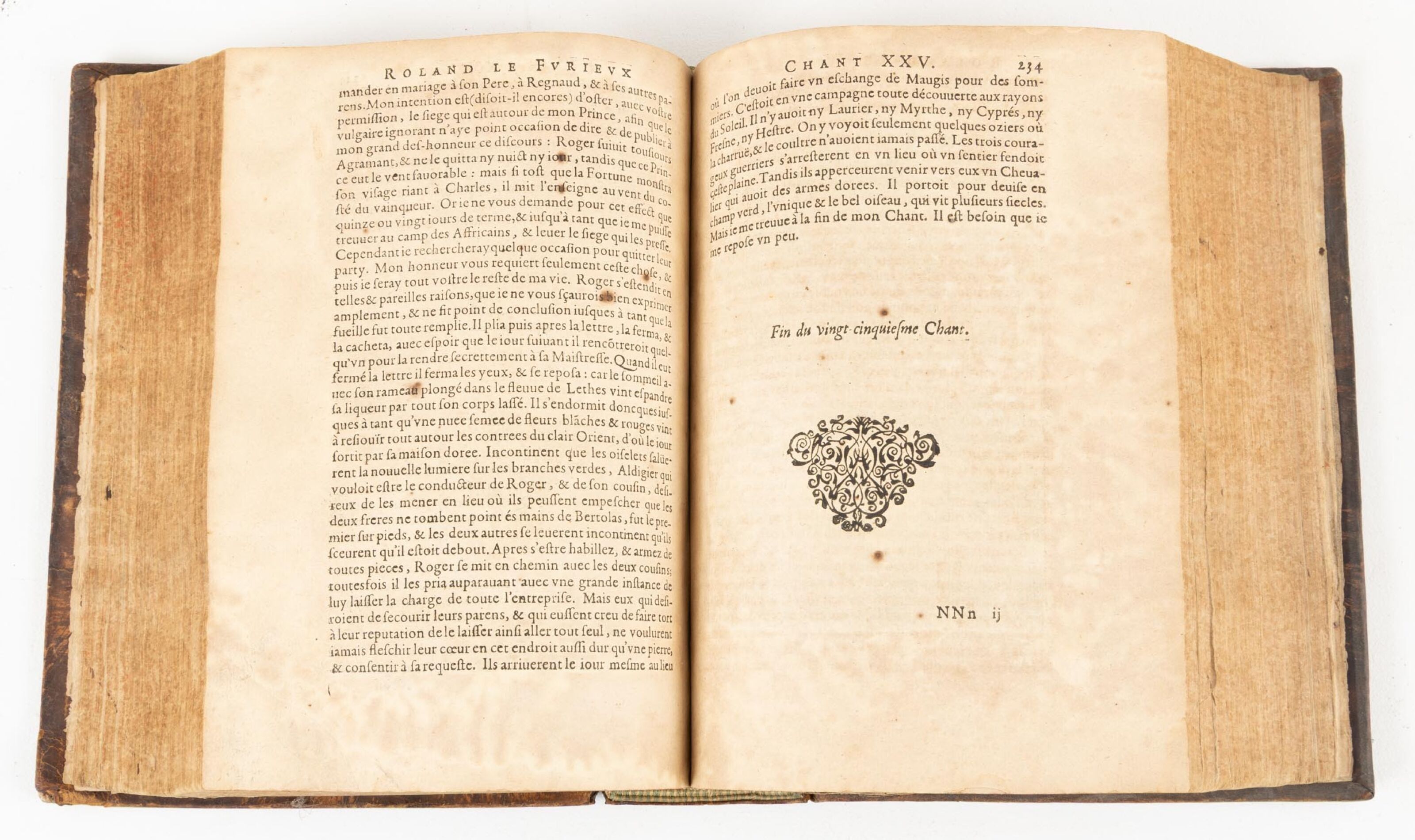 L'ARIOSTE & ROSSET (François, De). Le divin Arioste ou Le Roland Le Furieux. Traduit nouuellement en françois par F. DE ROSSET (...) le tout dédié à la Grande Marie de Médicis Reine de France & de Nauar. Paris, Robert Foüet, rue Saint-Jacques à l'enseigne du Temps et de l'Occasion, 1625. Un vol. in-4 veau basane, dos à cinq nerfs orné à froid, pièce de titre. Ouvrage enrichi de nombreuses gravures sur bois illustrant les chants par Léonard GAULTIER (1561-1641), dont le frontispice. manques
