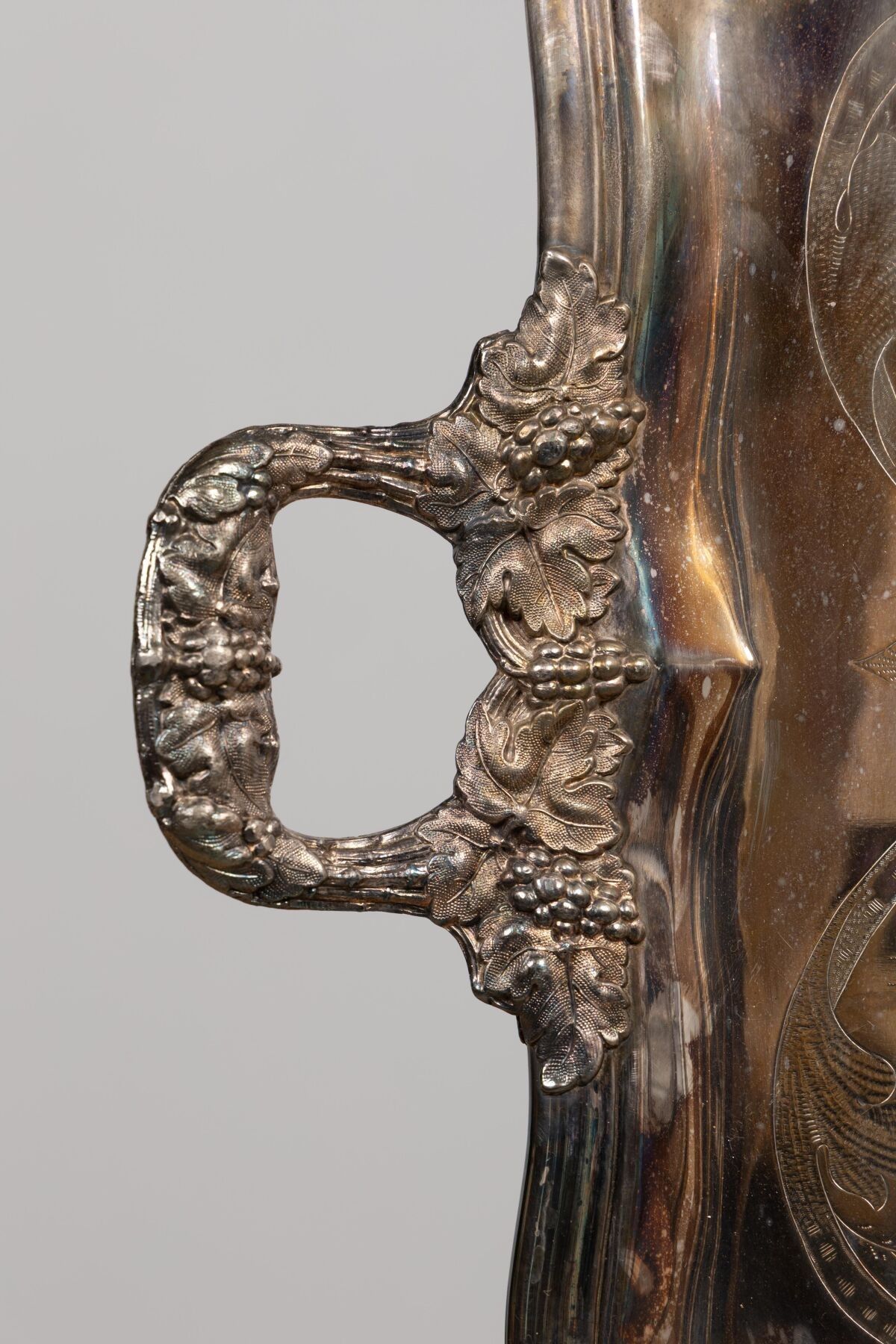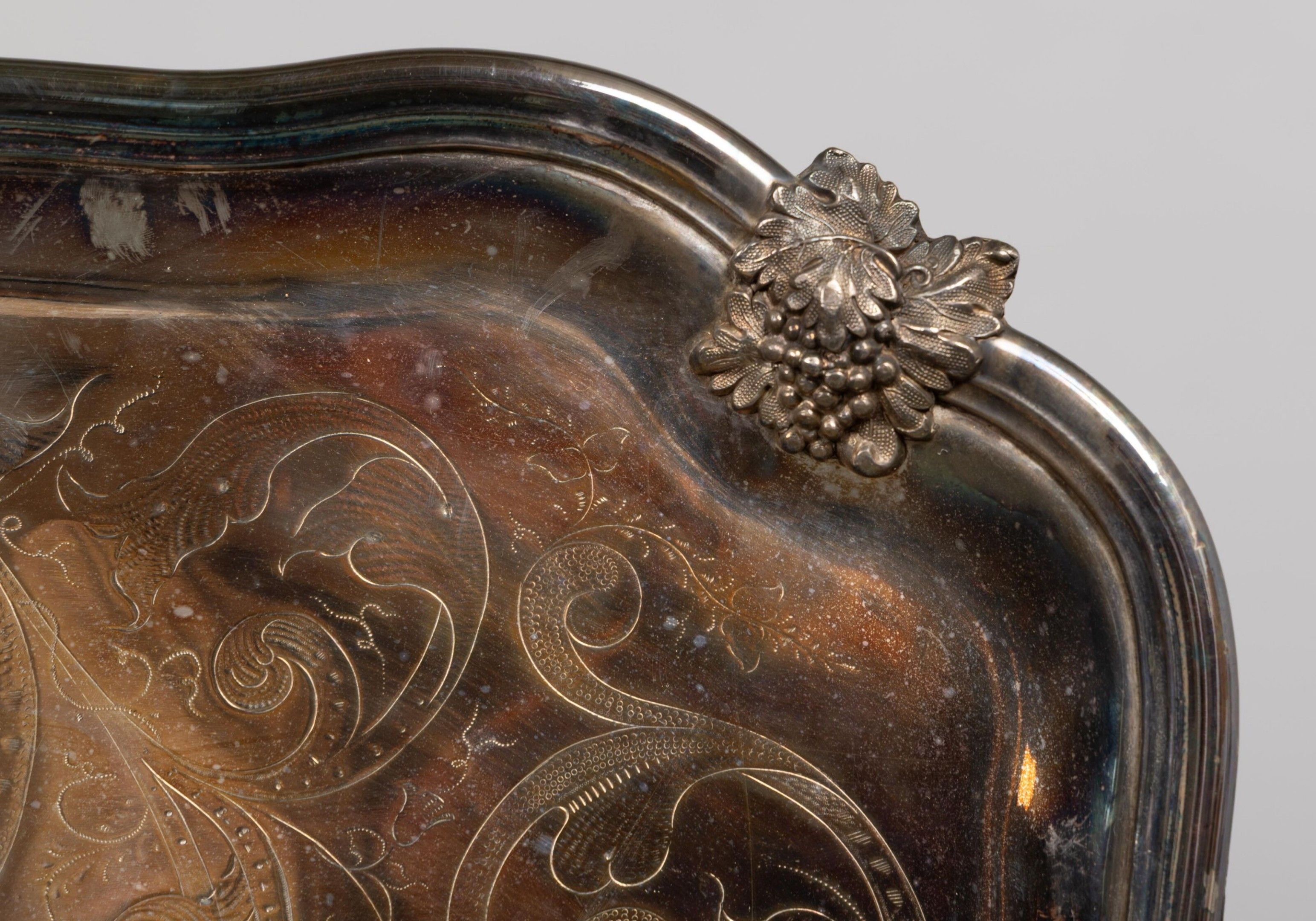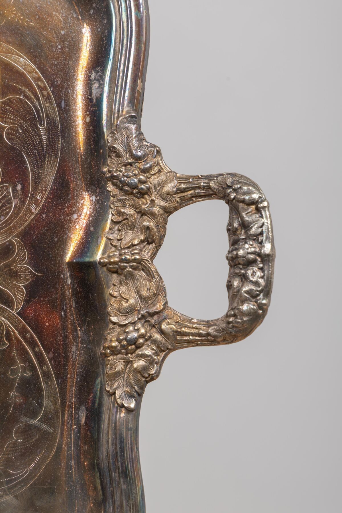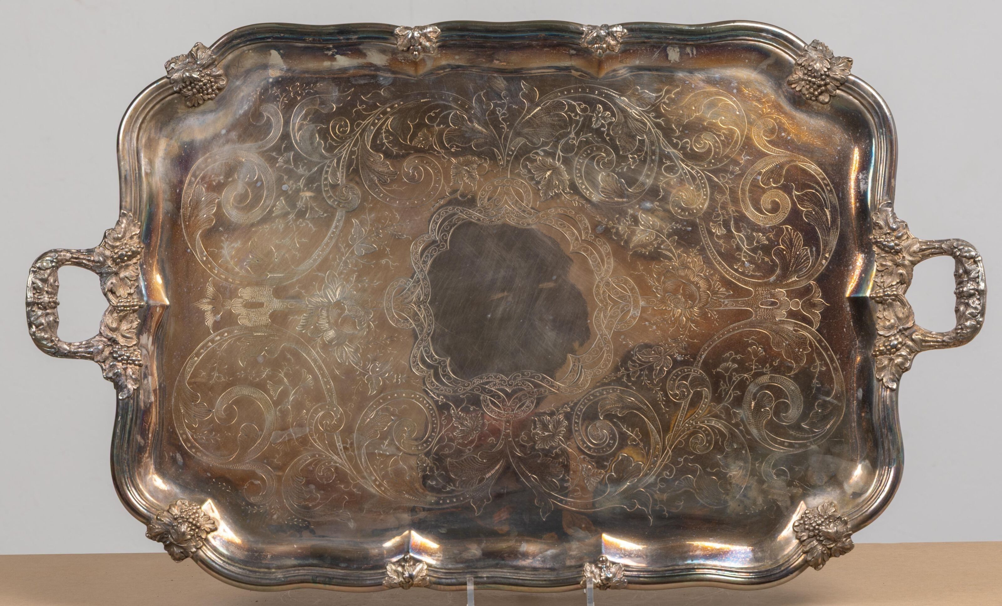 Grand plateau en métal argenté à deux anses latérales et décor finement gravé.