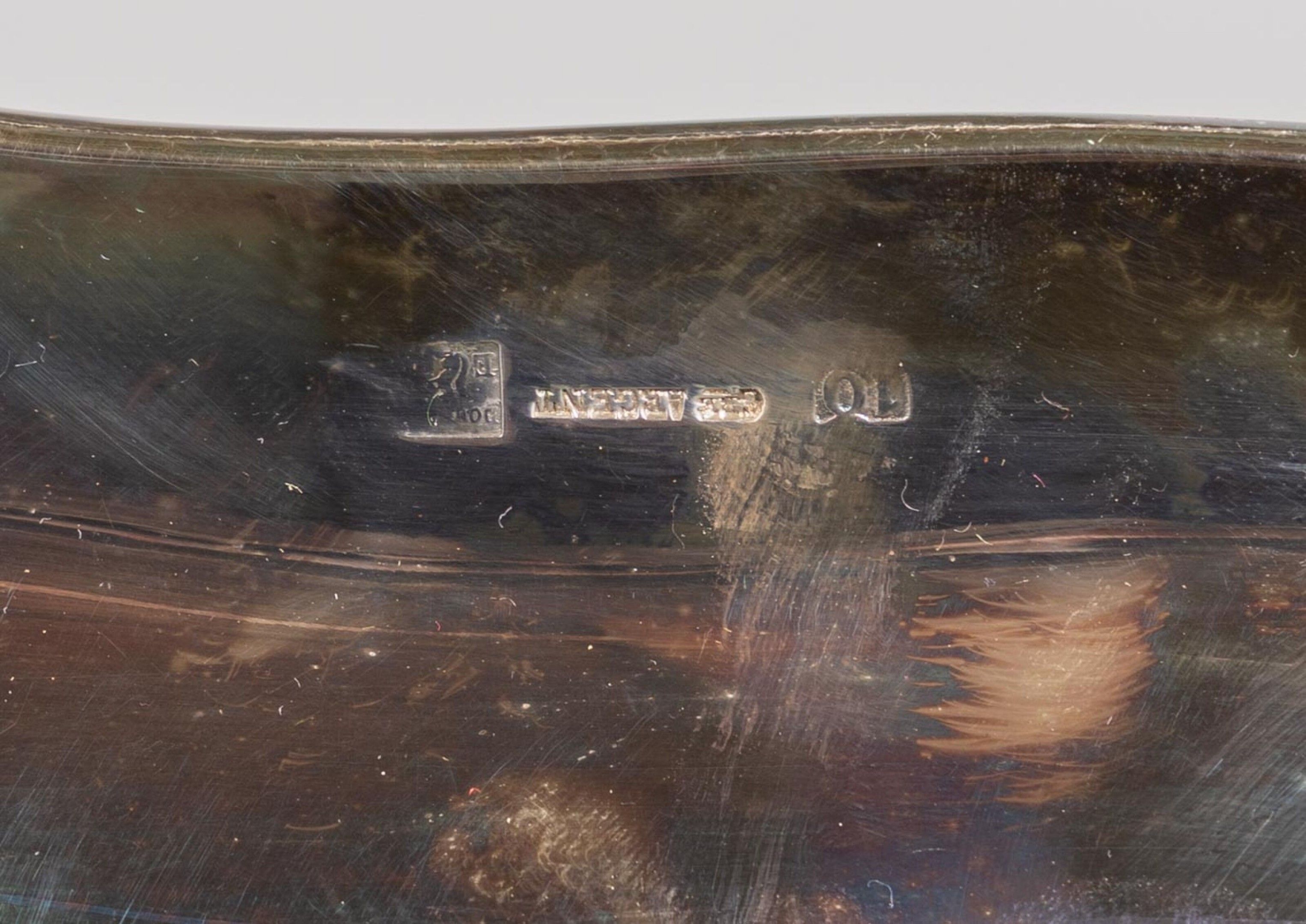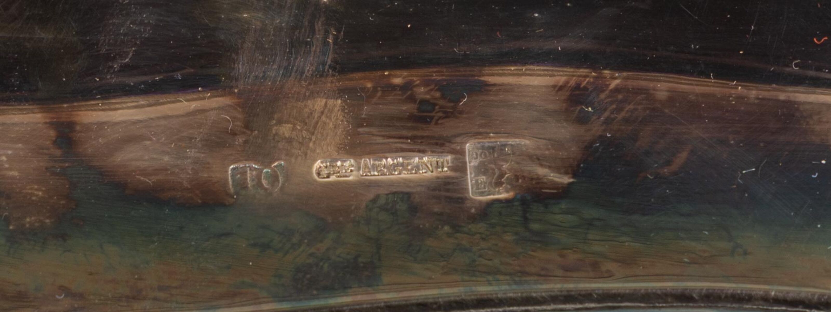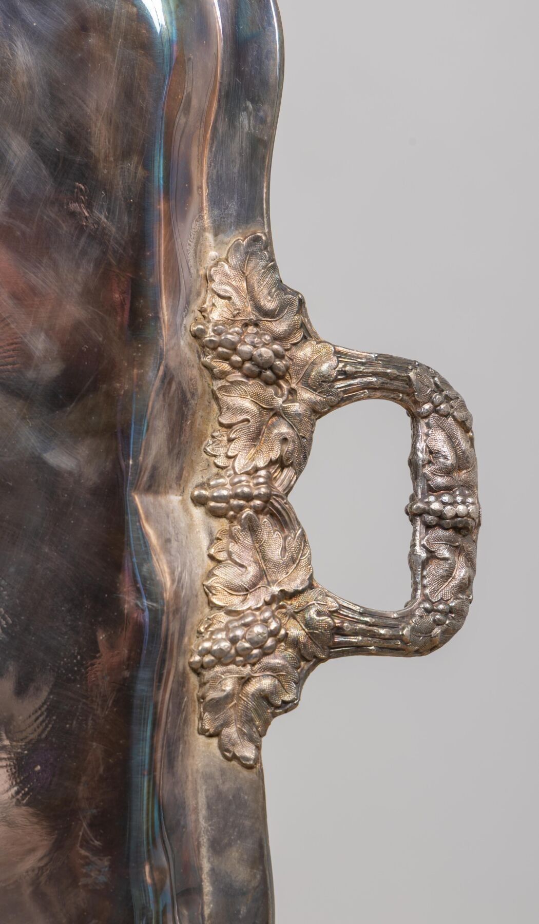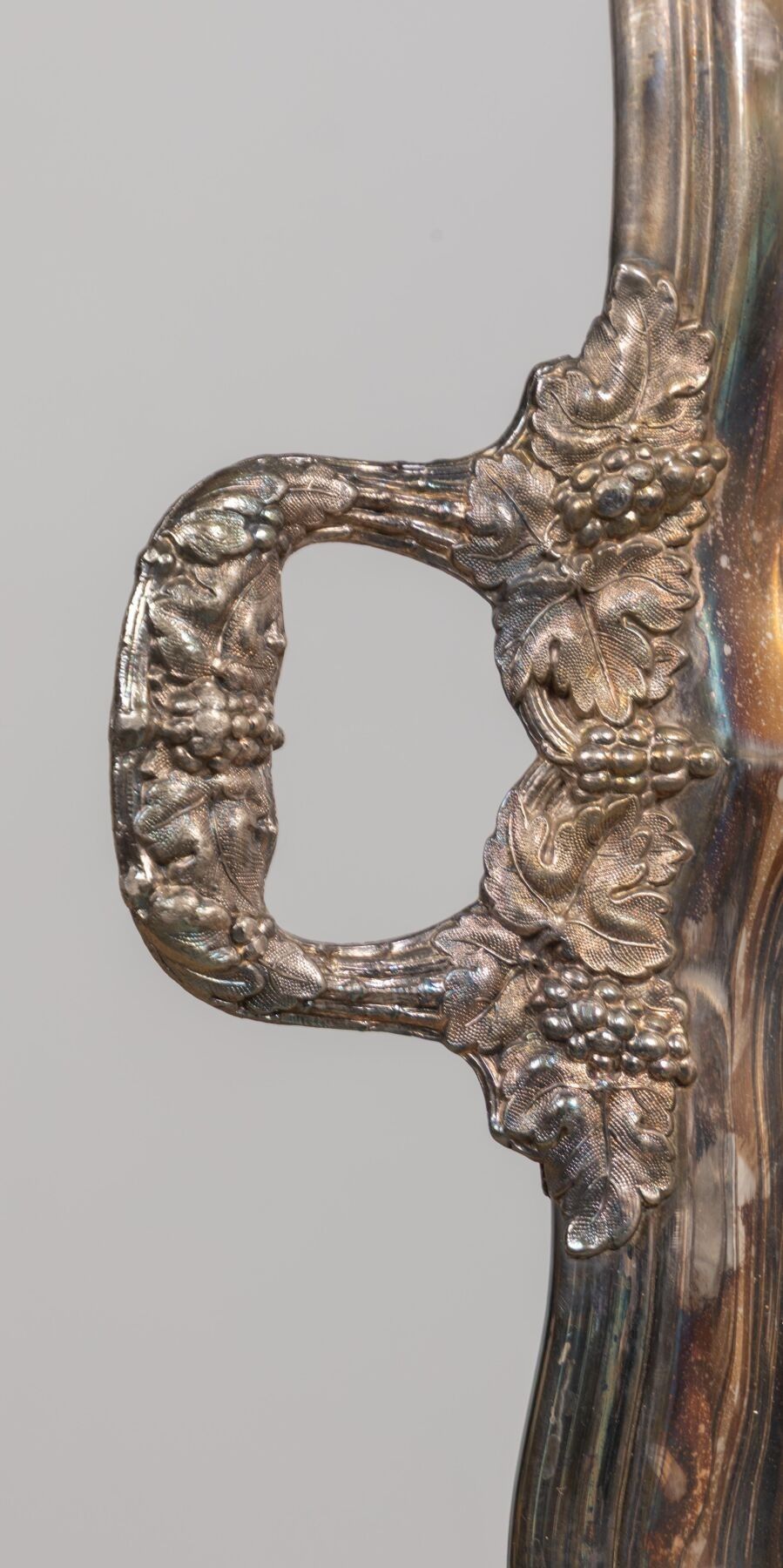 Grand plateau en métal argenté à deux anses latérales et décor finement gravé.