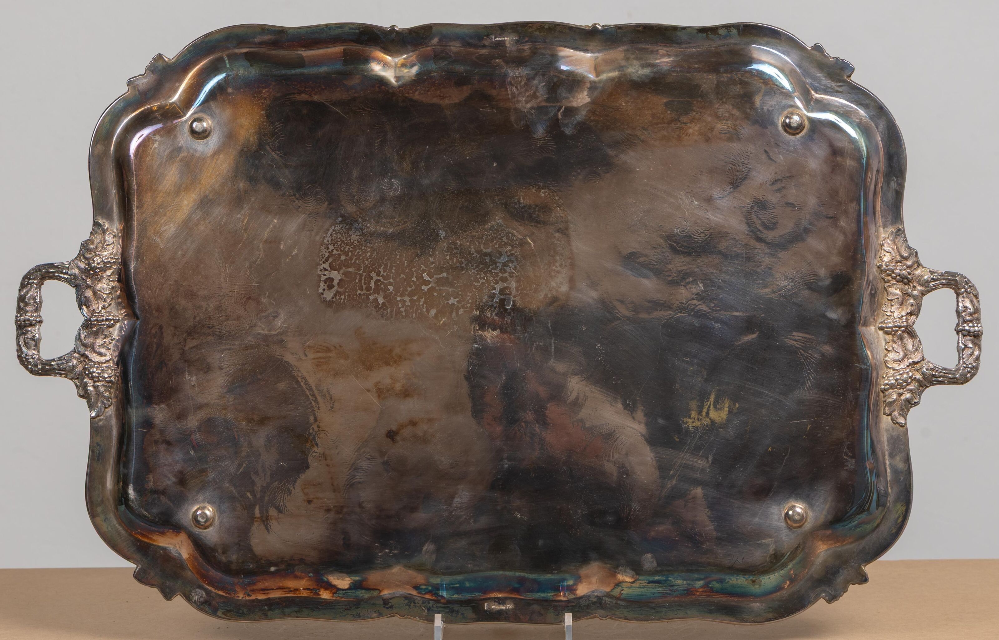 Grand plateau en métal argenté à deux anses latérales et déc…