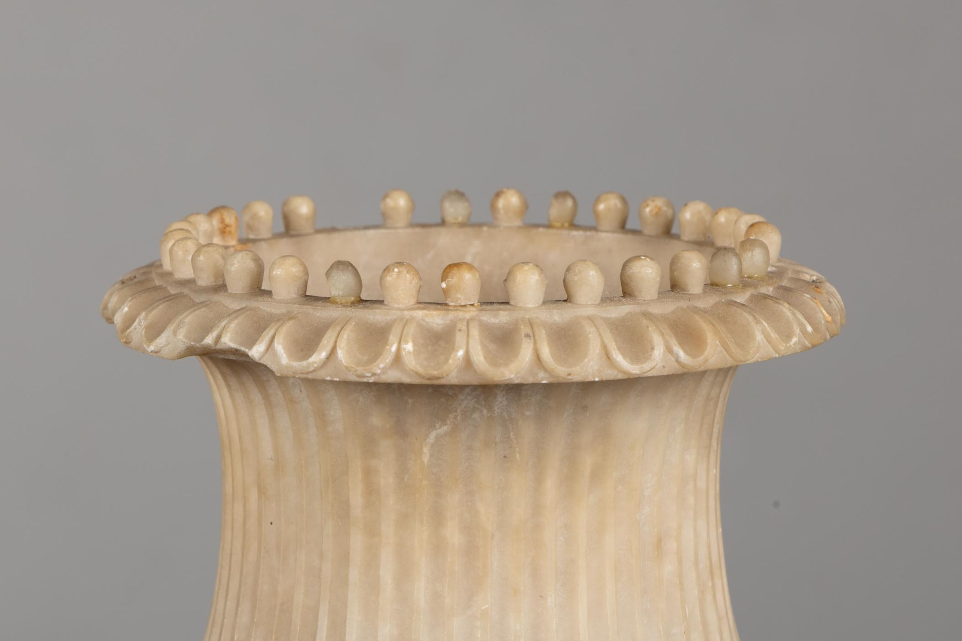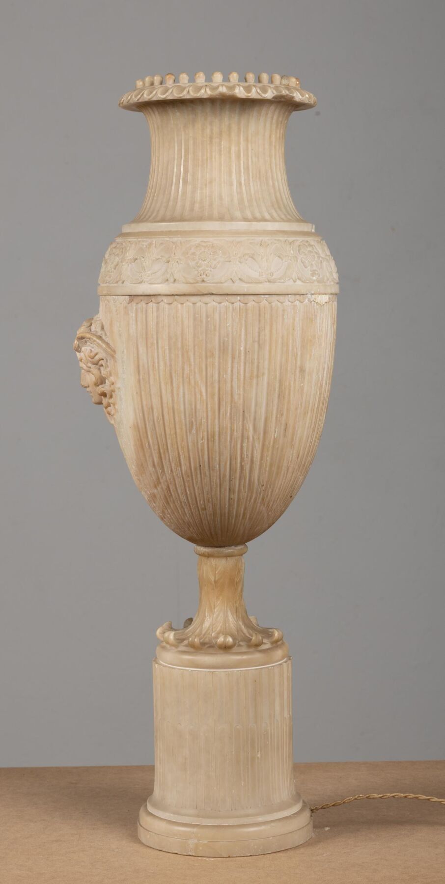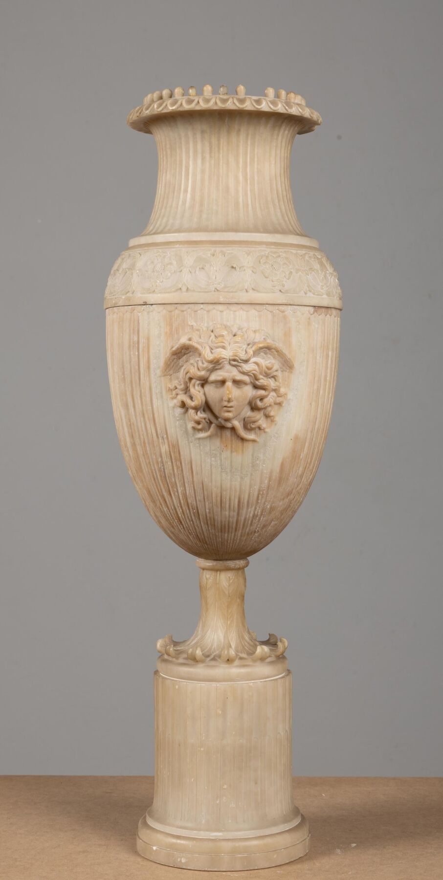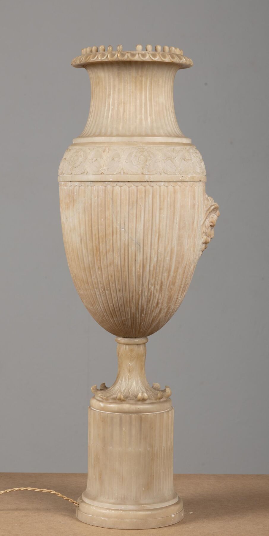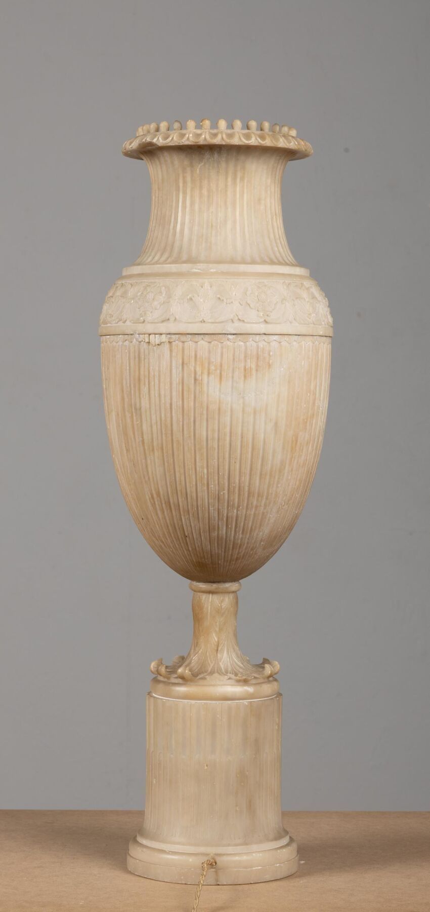 Vase balustre reposant sur un socle adhérant en albâtre fine…
