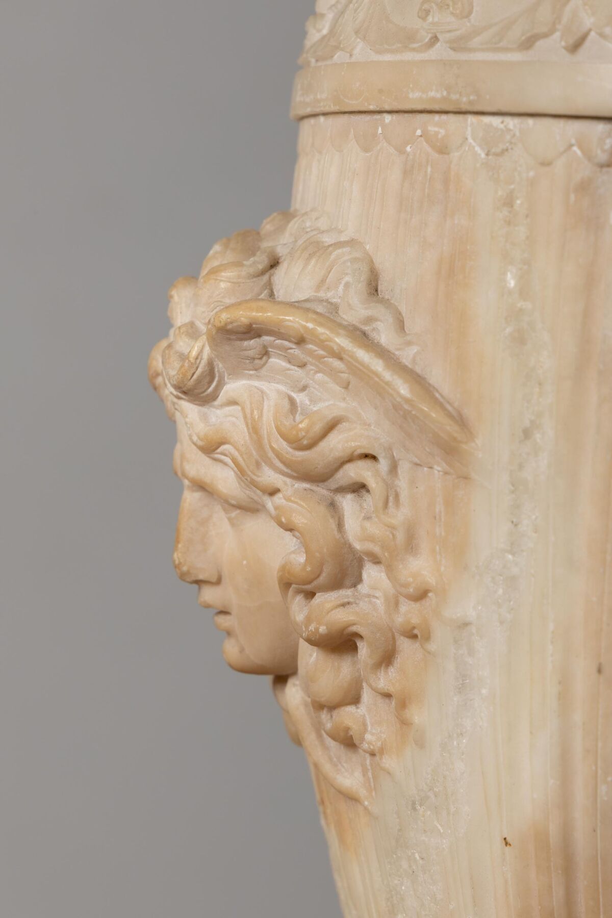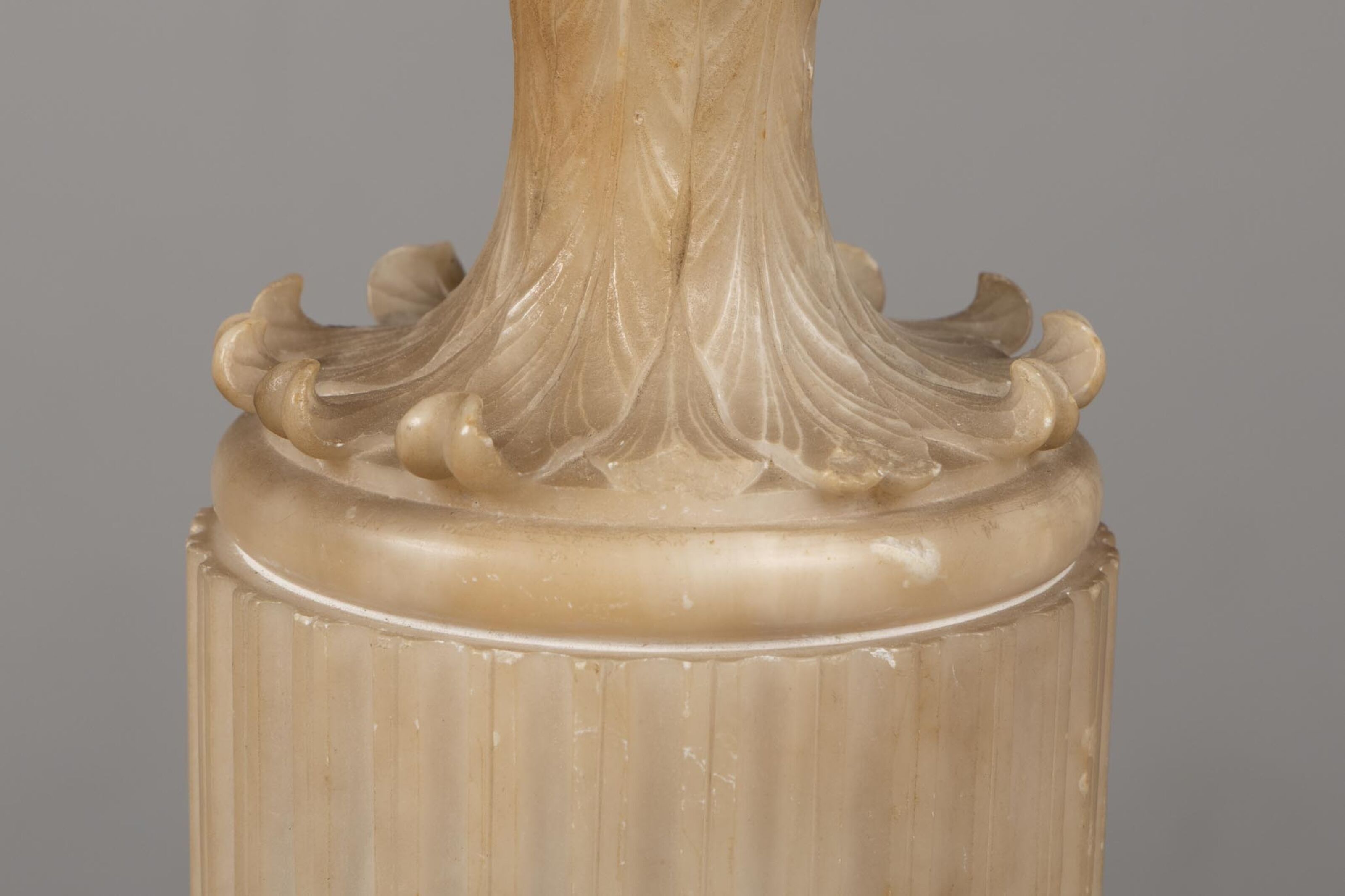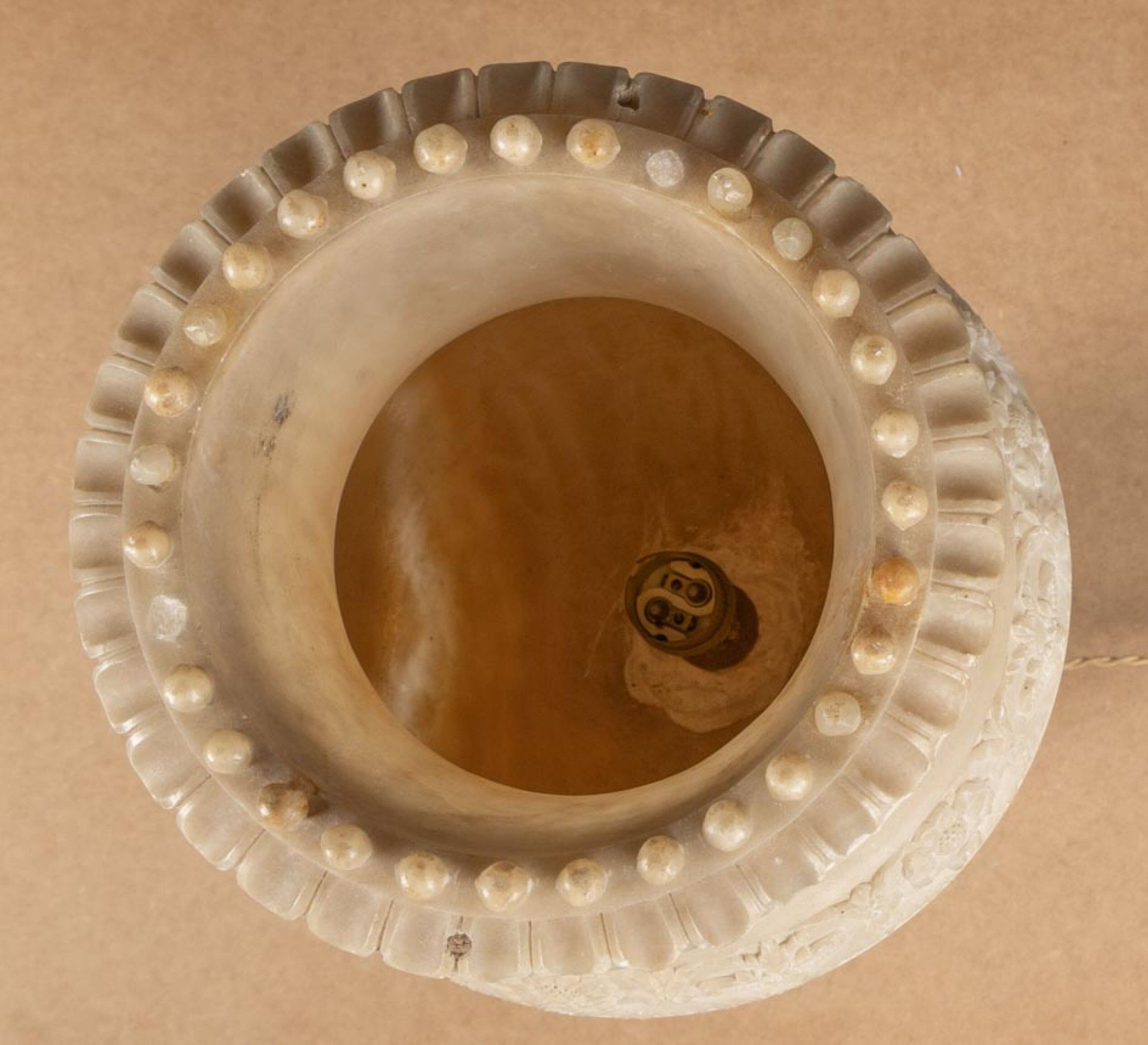 Vase balustre reposant sur un socle adhérant en albâtre finement sculptée.