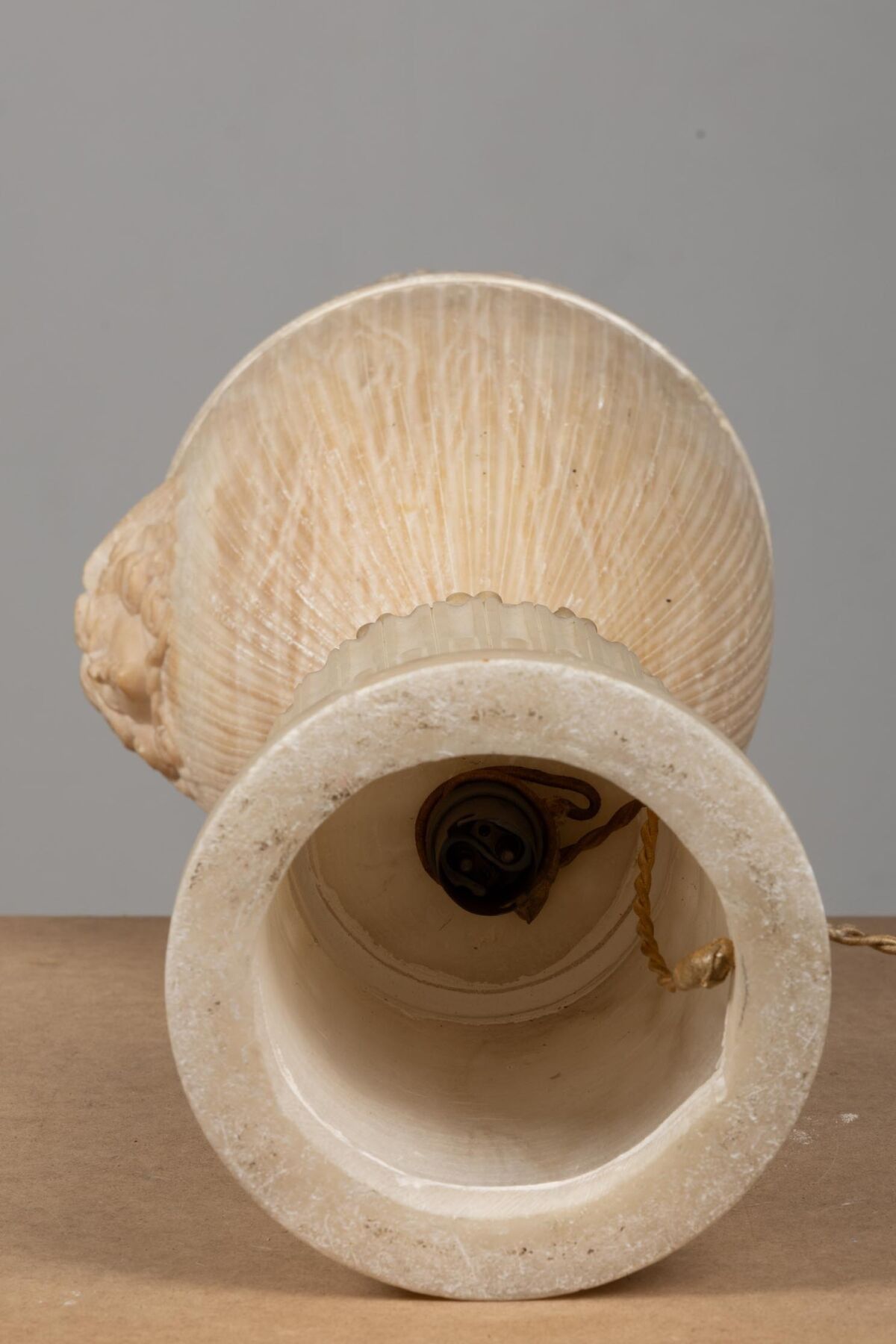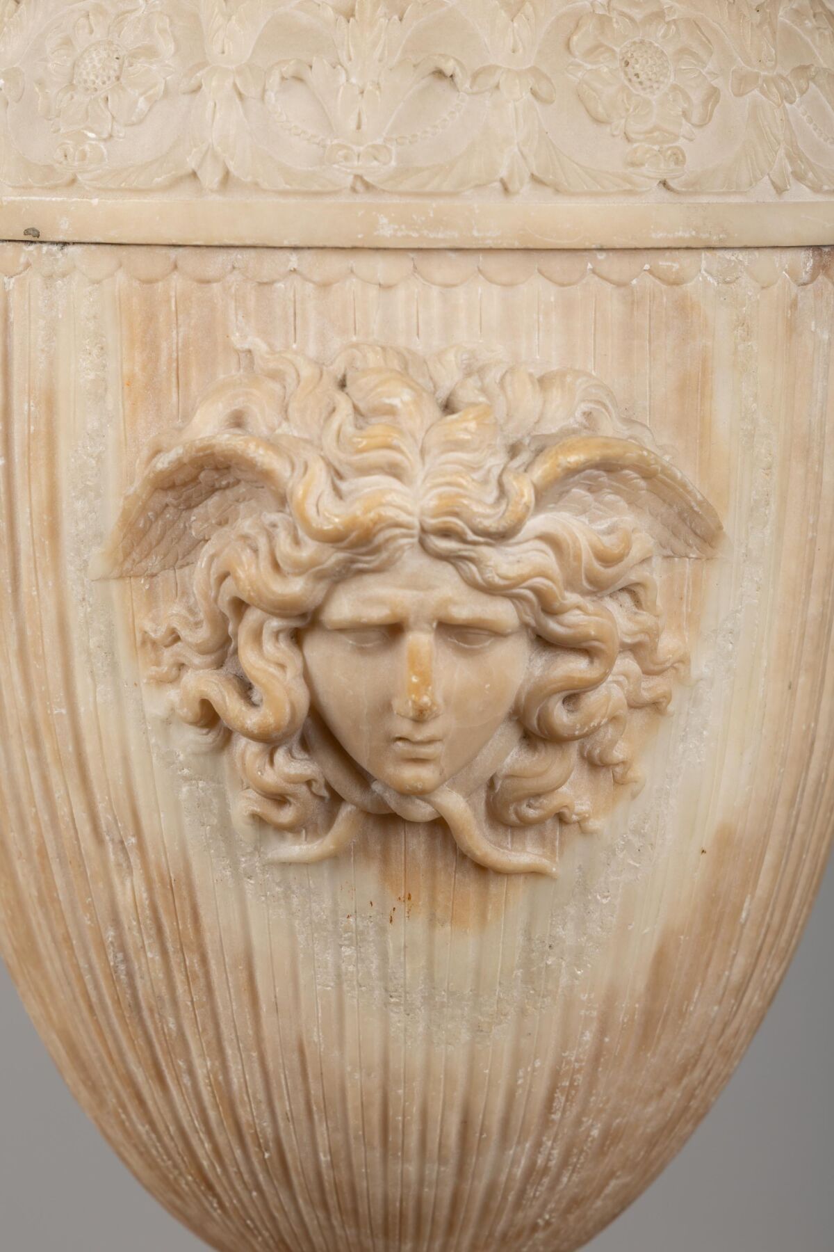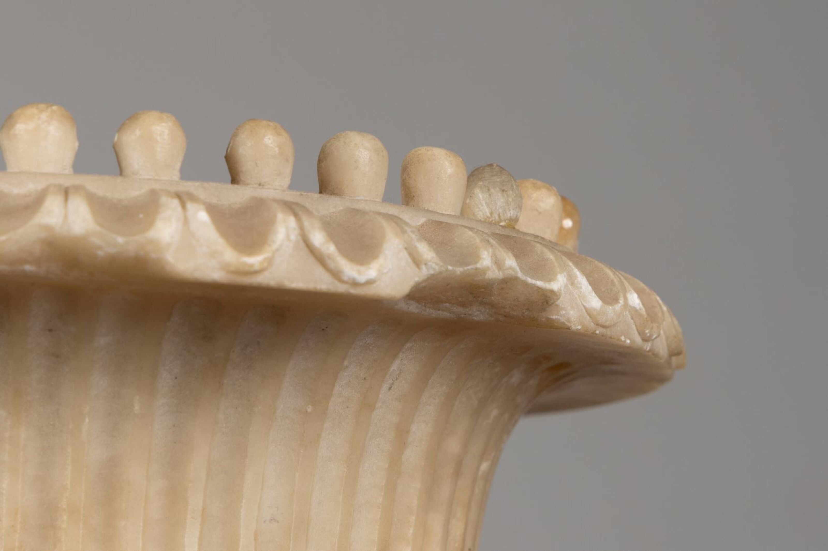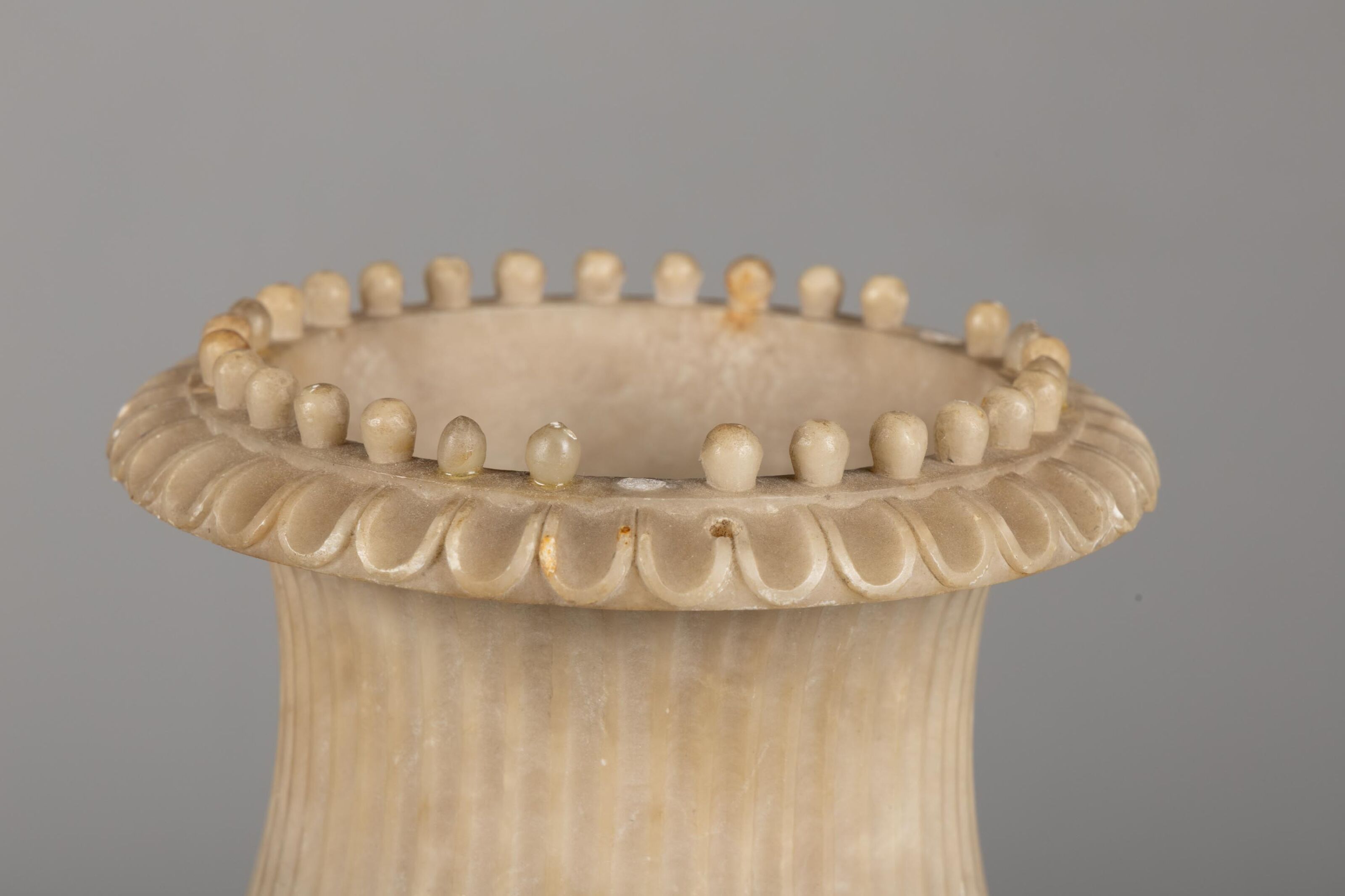 Vase balustre reposant sur un socle adhérant en albâtre finement sculptée.