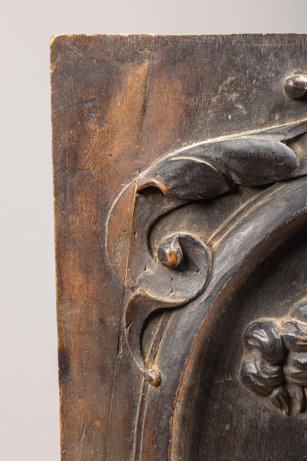 Panneau de bois sculpté d'un profil de femme dans un médaillon.