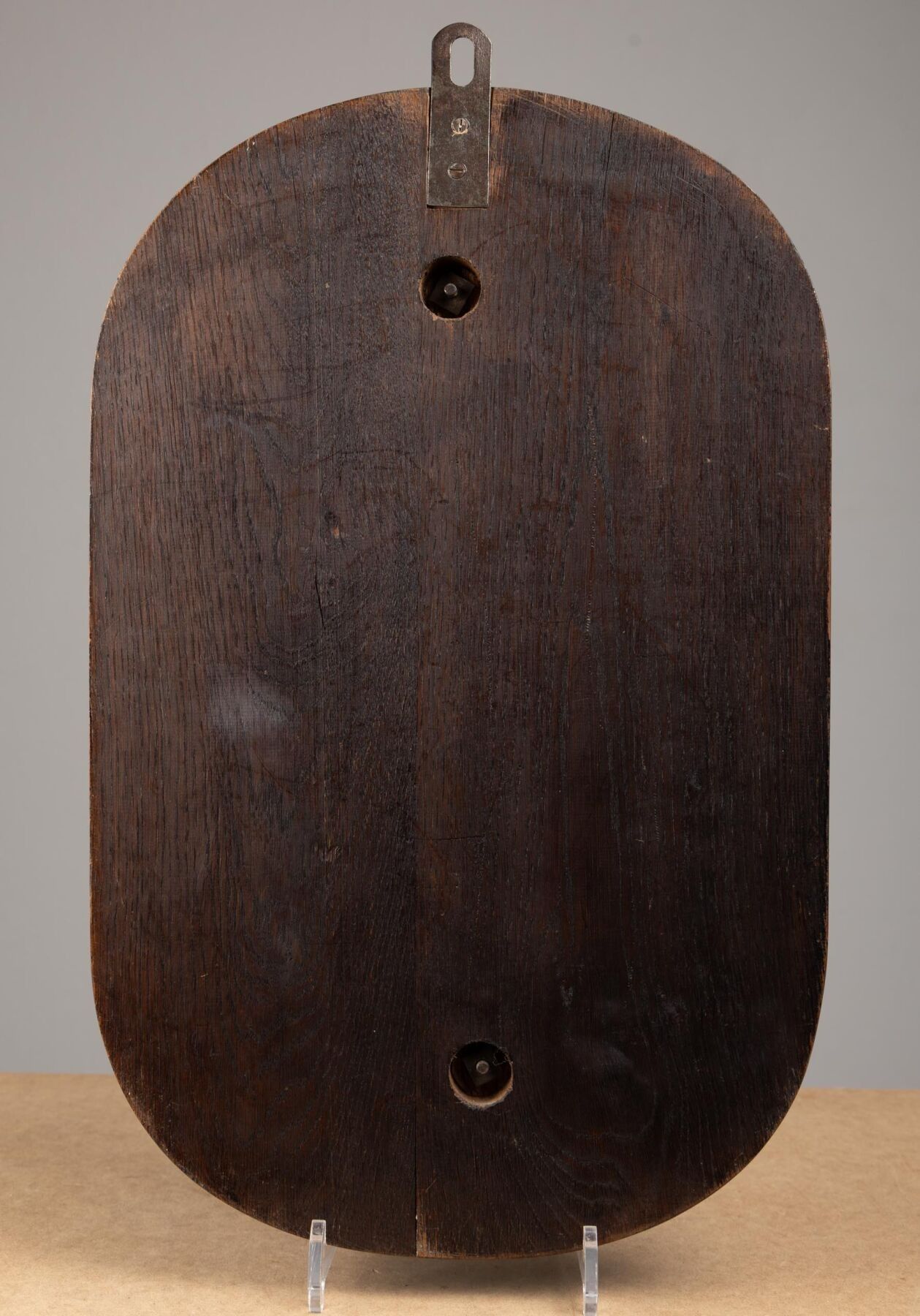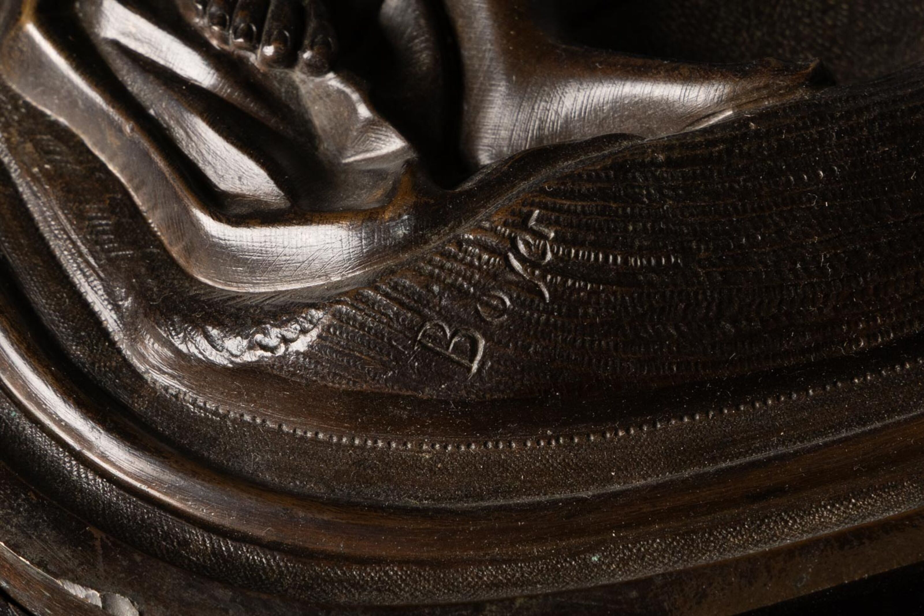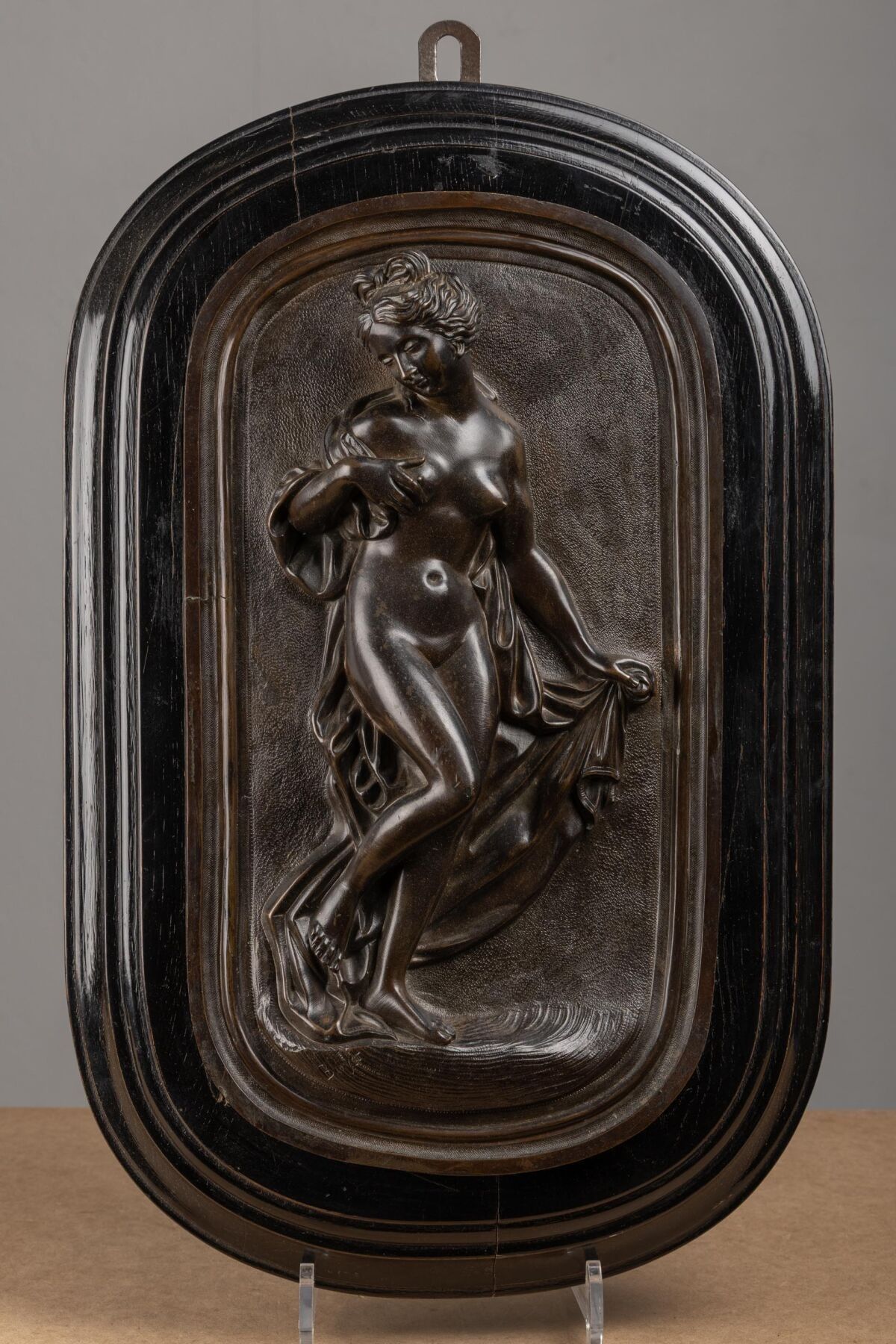 Bas-relief en bronze à patine brune, signé en bas à gauche et monté sur un écusson en bois noirci.