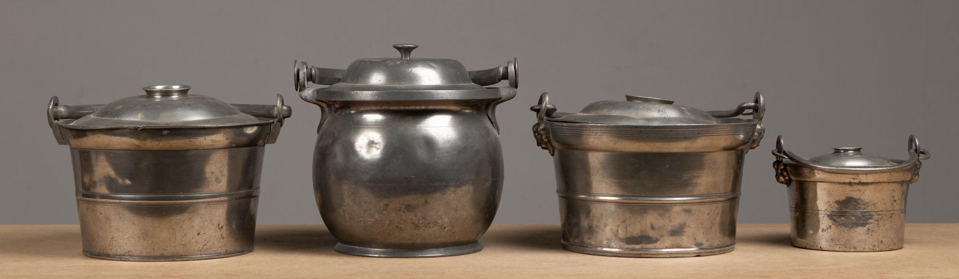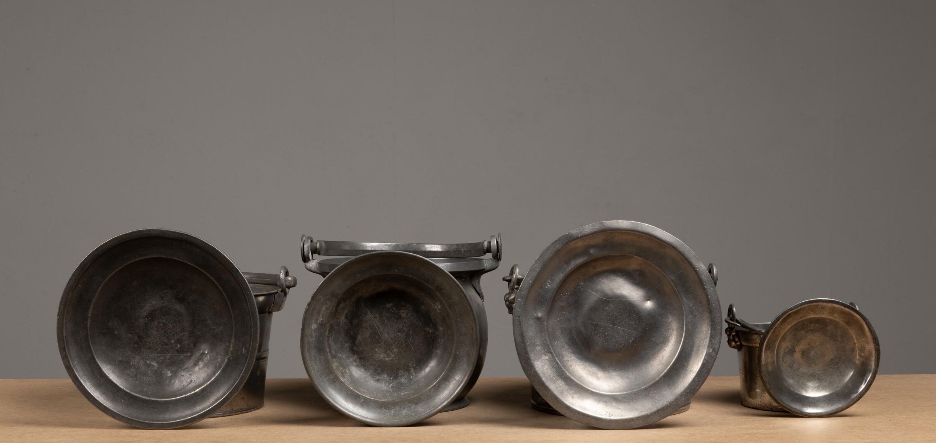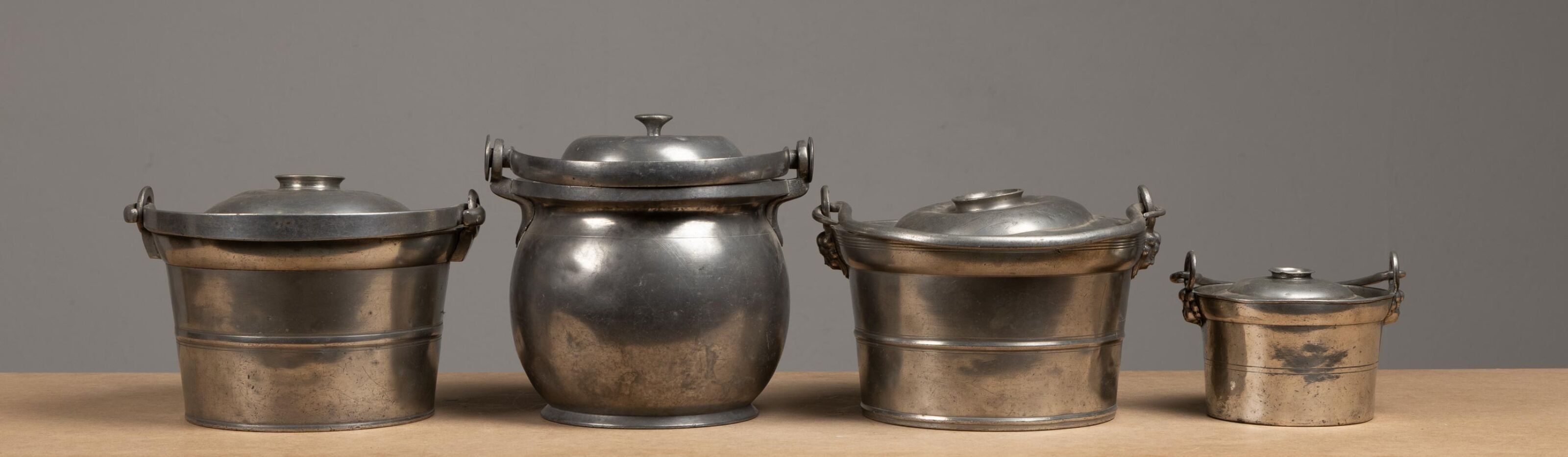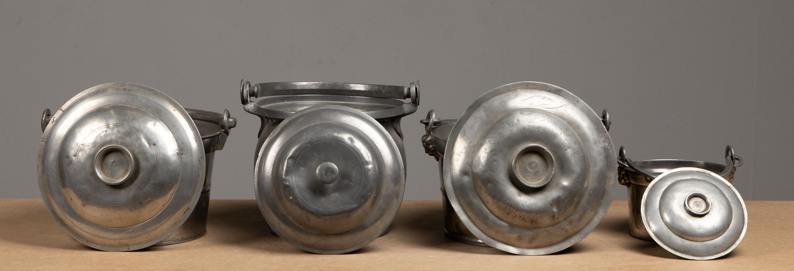 Quatre porte-déjeuners en étain dont de Bouvier à Clamecy.