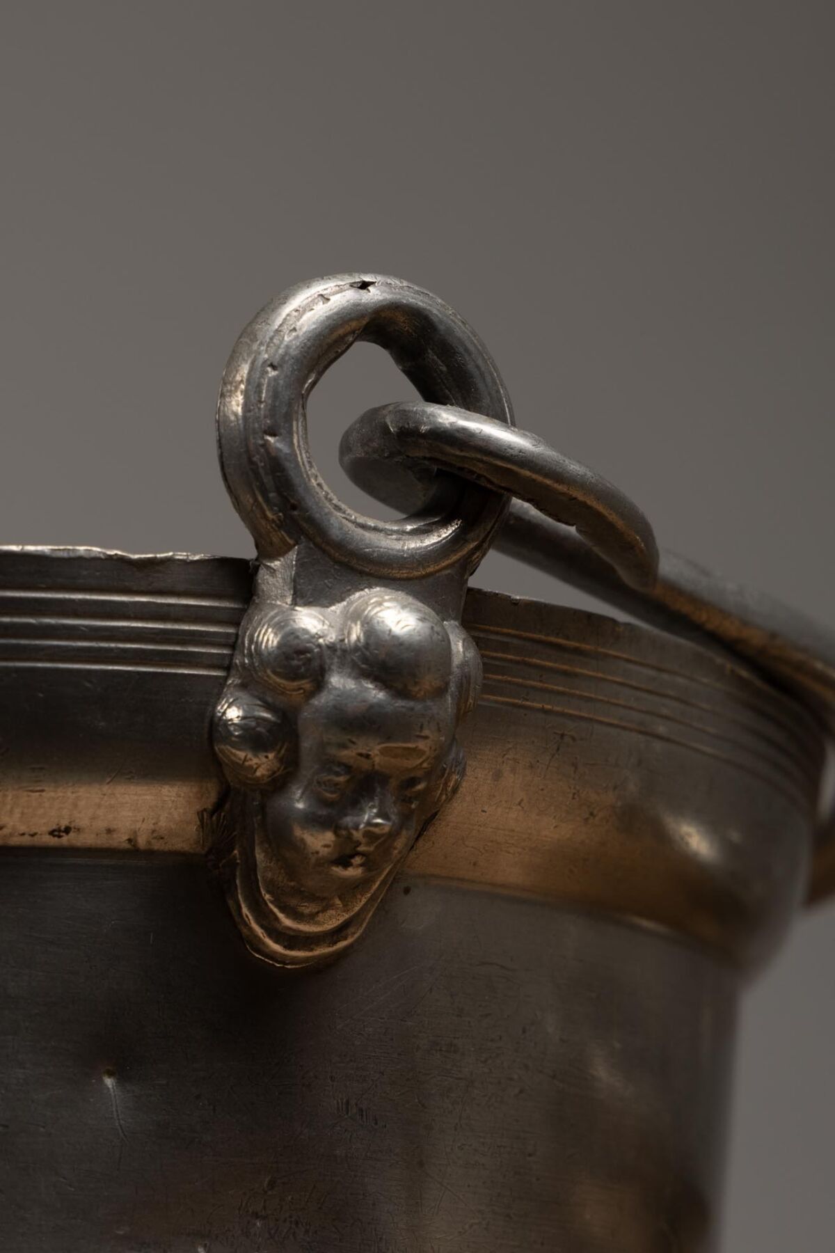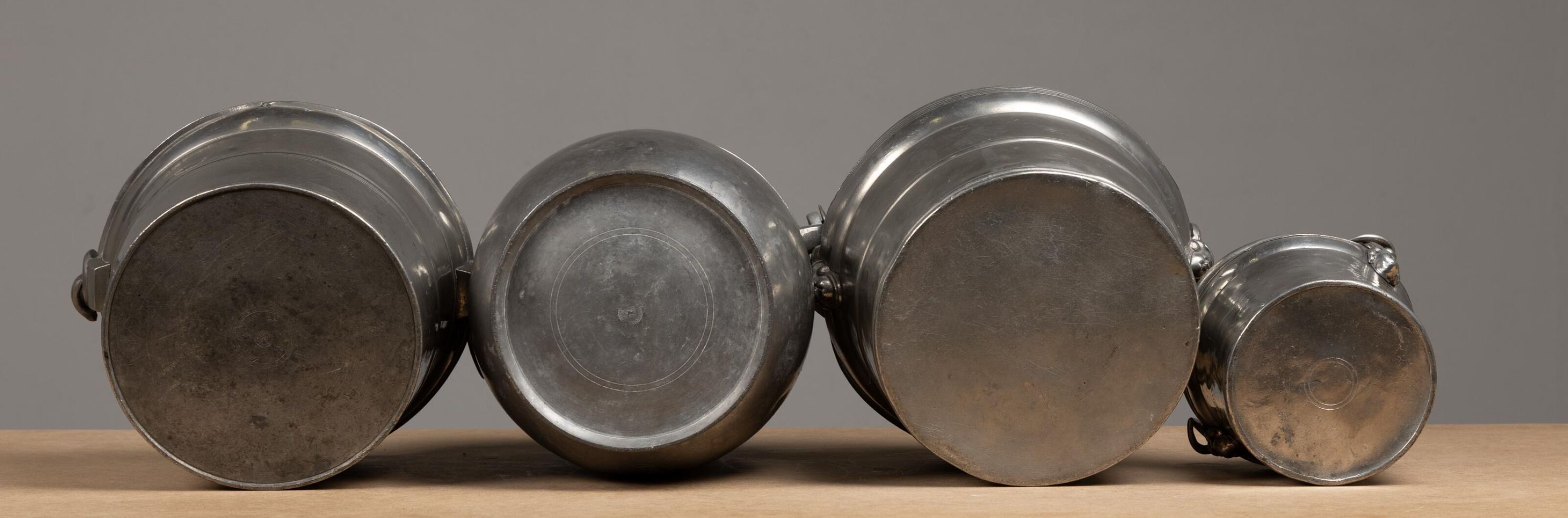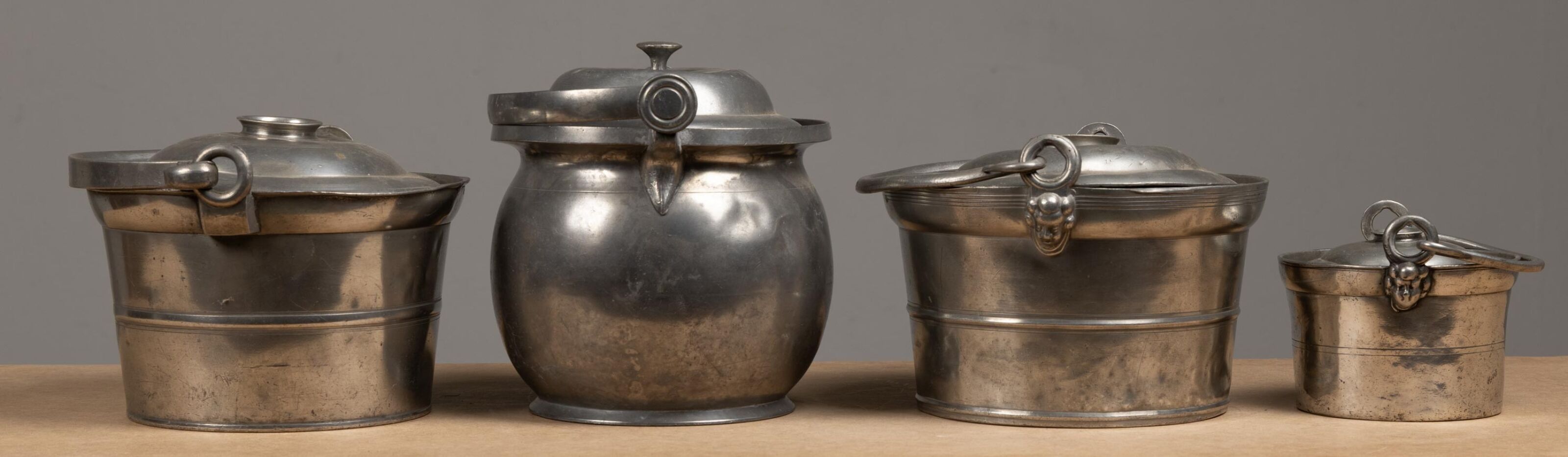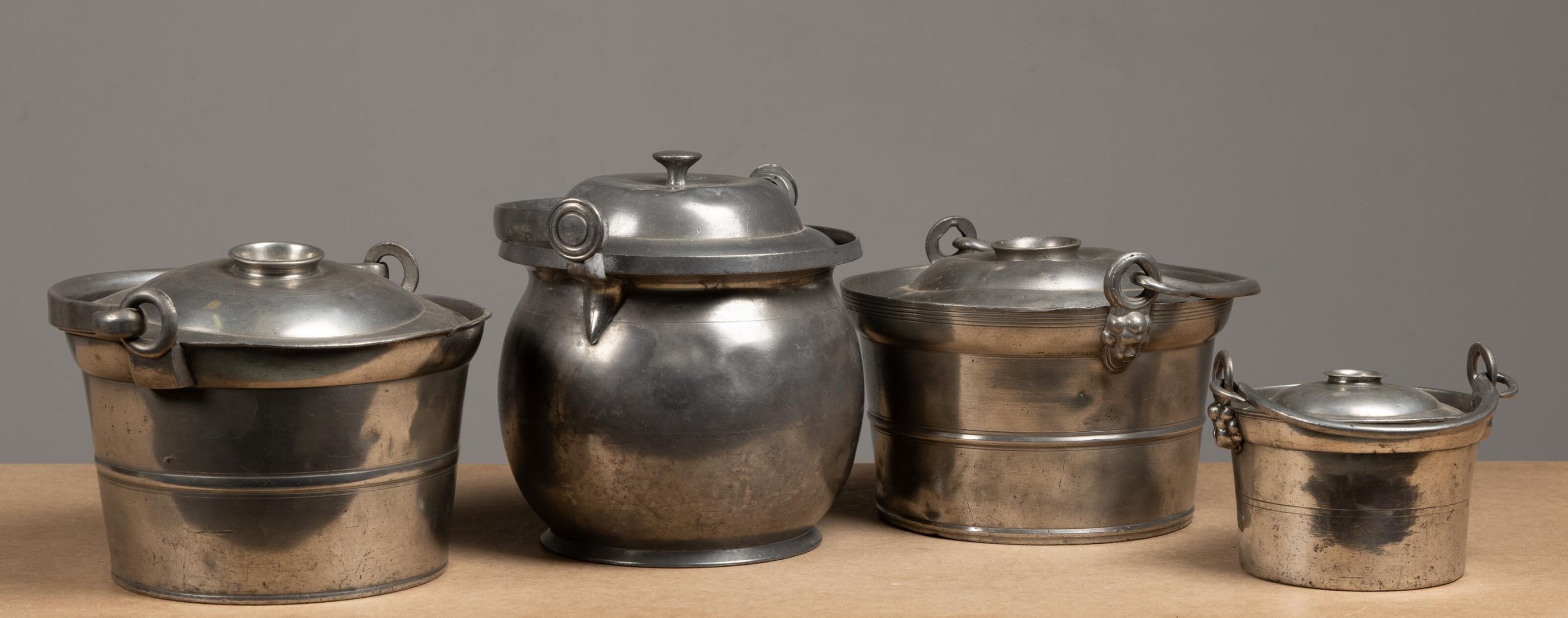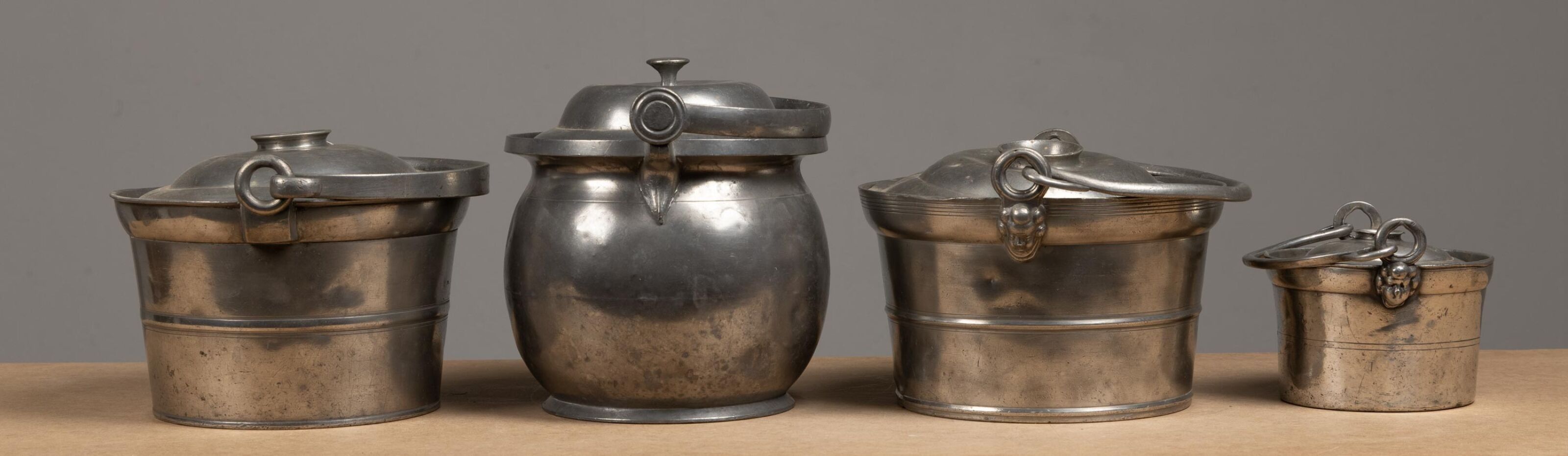 Quatre porte-déjeuners en étain dont de Bouvier à Clamecy.