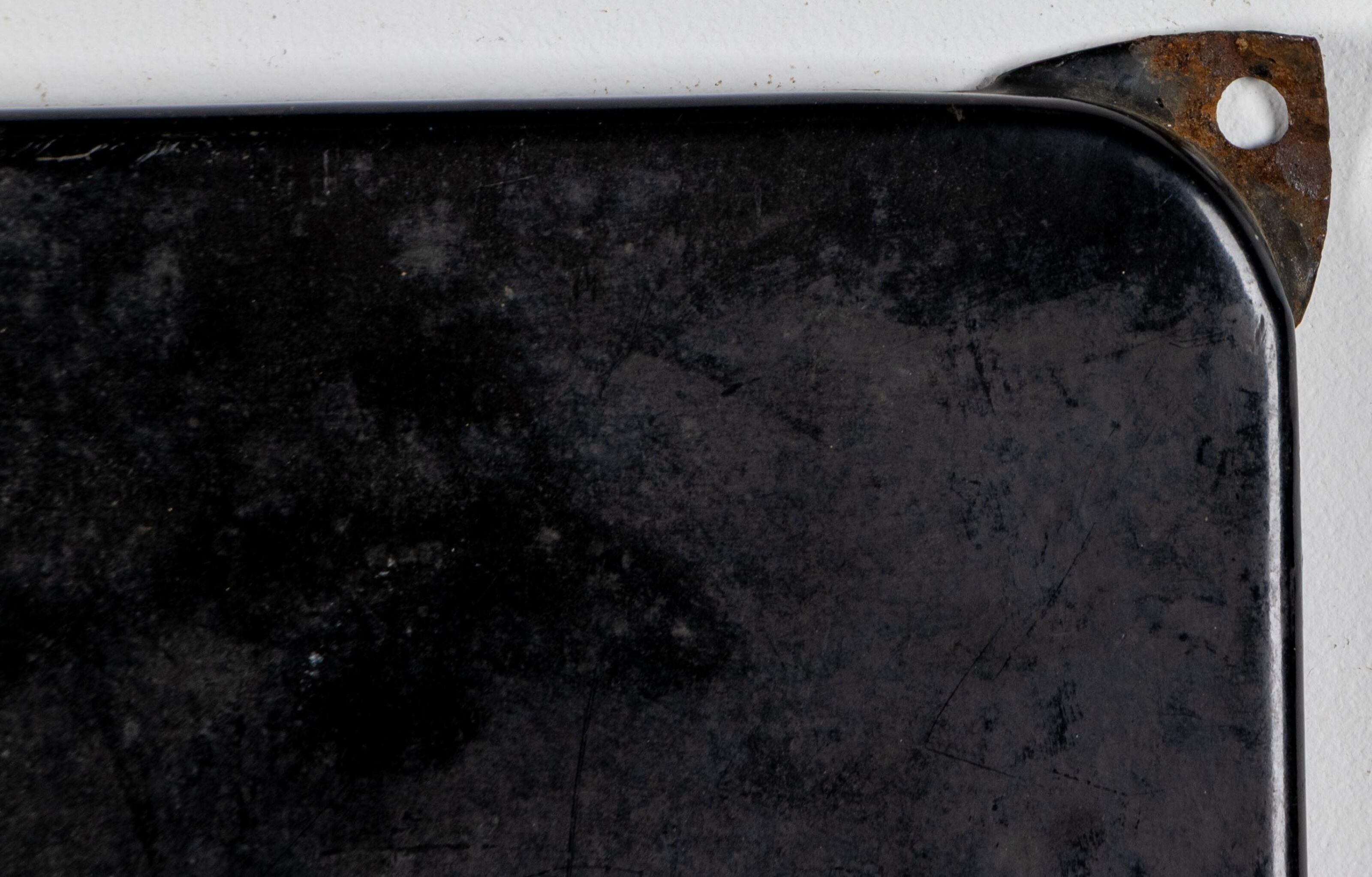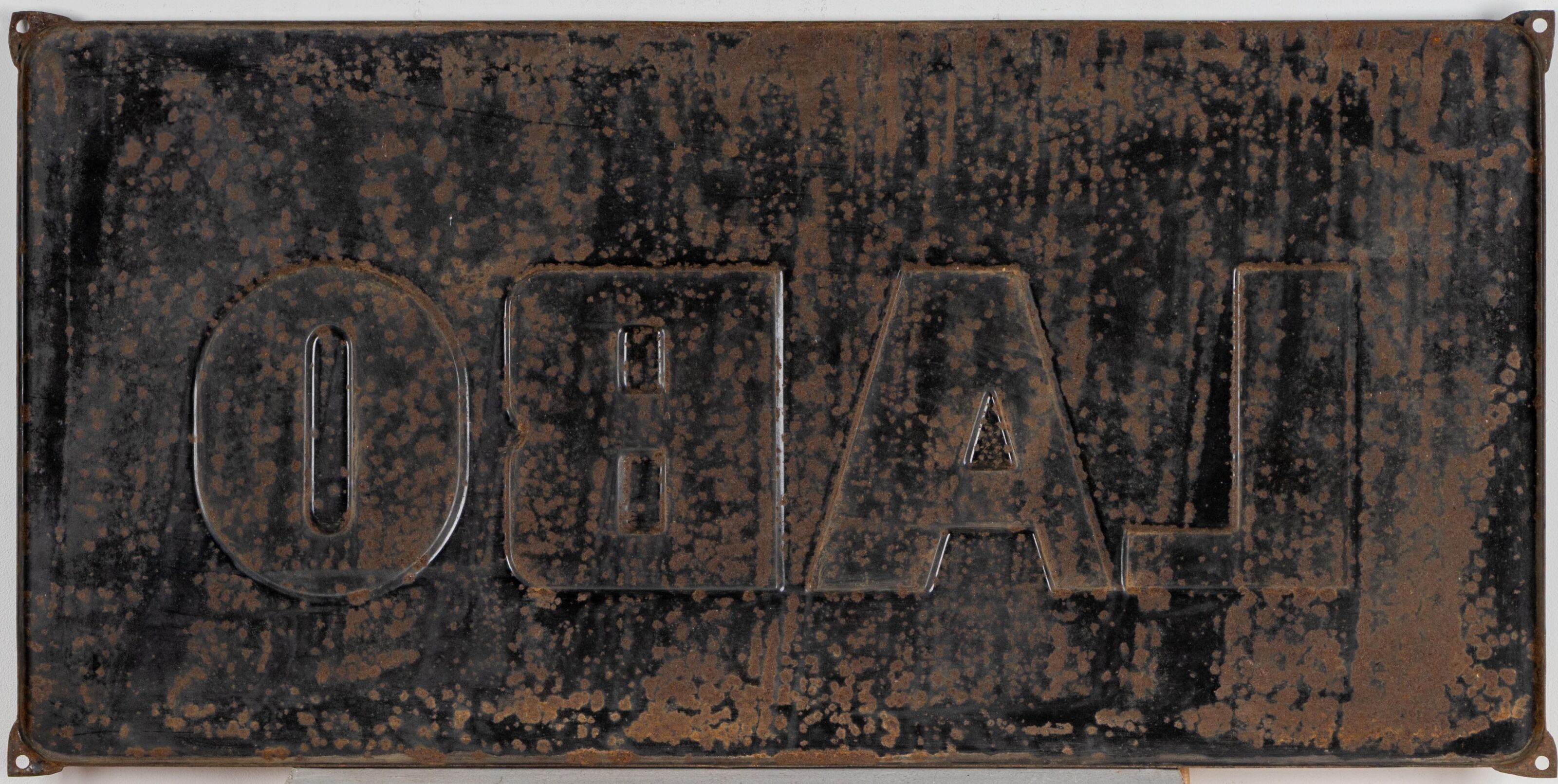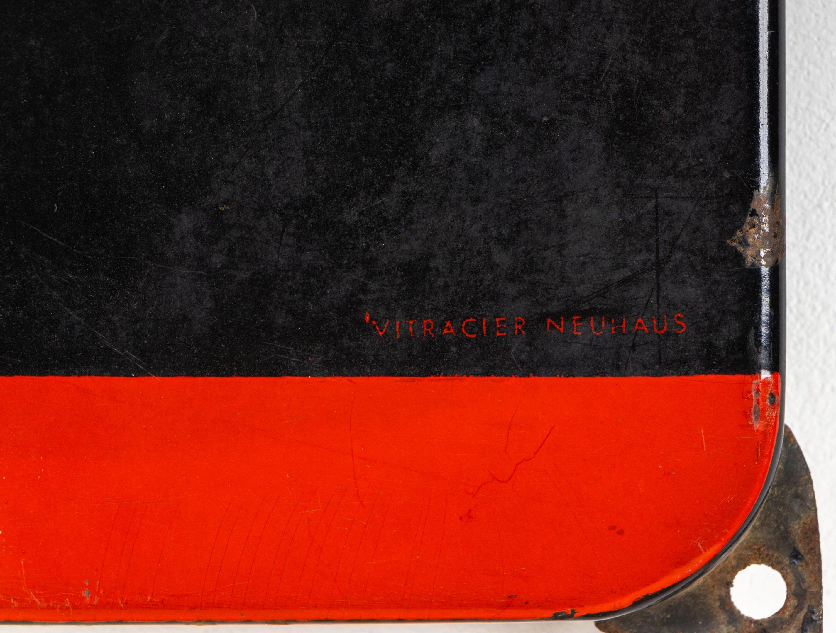 Plaque émaillée à motif de lettrage rouge et jaune sur fond noir et bandeau rouge en partie basse.