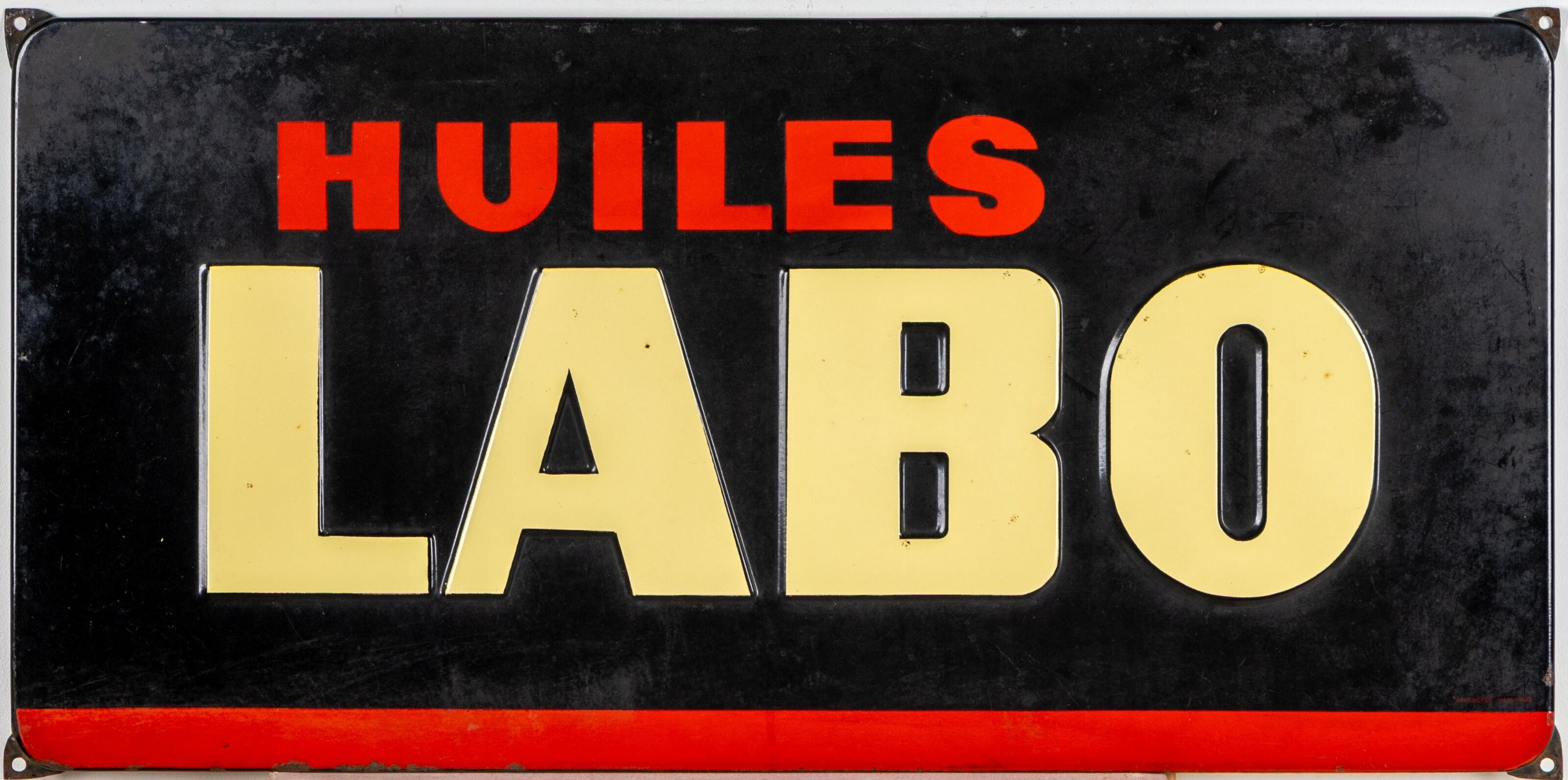HUILES LABO. Plaque émaillée à motif de lettrage rouge et ja…
