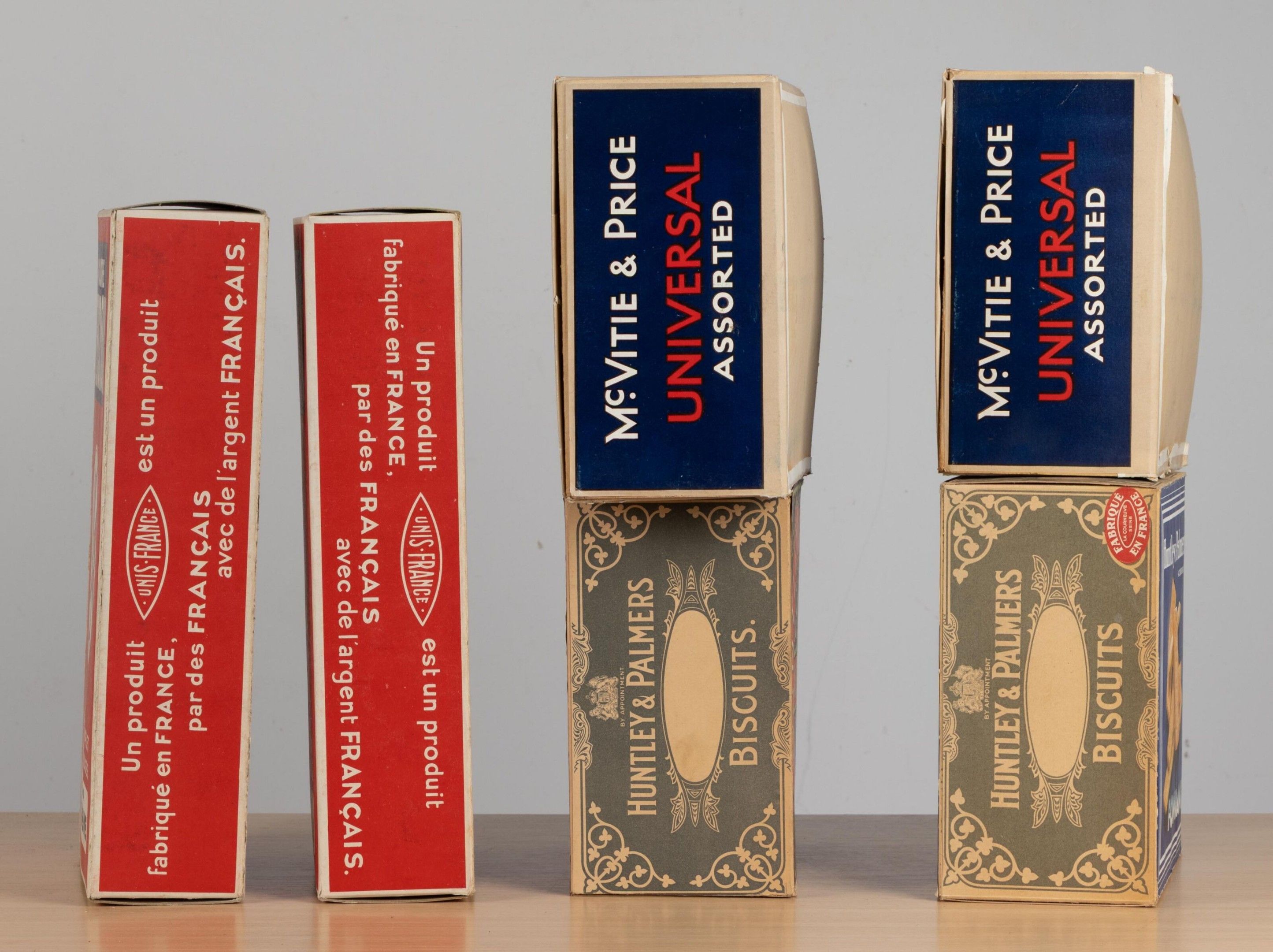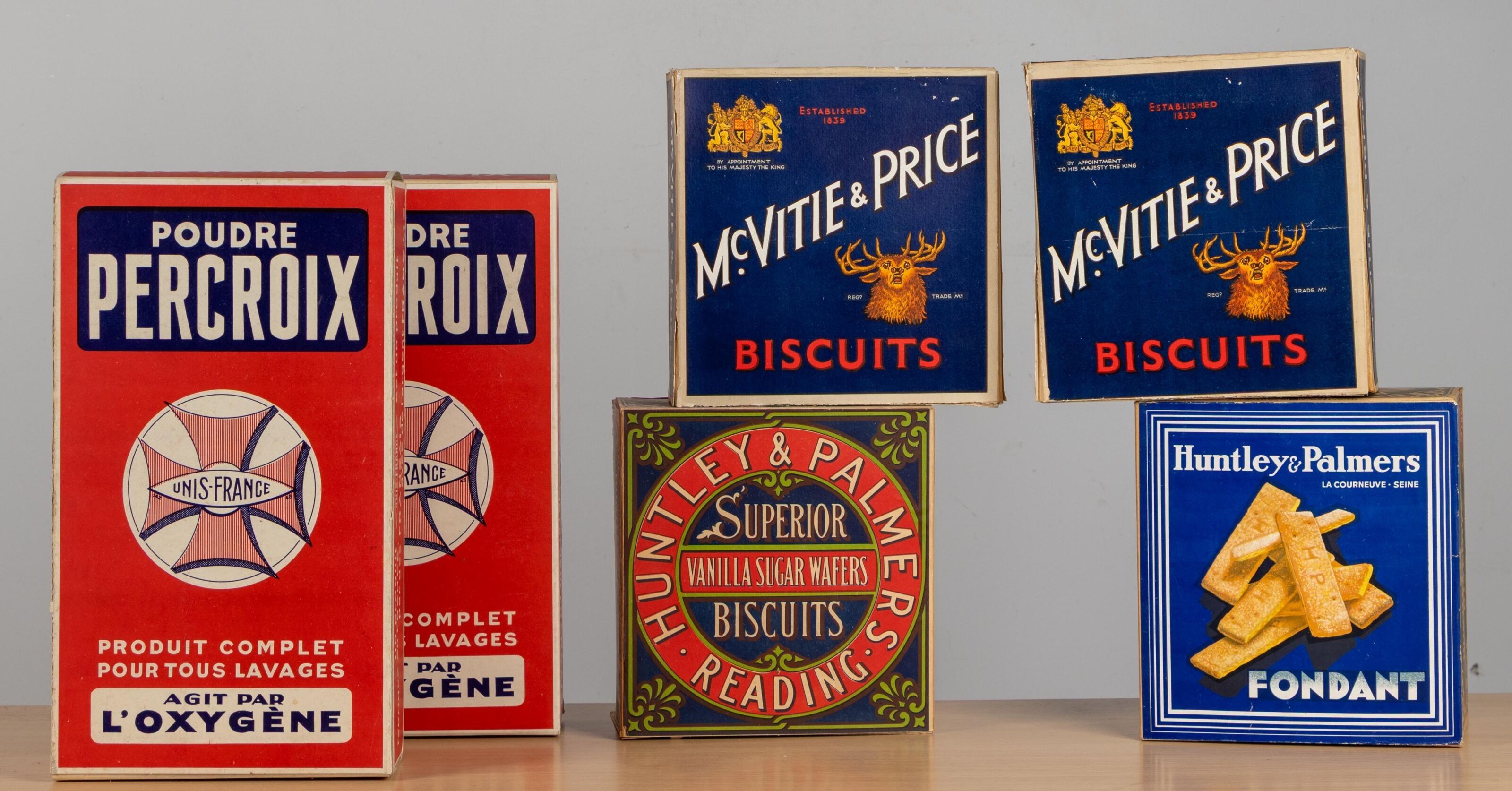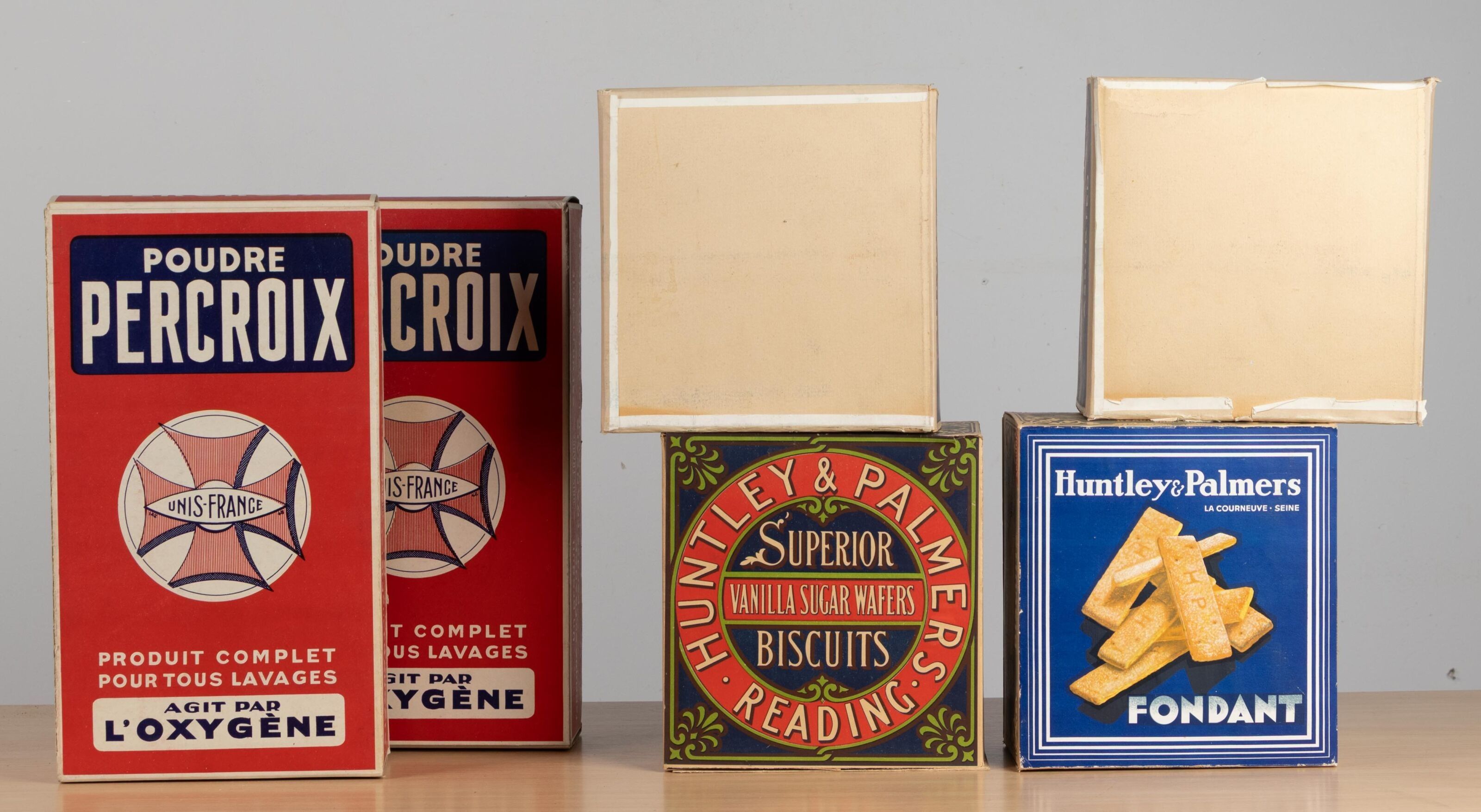 Ensemble de boites en carton publicitaire pour Huntley and Palmer, Mc Vitie and Price, poudre Percroix