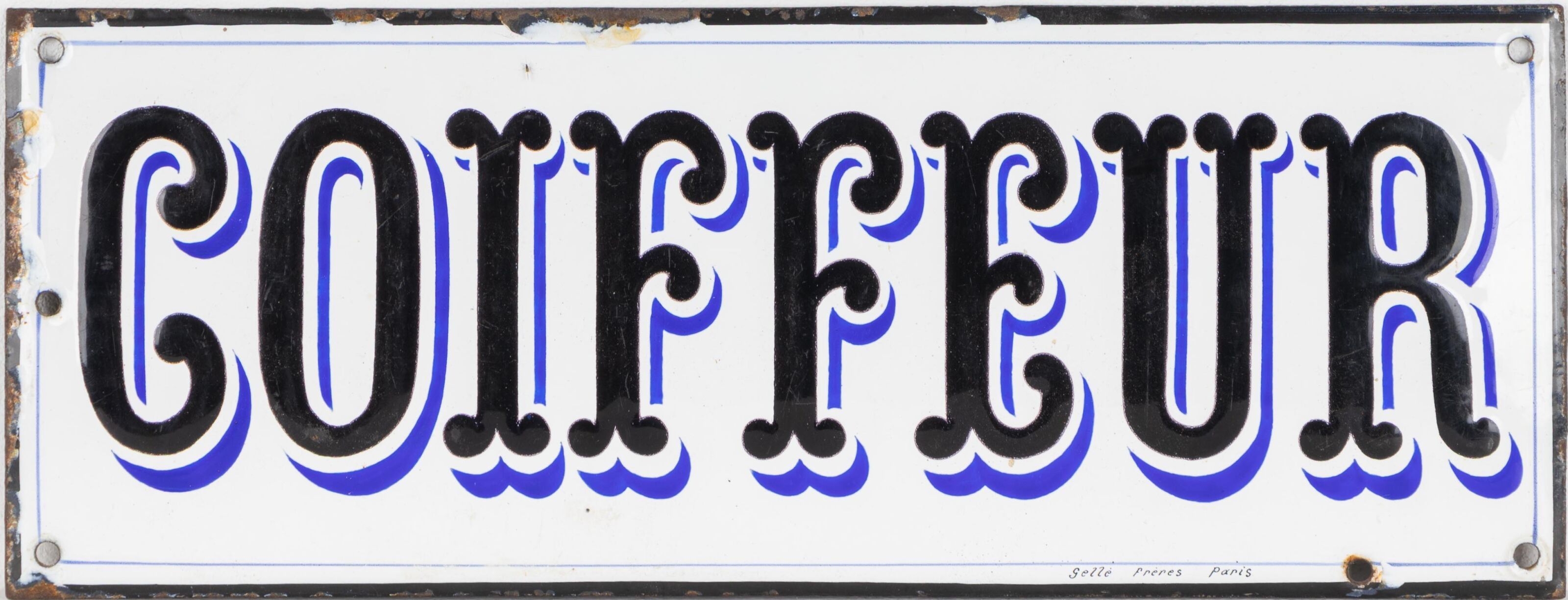 COIFFEUR. Plaque bombée en tôle émaillée avec relief.