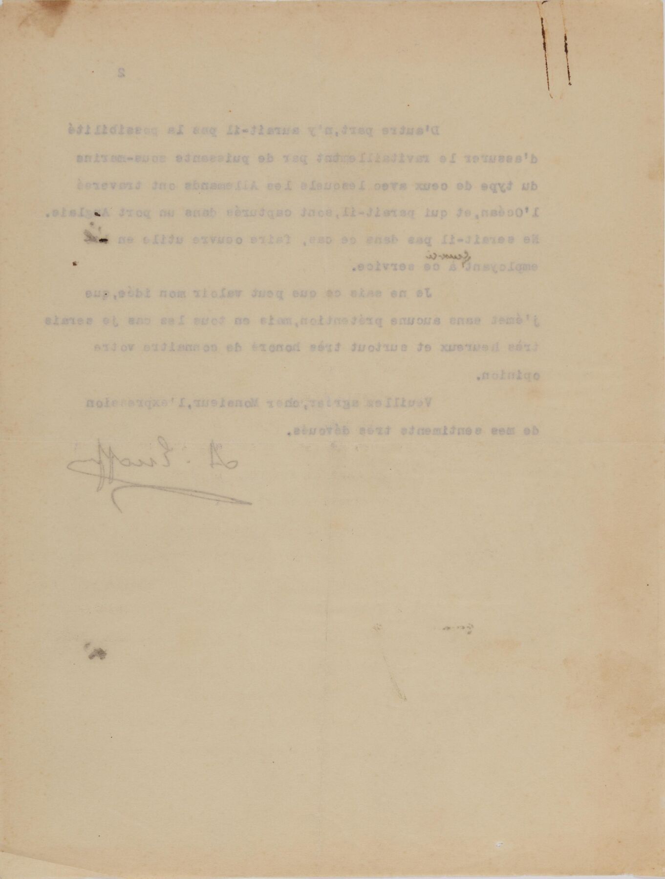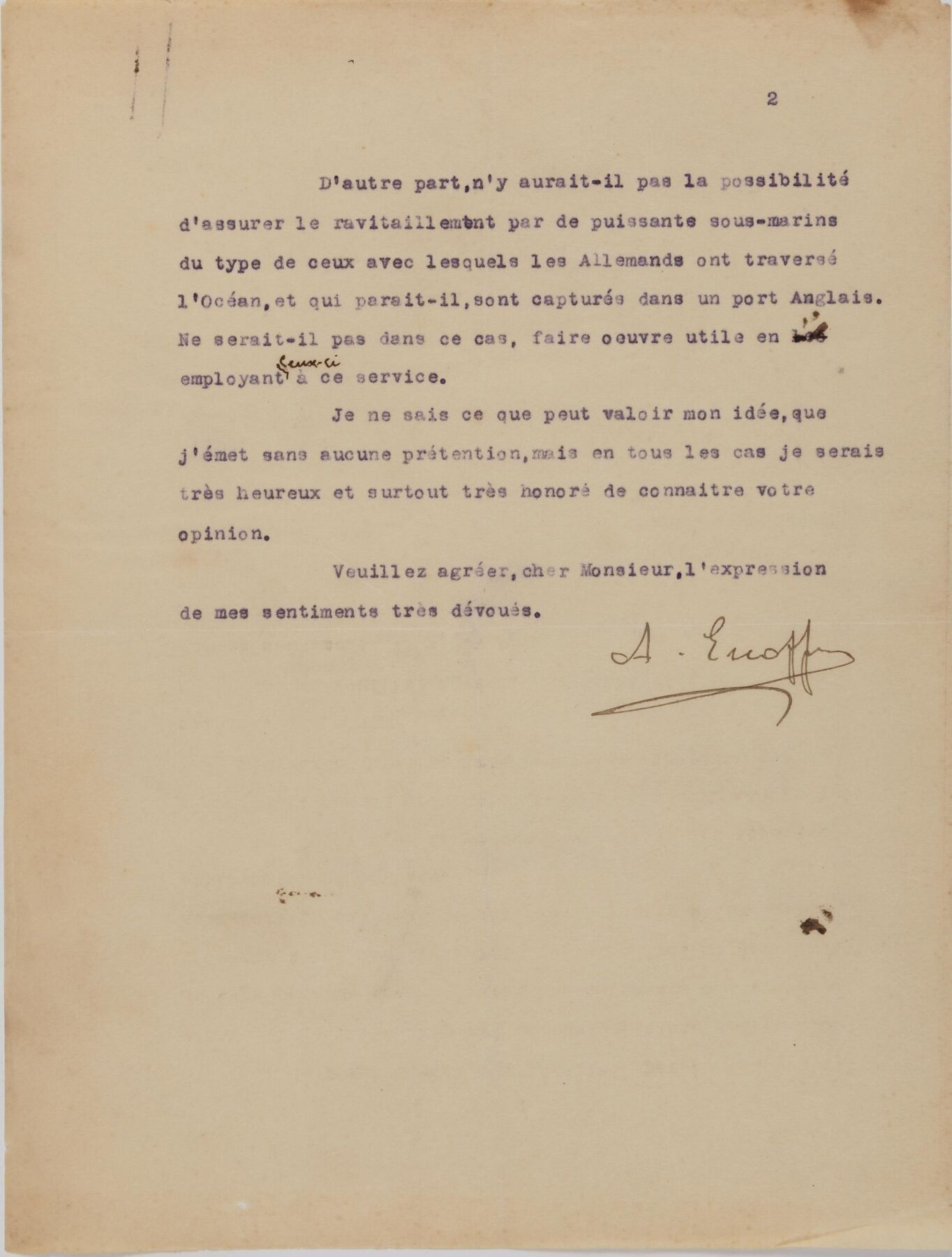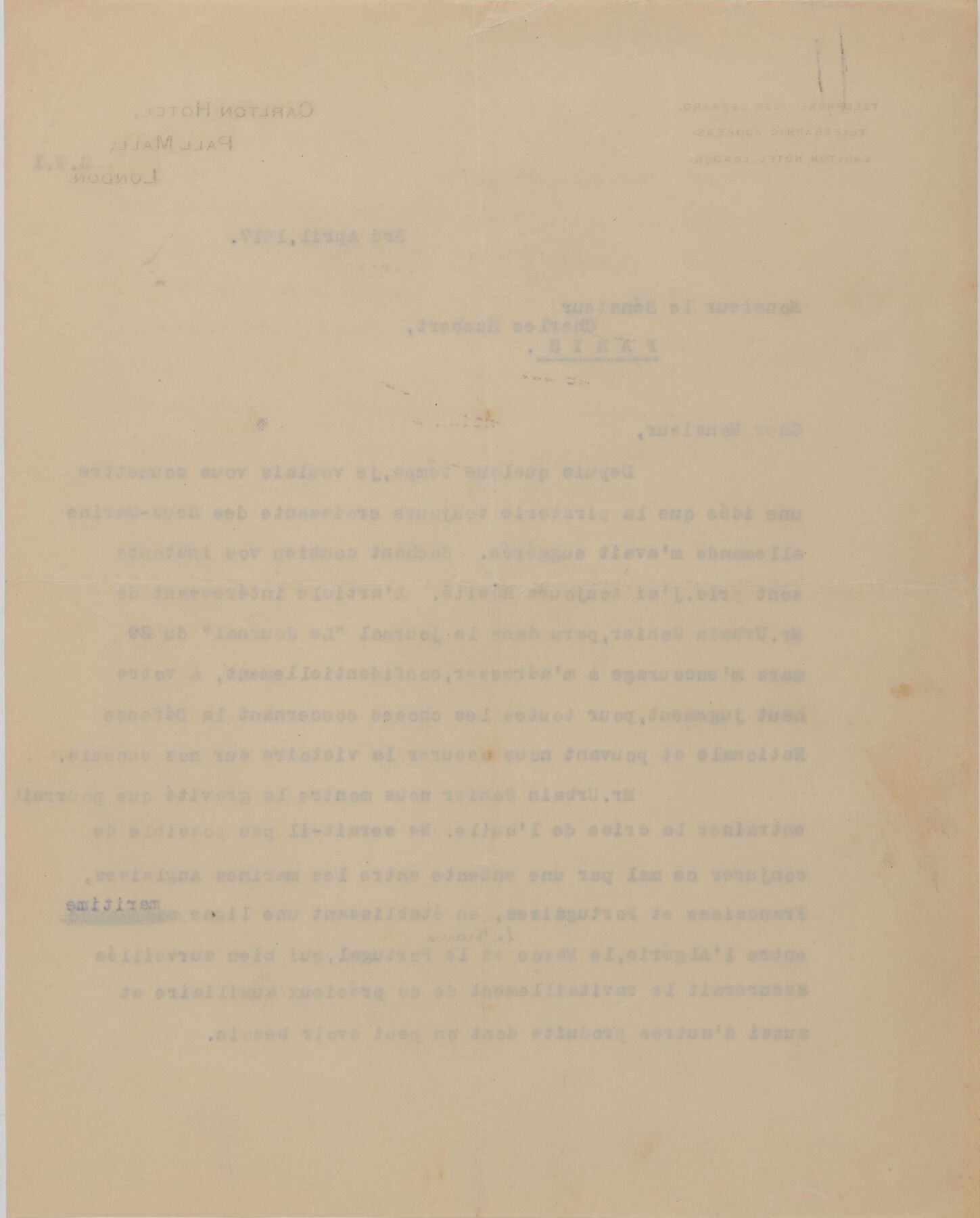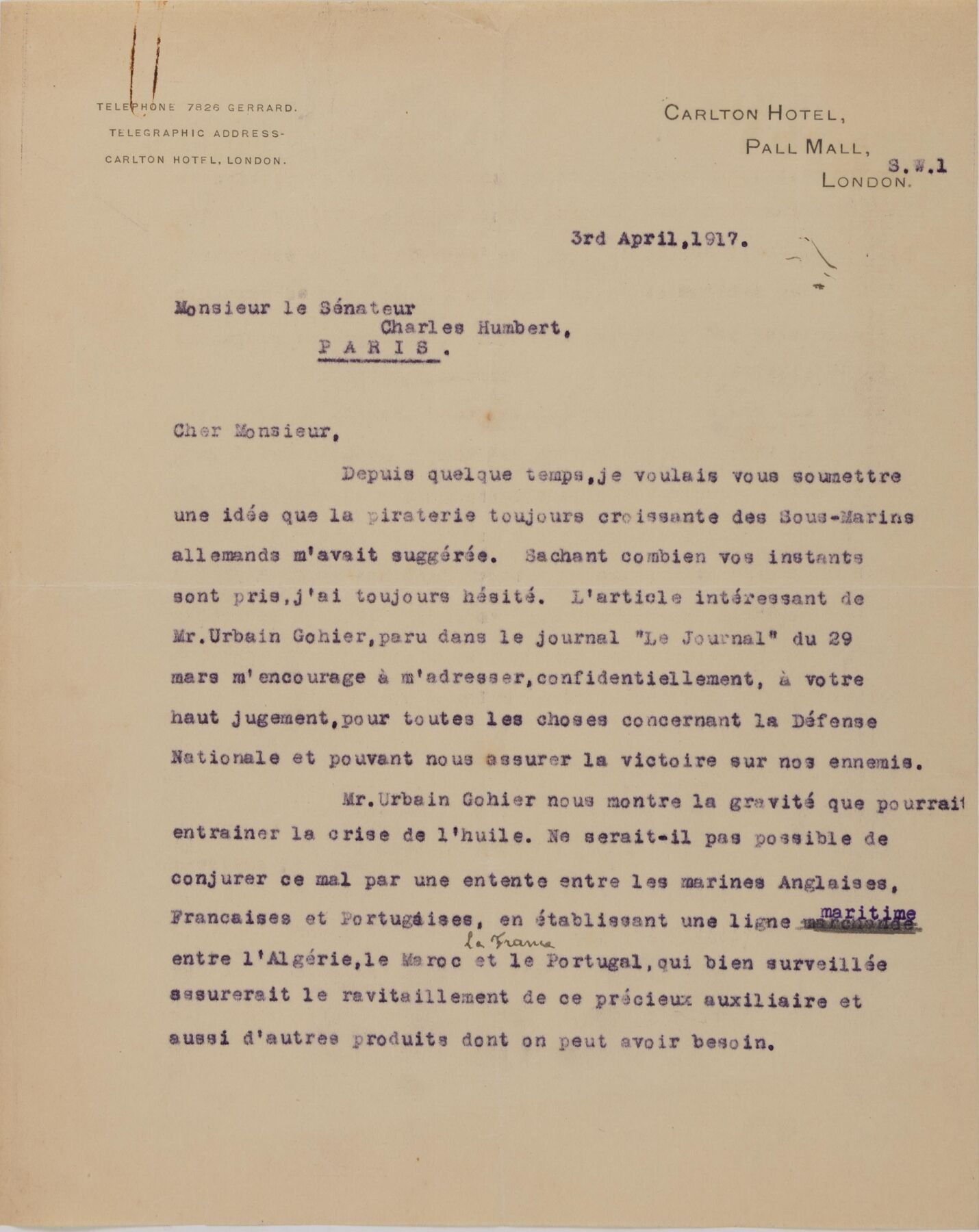 LAS tapuscrite, datée du 3 avril 1917 et envoyée depuis le Carlton Hotel de Londres à Charles Humbert, au cours de laquelle Monsieur Escoffié fait part de ses idées concernant "la crise de l'huile" et de son inimitié envers l'ennemi Allemand.