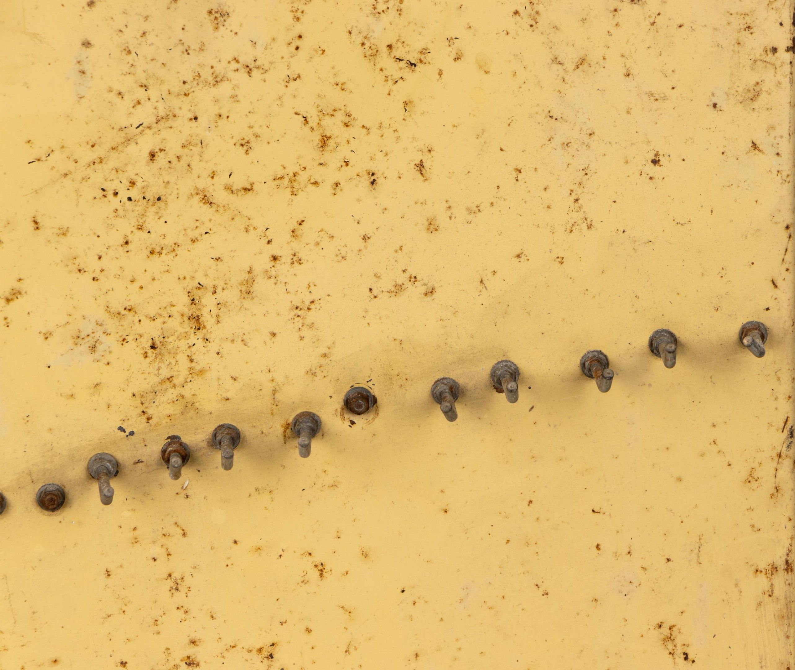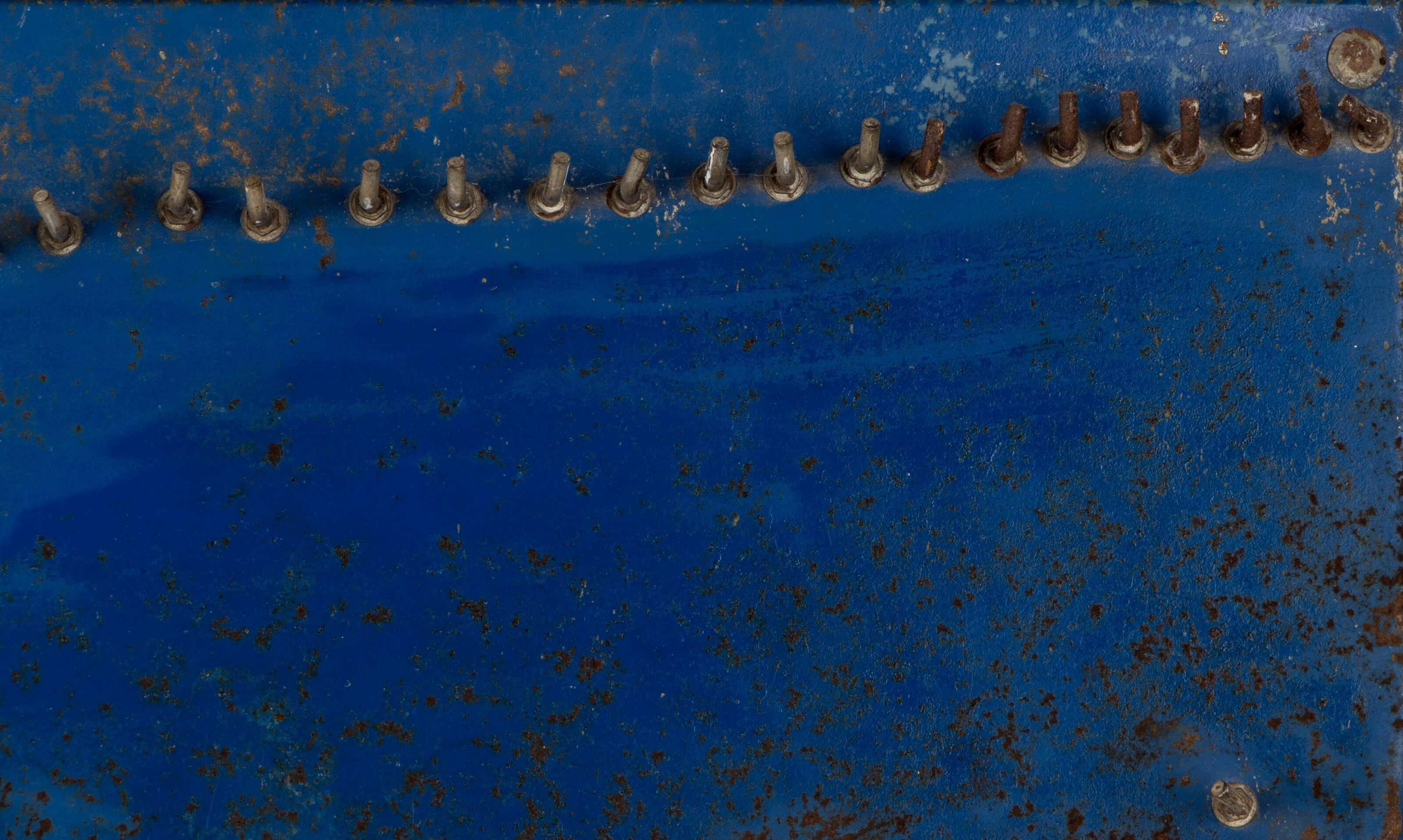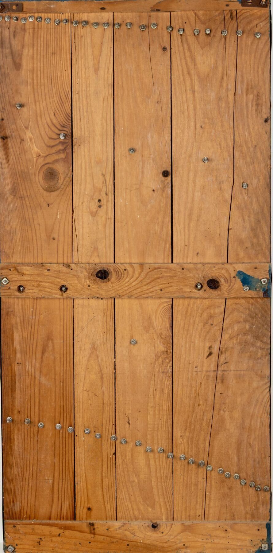 Plaque en tôle bleu et crème formant porte-outils sur un panneau de bois.