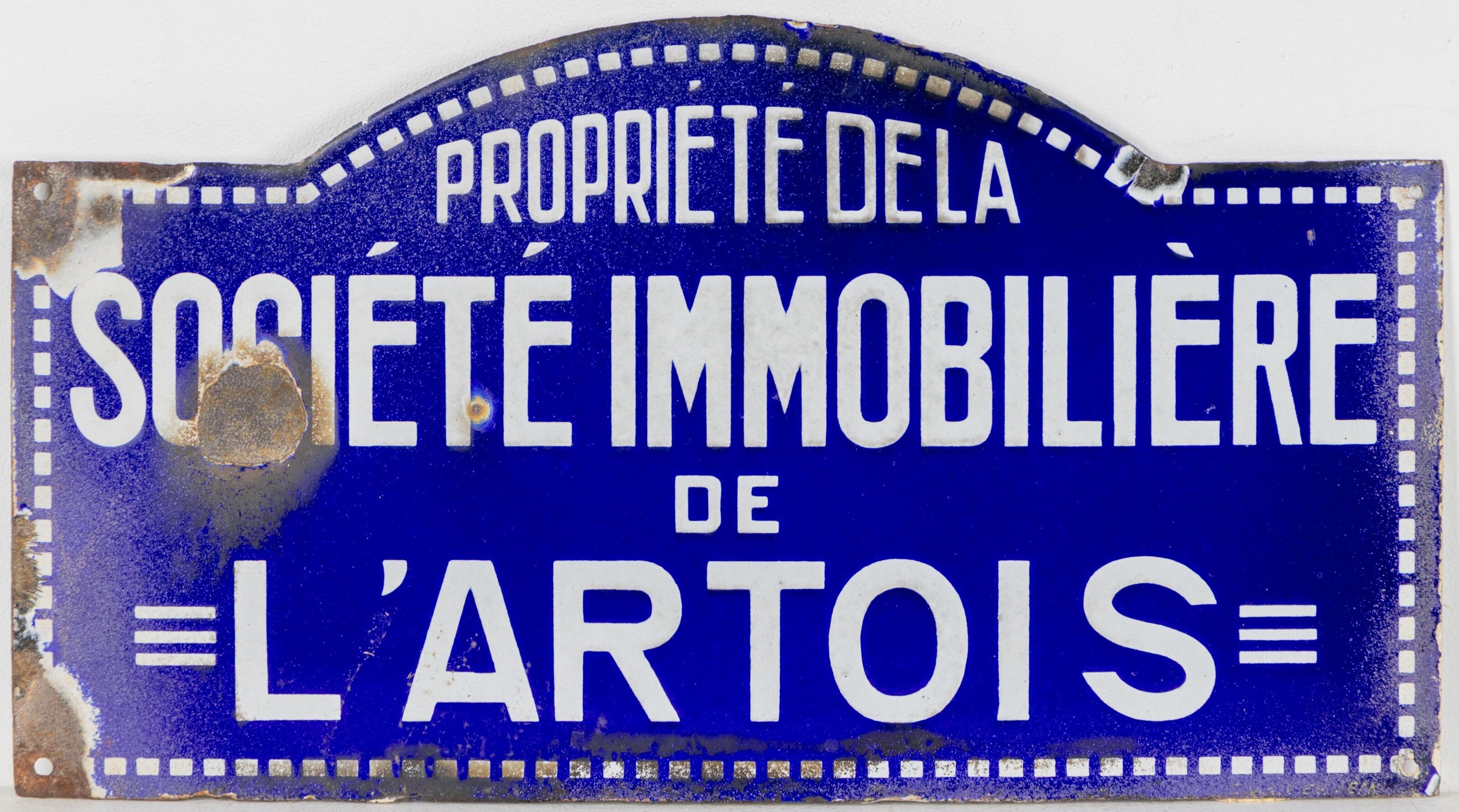 Plaque en tôle émaillée chapeau de gendarme pour " La société immobilière de L'Artois"