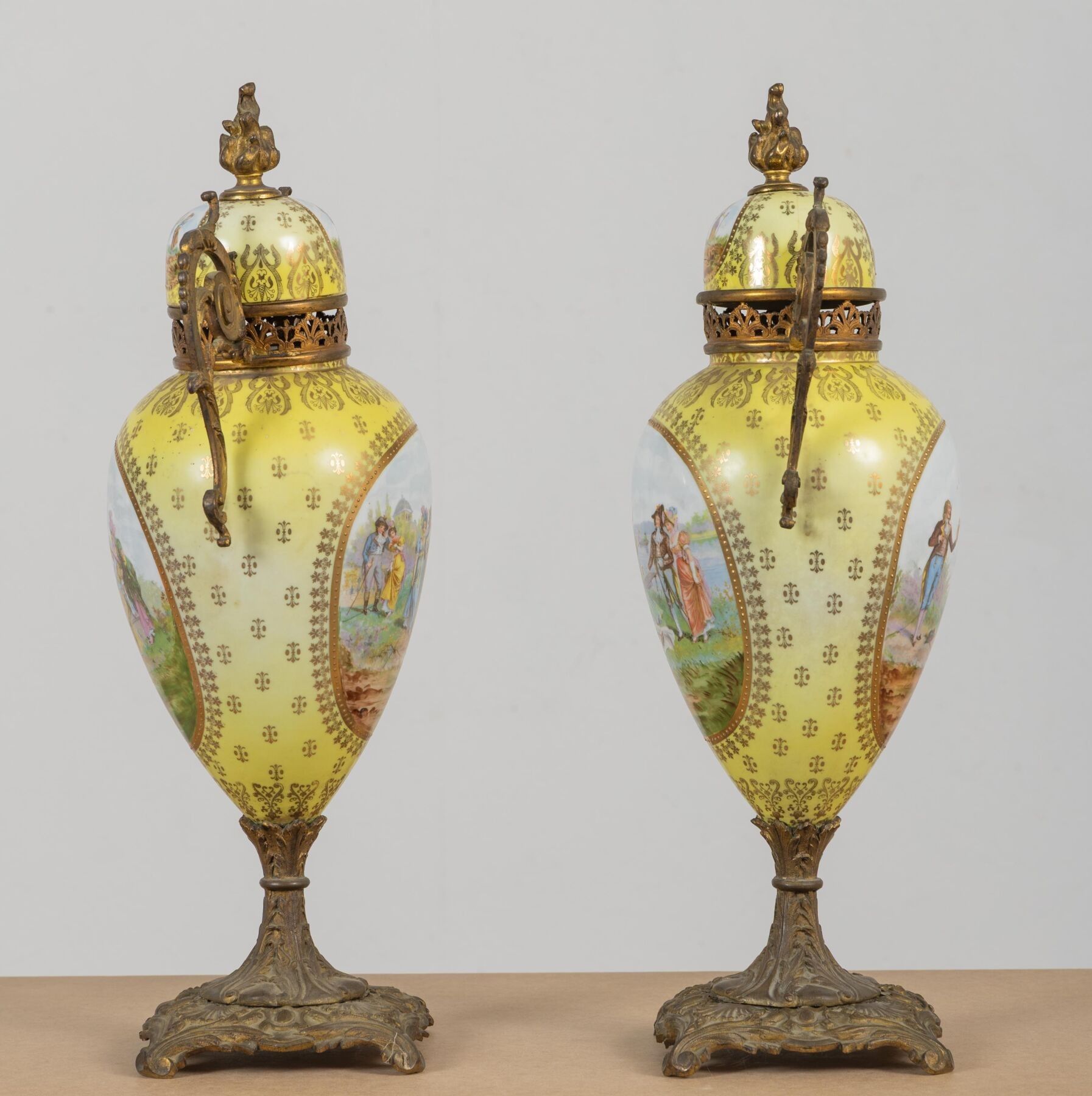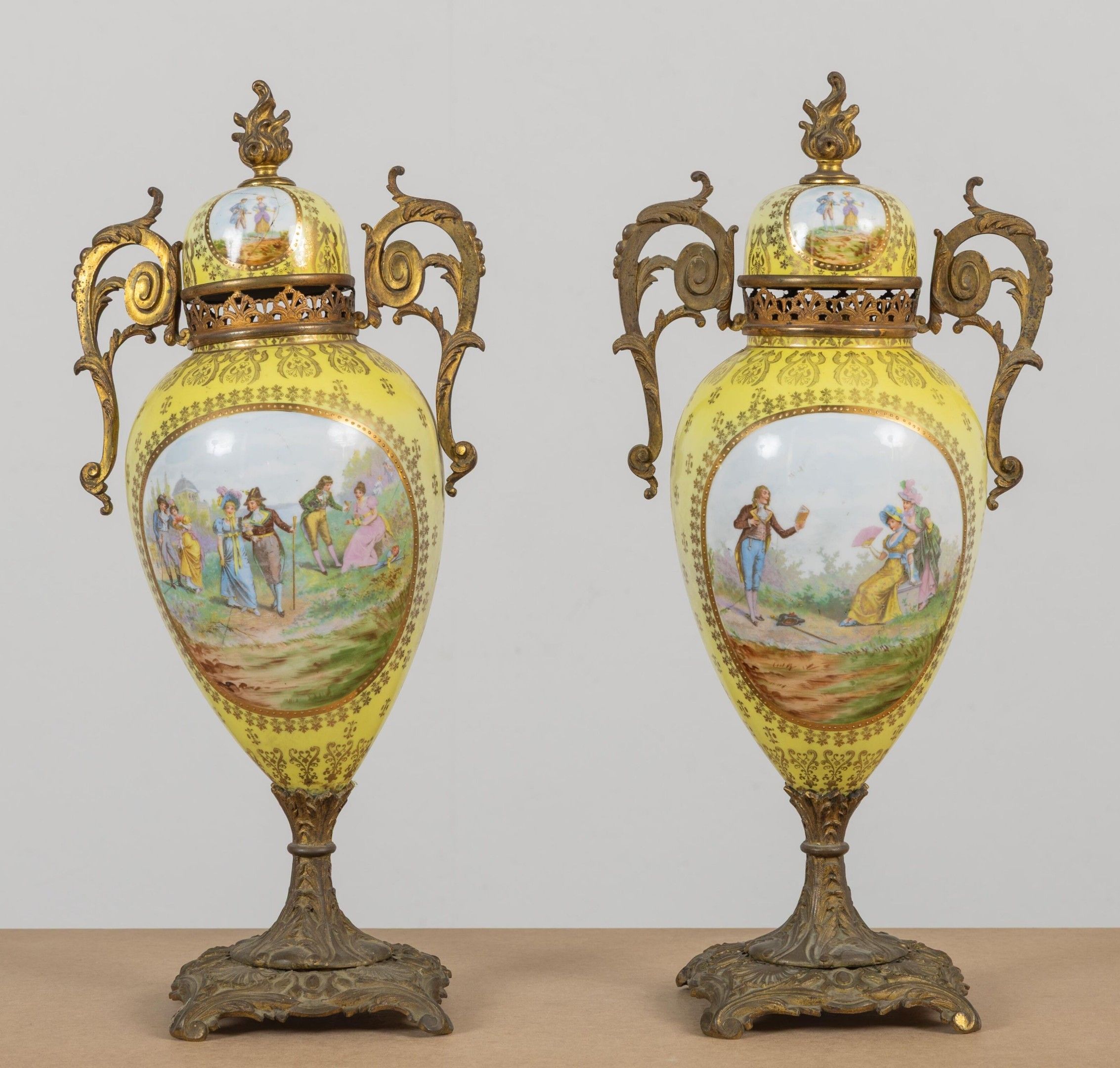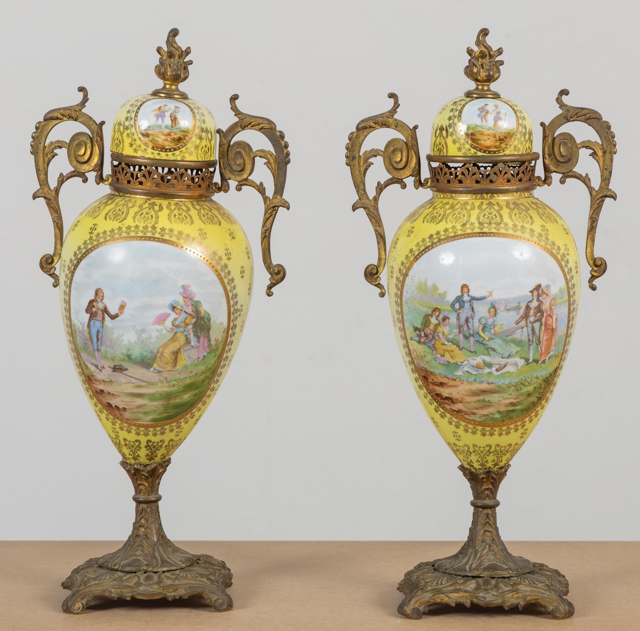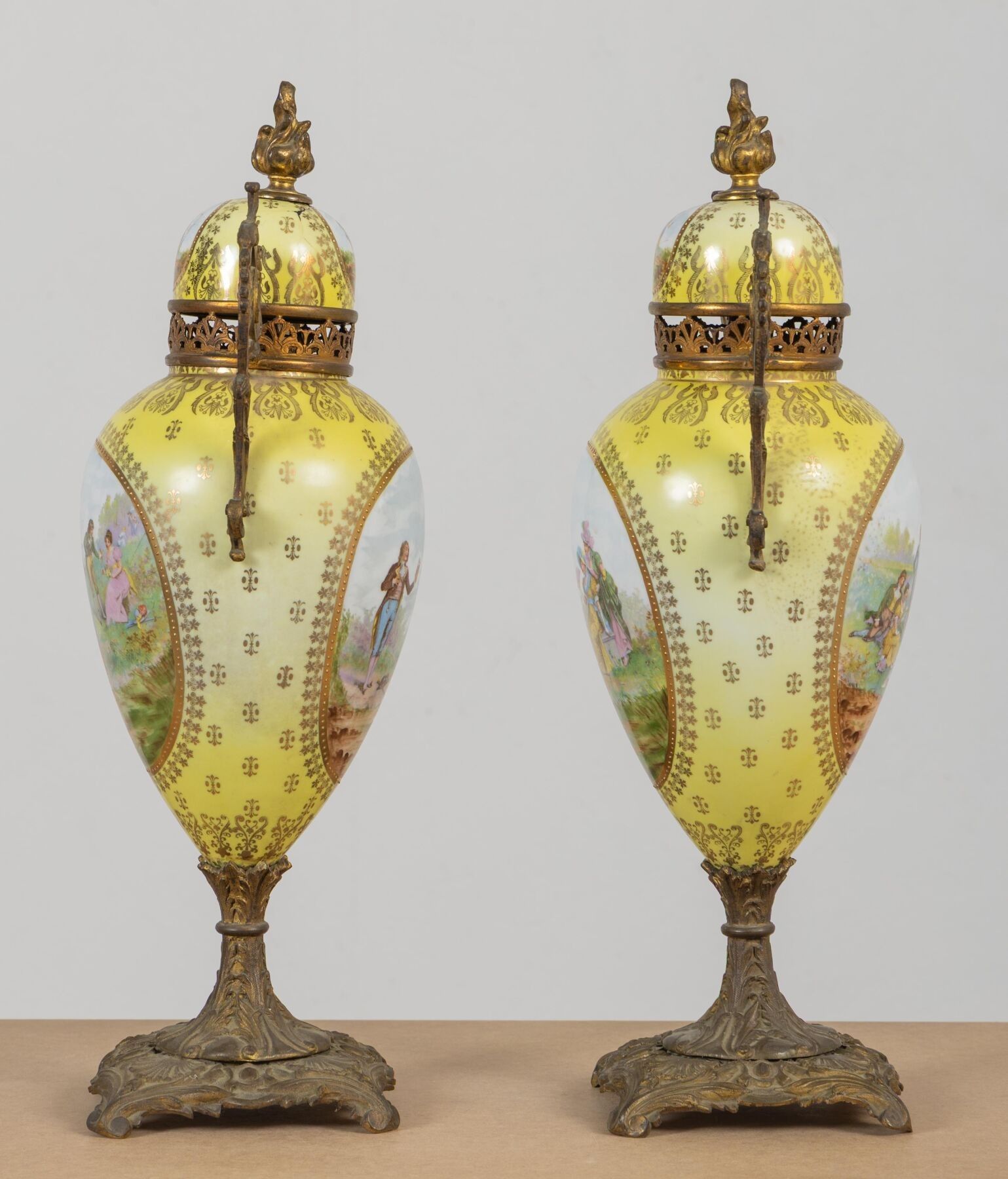 Paire de vases couverts en porcelaine à décor de scènes animées dans des médaillons.