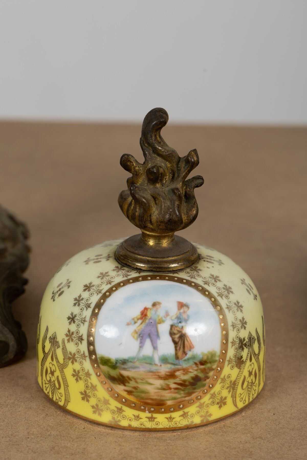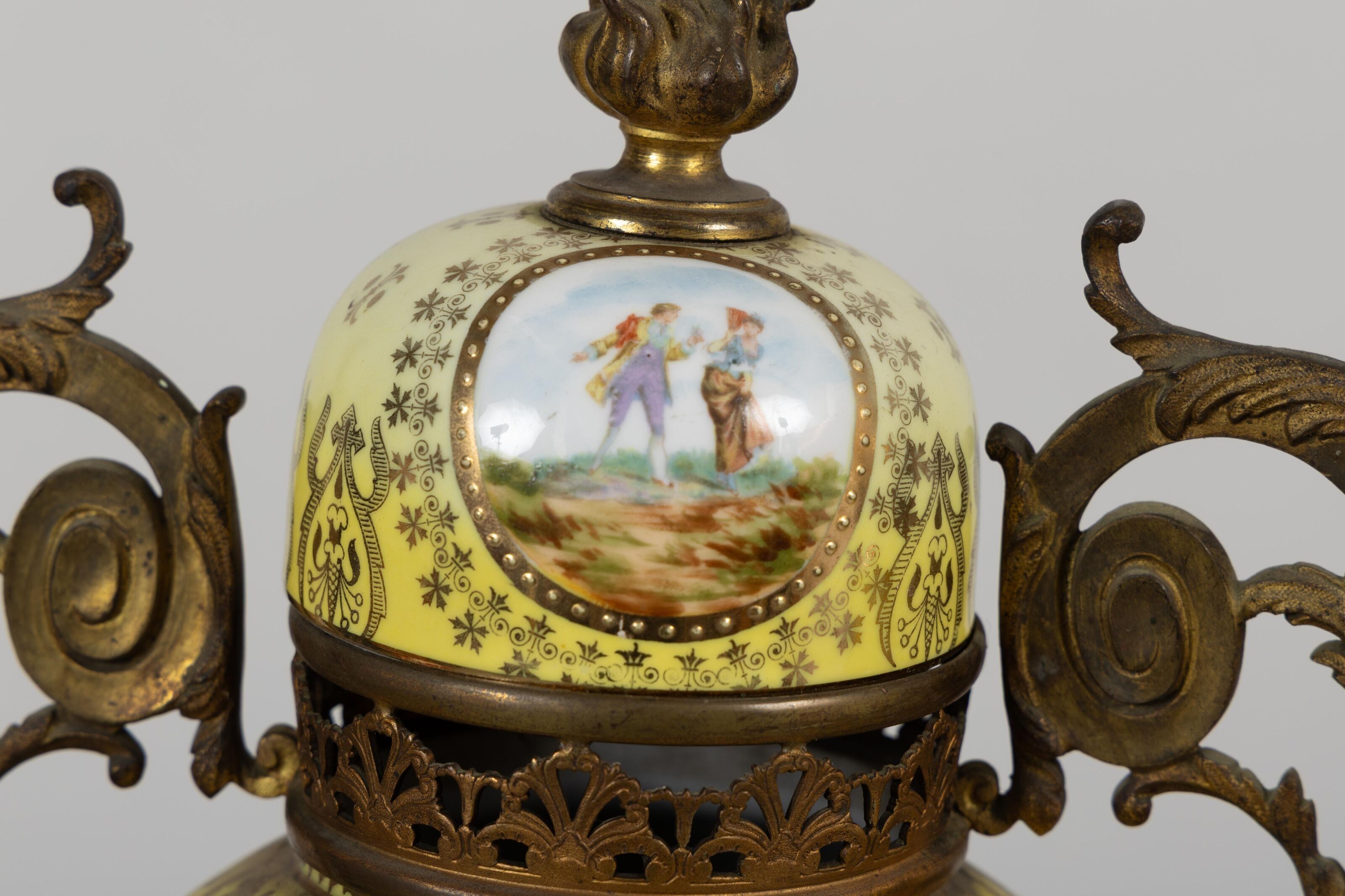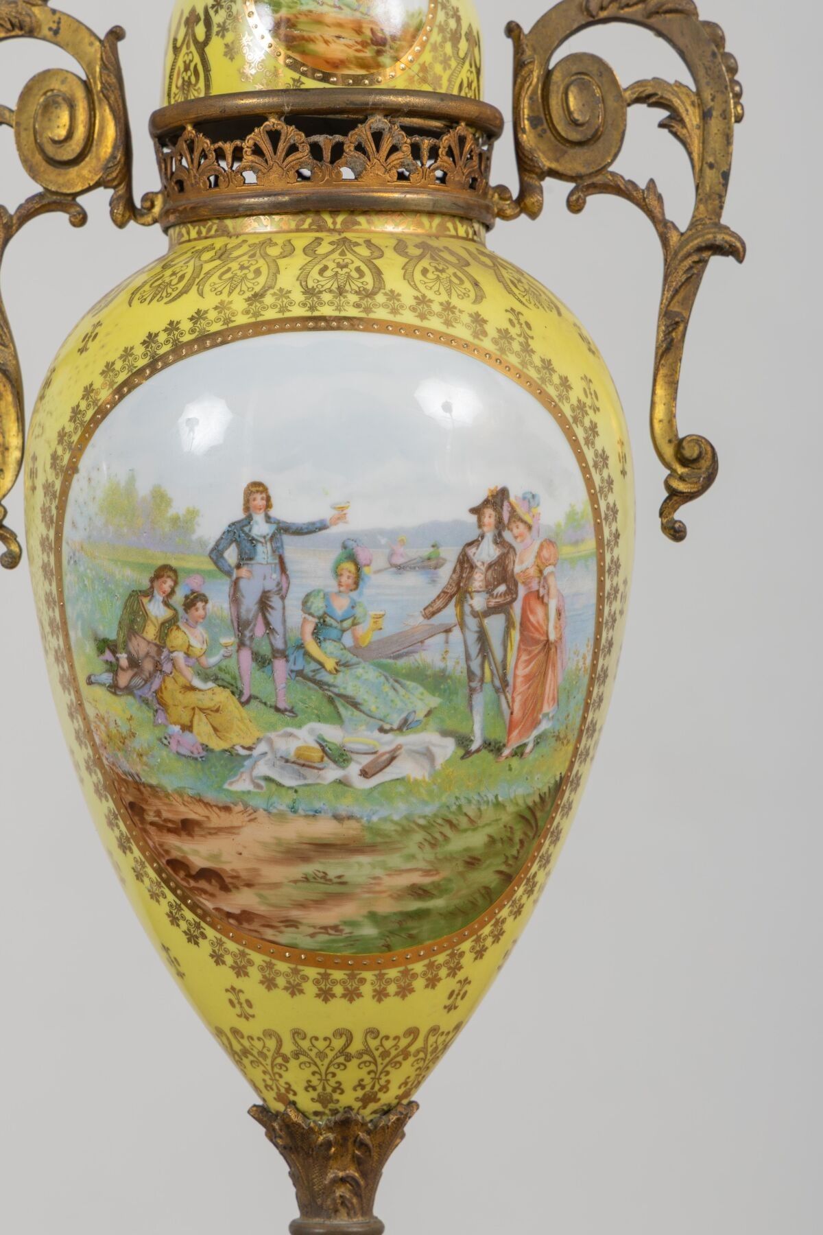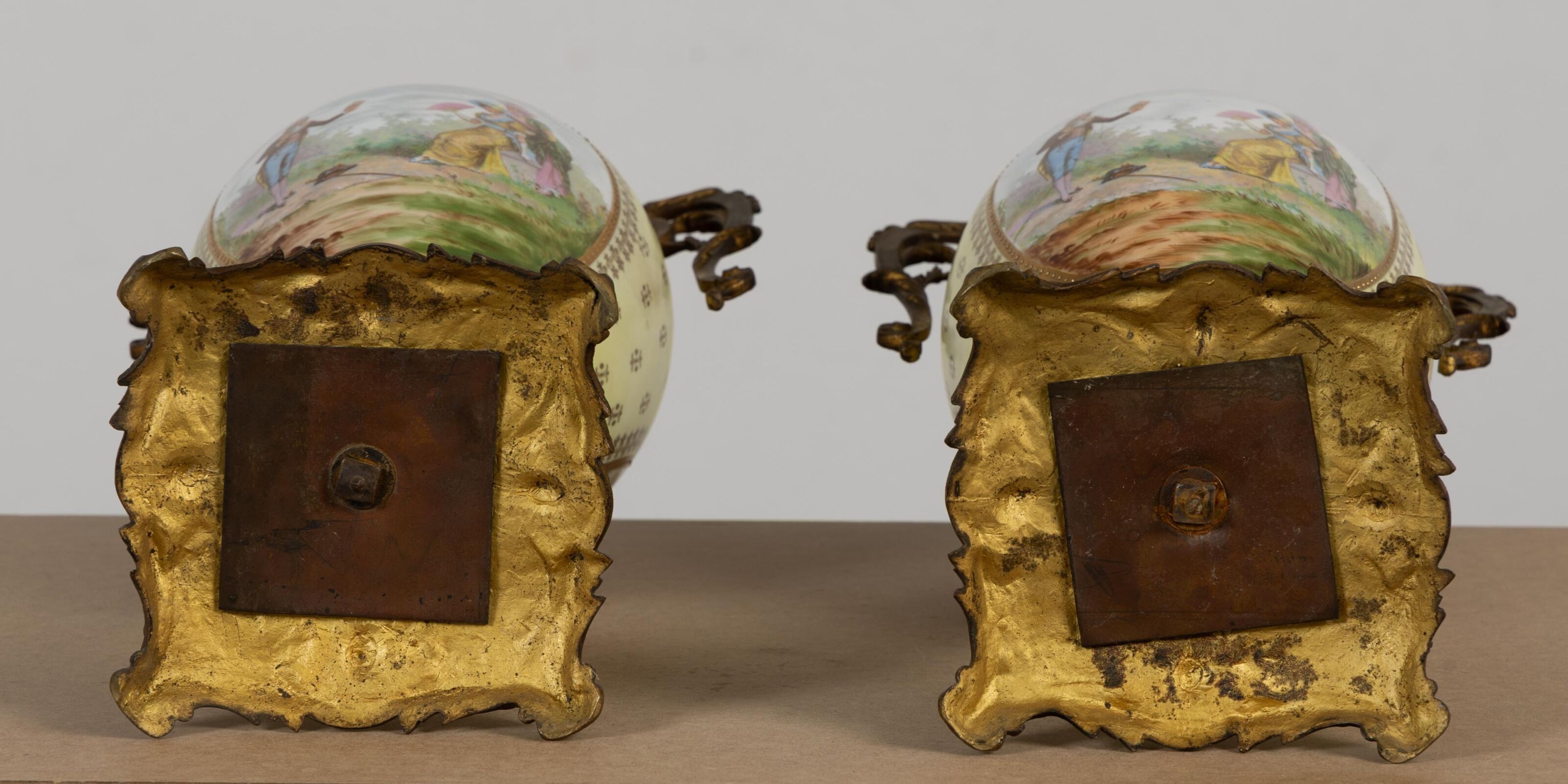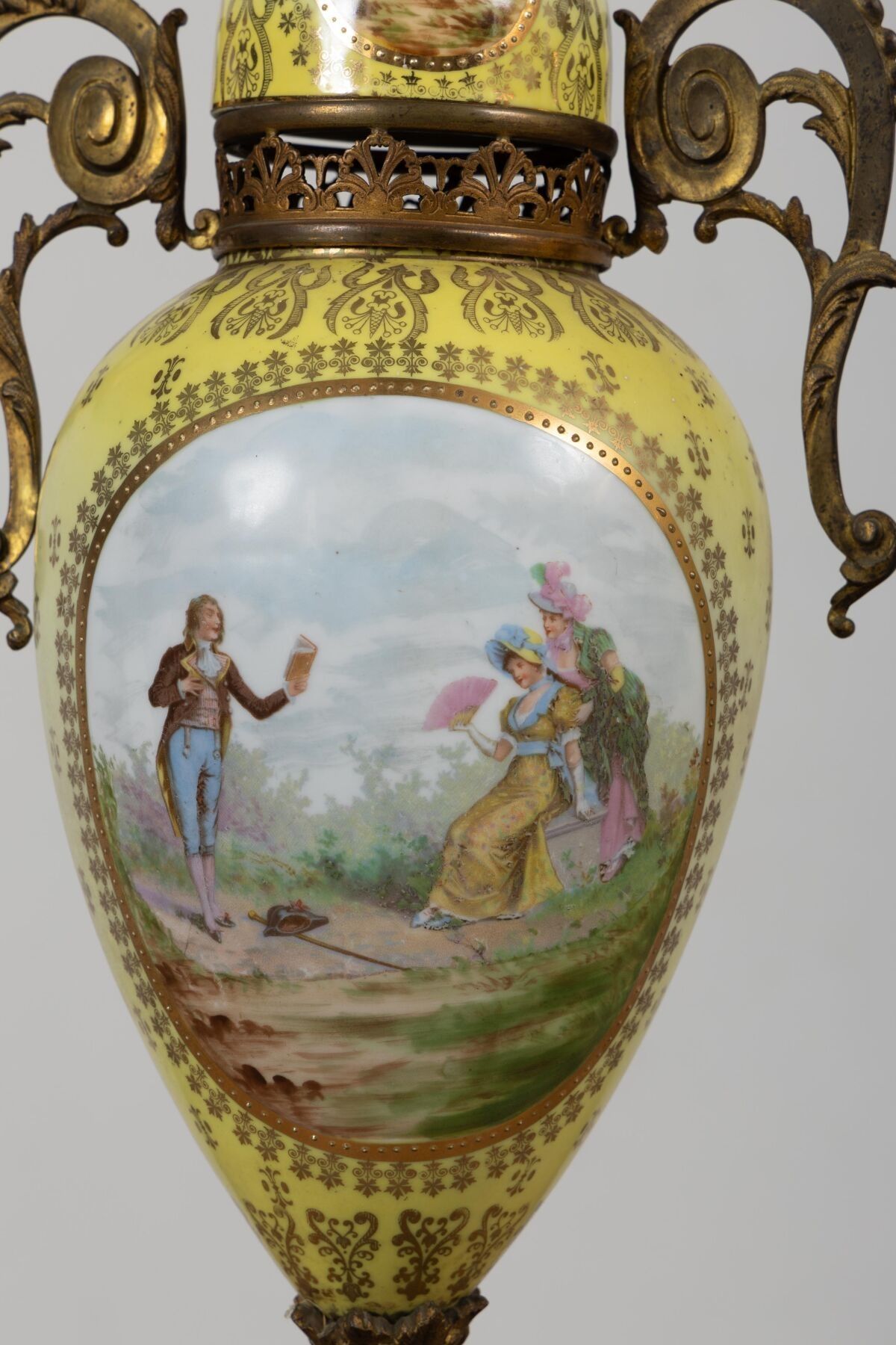 Paire de vases couverts en porcelaine à décor de scènes animées dans des médaillons.
